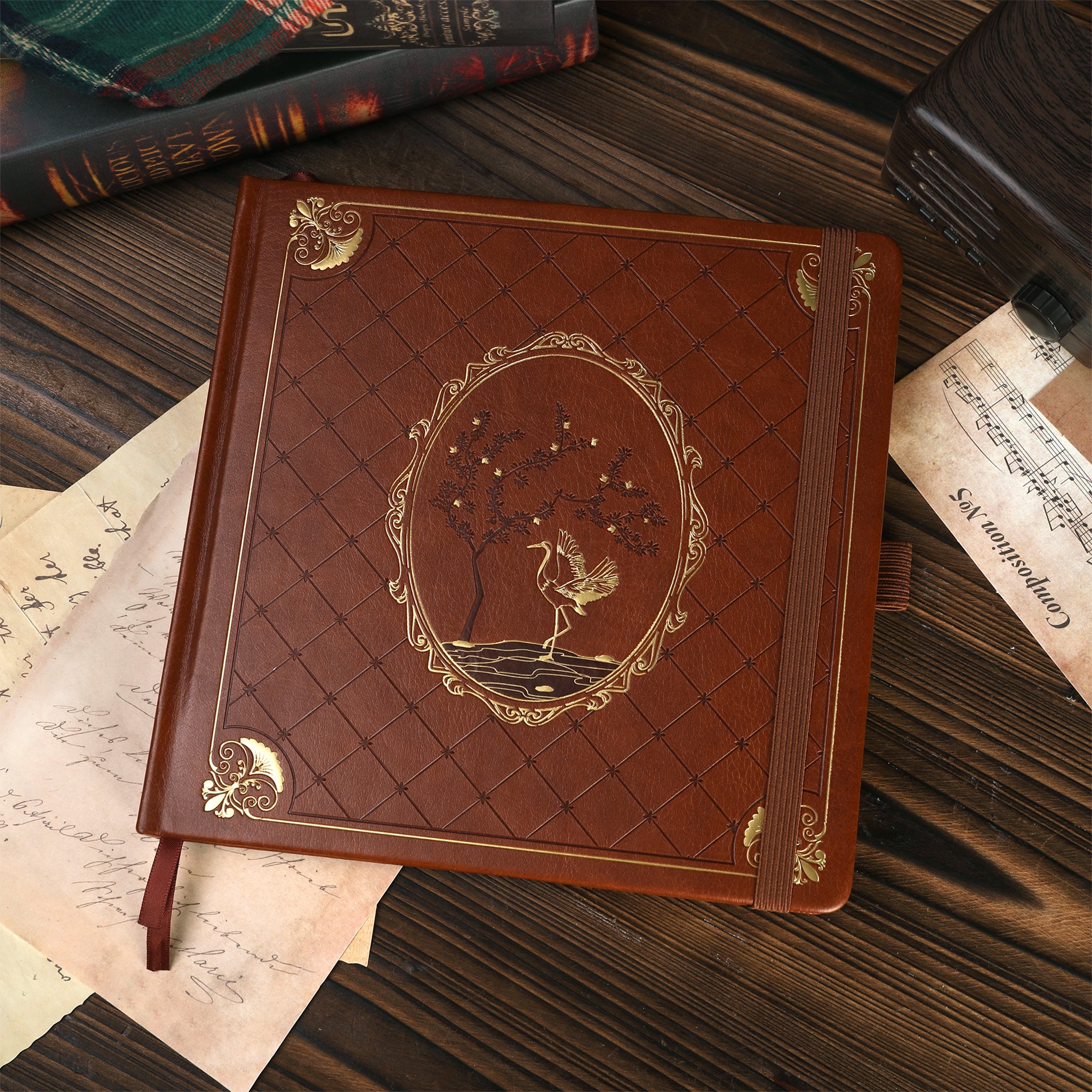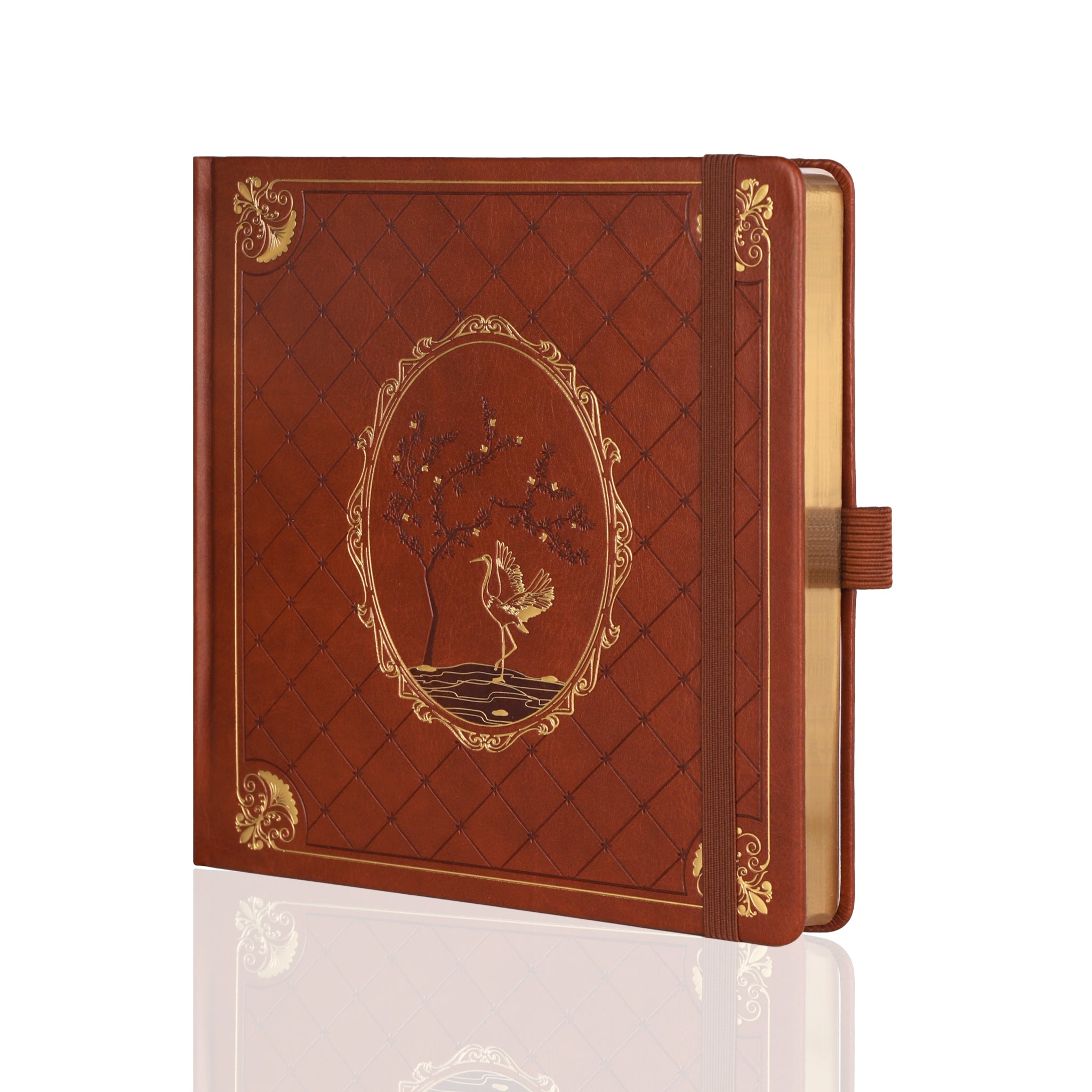 The exterior is crafted from leather or faux leather, boasting a smooth, polished texture that exudes durability and high – quality. The rich brown (tan/cognac shade) color is accentuated with gold foil details, including ornate illustrations, corner accents, and spine designs. The cover features an ornate illustration of a tree with small dotted “flowers” and a crane – like bird inside an oval frame, and some versions have a diamond – quilted texture. The corners are adorned with gold, floral/scrollwork accents, either embossed or foil – stamped.