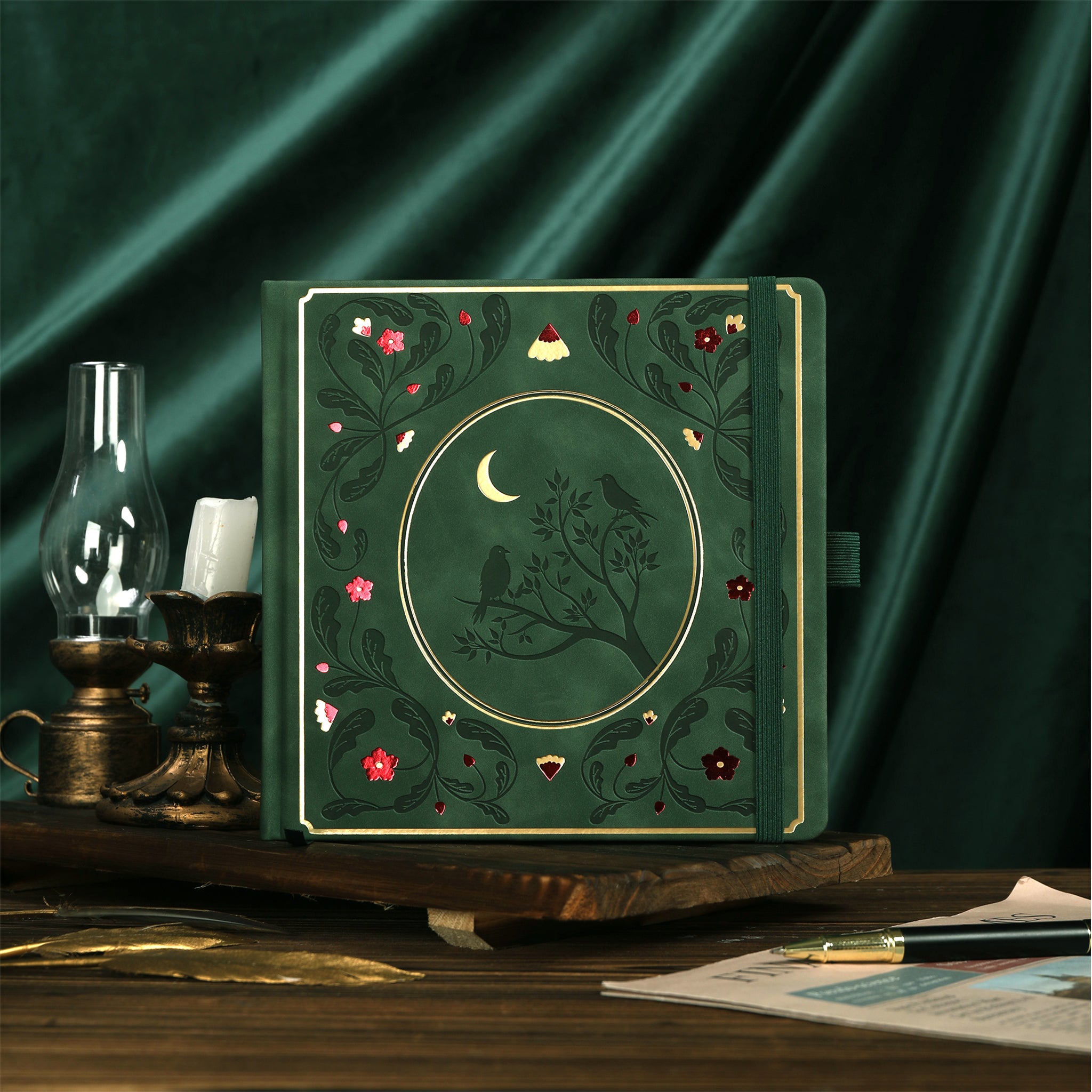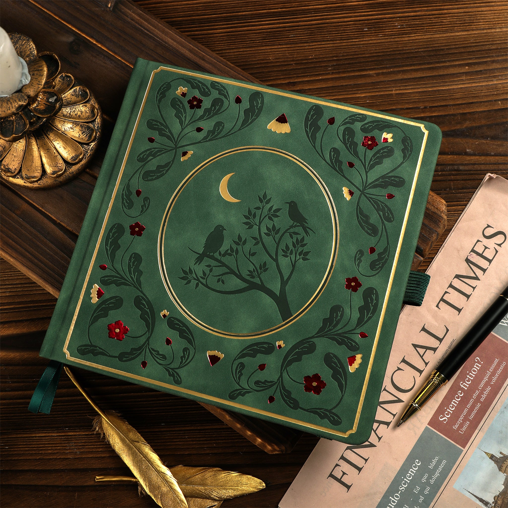 The exterior of the journal is a rich, emerald – green textured material, likely faux leather, velvet, or high – quality synthetic fabric. It features smooth, embossed details with gold accents achieved through foil stamping or metallic gilding. The front cover showcases a vintage botanical/nature theme with designs like a simple tree, two birds, and a crescent moon in the minimalist version, or an intricate floral vine surrounding a circular frame with the same tree/bird/moon motif in the detailed version. The spine is adorned with gold horizontal lines and floral/leaf motifs.