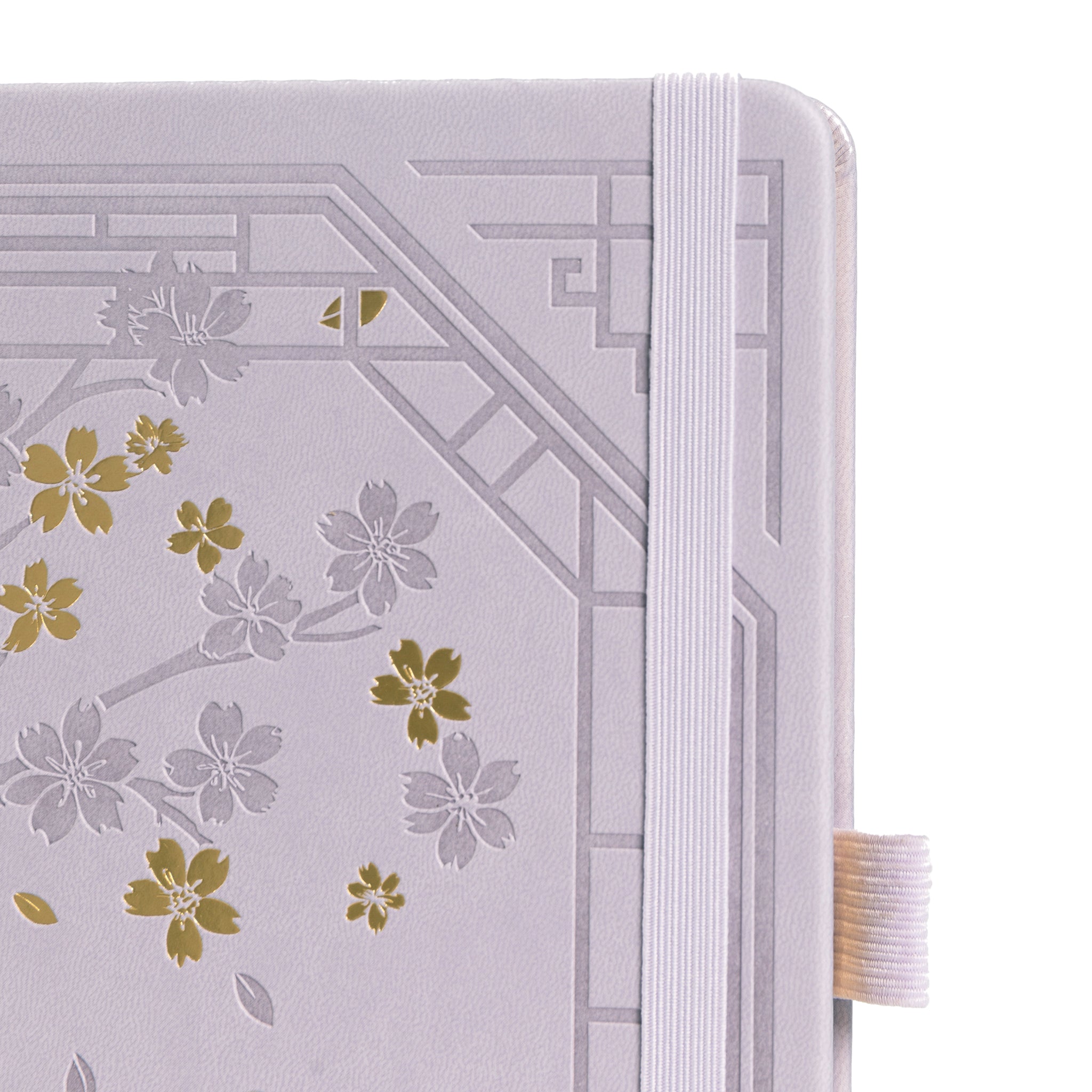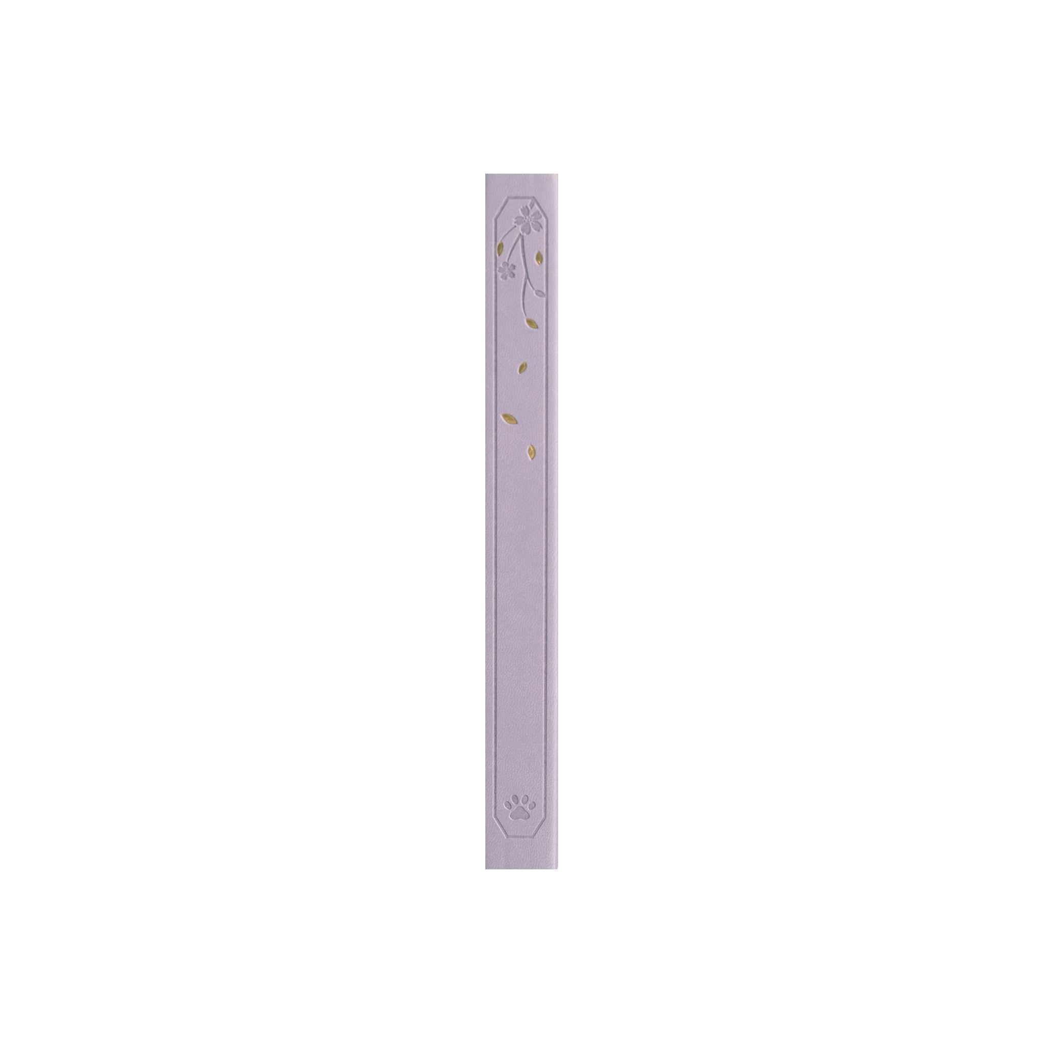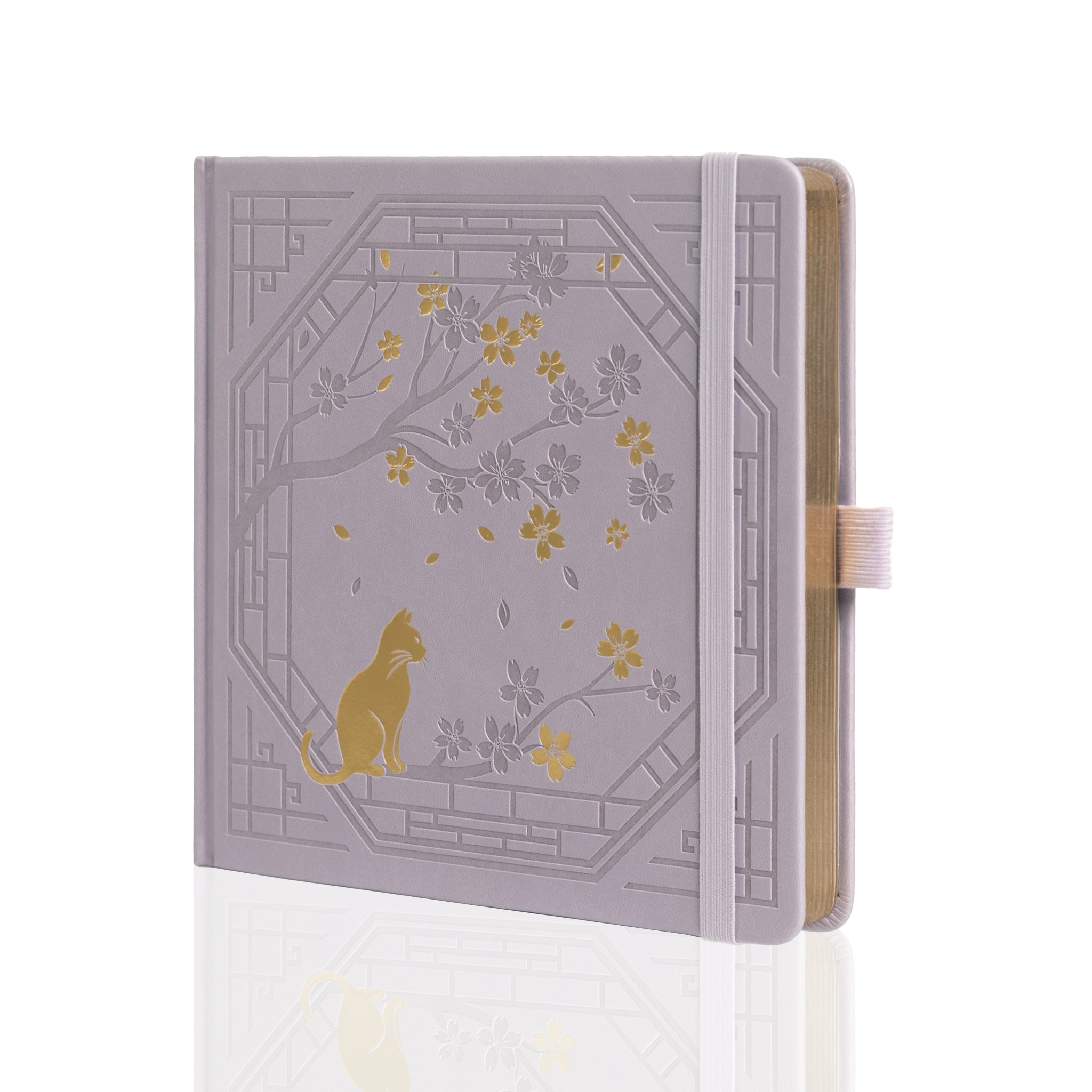 The cover of this journal is a work of art. Crafted from textured, faux leather or premium synthetic leather, it features crisp embossed patterns of a cherry blossom tree, gold foil – stamped flowers, a golden cat, and a lattice/geometric border inspired by traditional Asian architecture. The soft lavender/lilac color, consistent across the cover, spine, and accents, gives it an elegant and calming look. The spine also showcases a small floral design with gold leaves and a paw print, maintaining the decorative theme.
