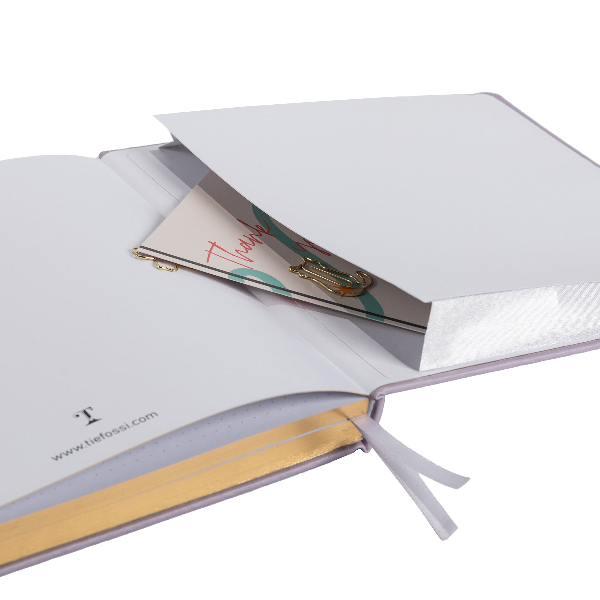 Opening the journal, you’ll find an interior front cover with a repeating gold “T” monogram (possibly the brand logo) and small gold specks for texture. The brand “Tiefossi” is visible here, along with the website “www.tiefossi.com”. The “THIS BOOK BELONGS TO” page, set against a clean white background, has a circular text arc with three lines for personalization, adding a unique touch.
