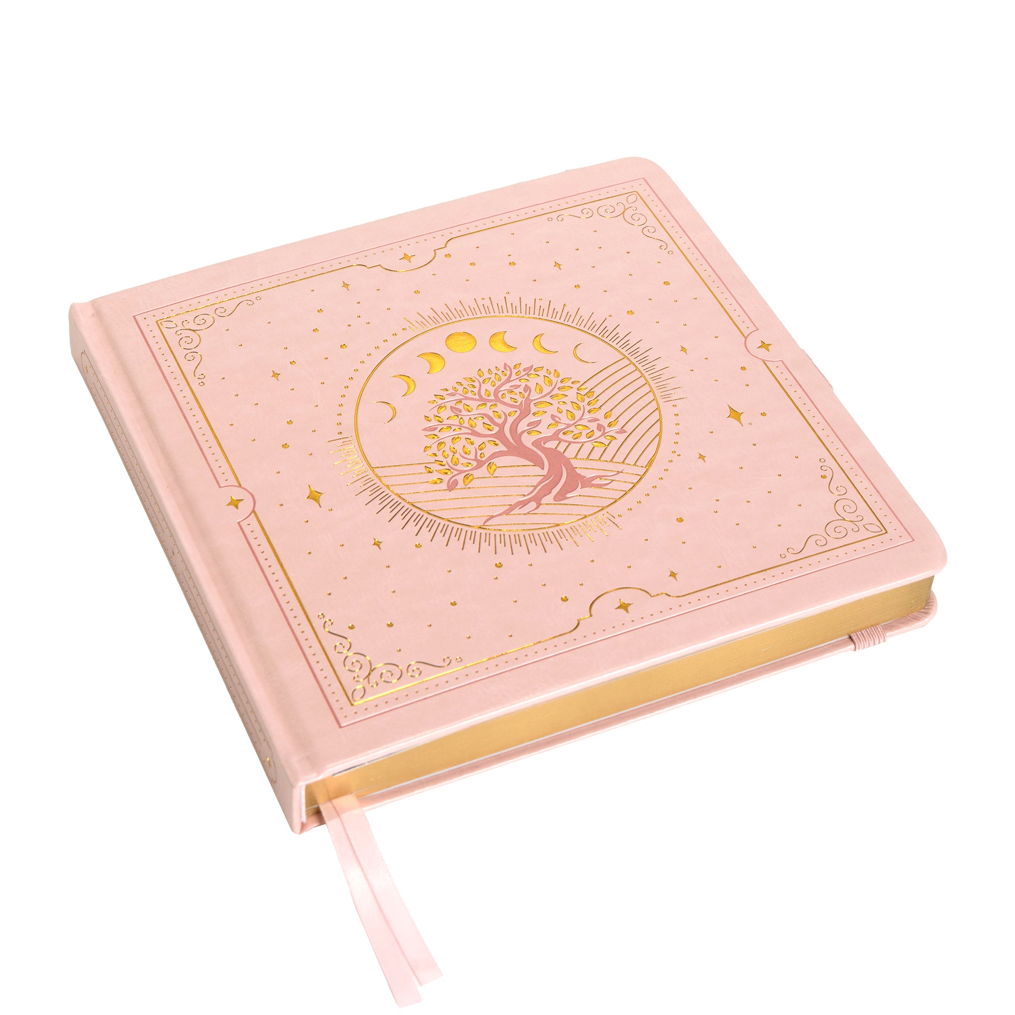 | Decorative Elements | Gold foil stamping of tree of life, moon phases, stars; gold decorative frame with pink inner lines, corner swirls and star accents |