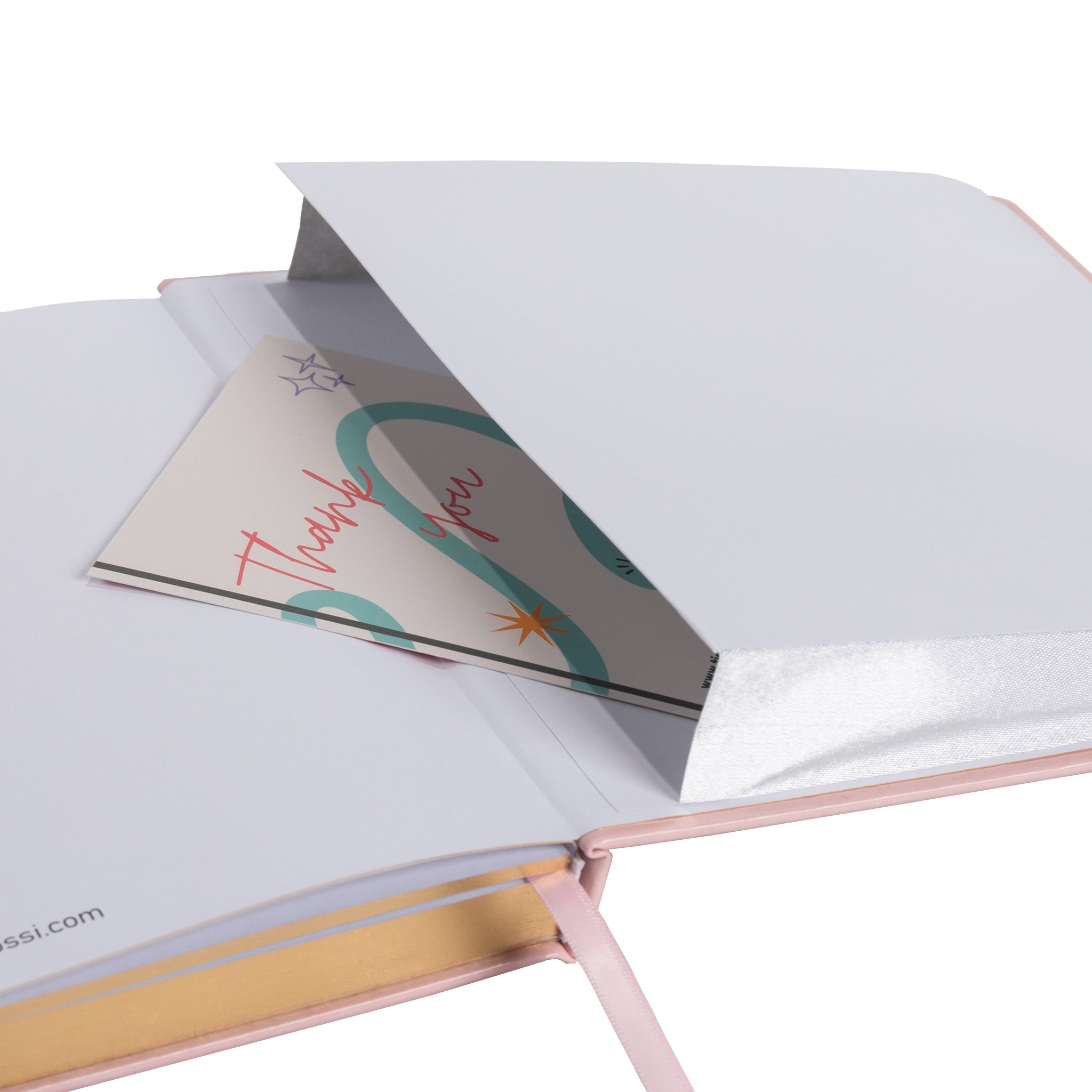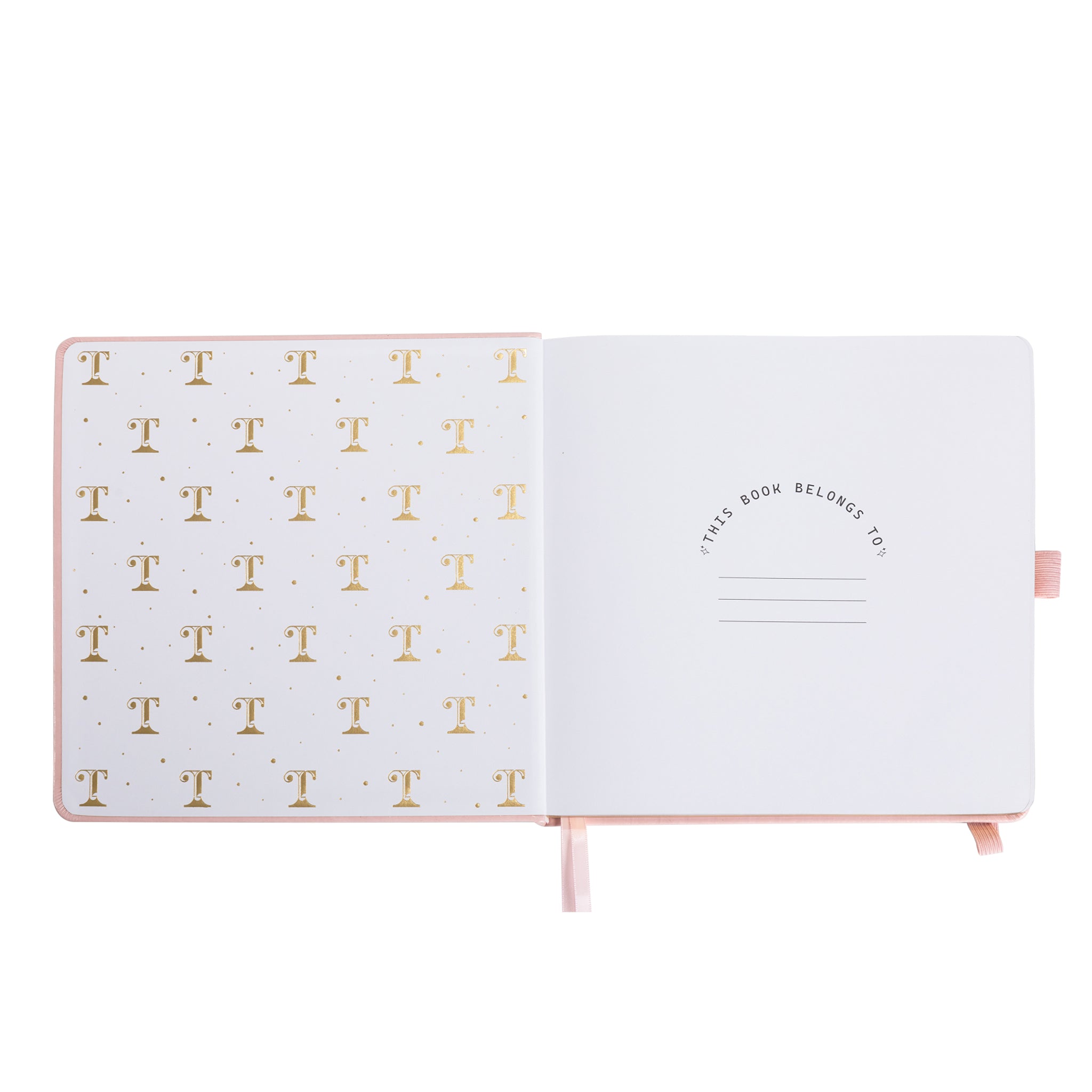 Inside, the notebook has white, thick paper with a dotted grid pattern. The top edge of the pages is gilded with gold foil, giving it a luxurious finish. The inside front cover comes with a small pocket, perfect for storing notes or cards, and there’s also a “Thank you” card in teal and pink. The endpapers showcase gold foil “T” monograms and dotted patterns.