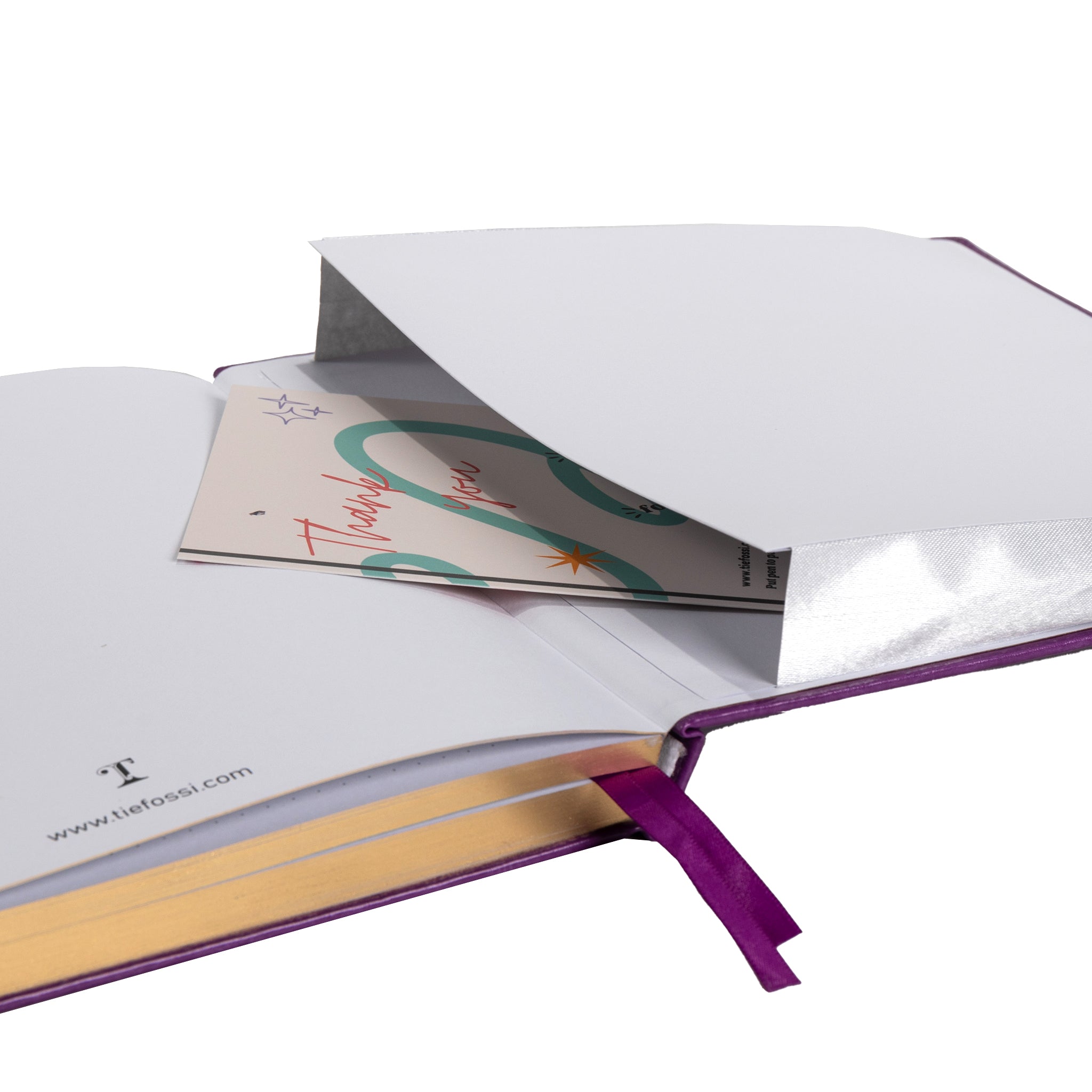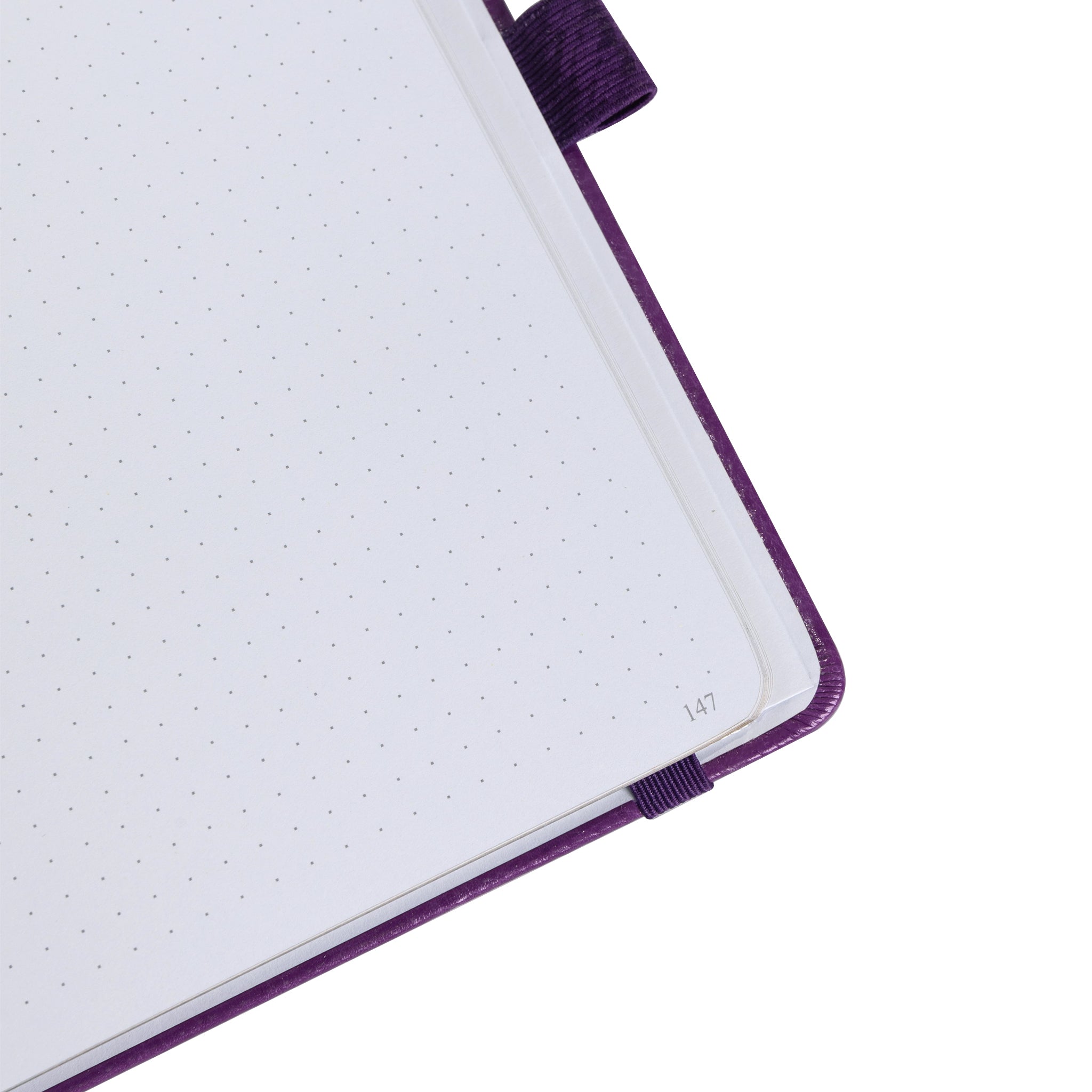 Inside, the journal has white dotted grid paper, which is versatile for journaling, sketching, or bullet journaling. The pages are thick and well – bound with a sturdy sewn binding for long – term use. There’s a purple satin or fabric ribbon bookmark for easy page – marking and a purple elastic or fabric strap to secure the notebook when closed.