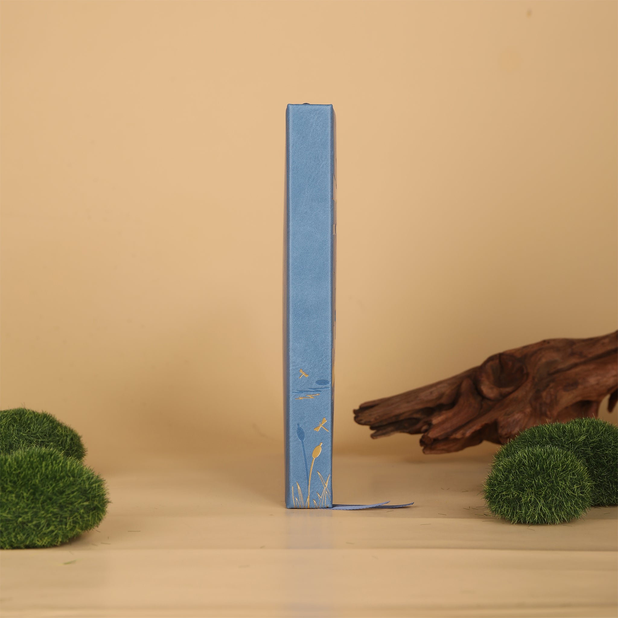 The cover of this notebook is crafted from faux leather (likely PU leather), boasting a smooth, embossed texture that exudes durability and an upscale appearance. The soft blue color, reminiscent of a clear sky, is complemented by intricate gold foil landscape designs. On the front cover, you’ll find a mesmerizing scene of birds in flight, a sun or moon, water reflections, reeds, dragonflies, and distant hills. The spine features a smaller gold version of this landscape, maintaining a consistent and visually appealing design.