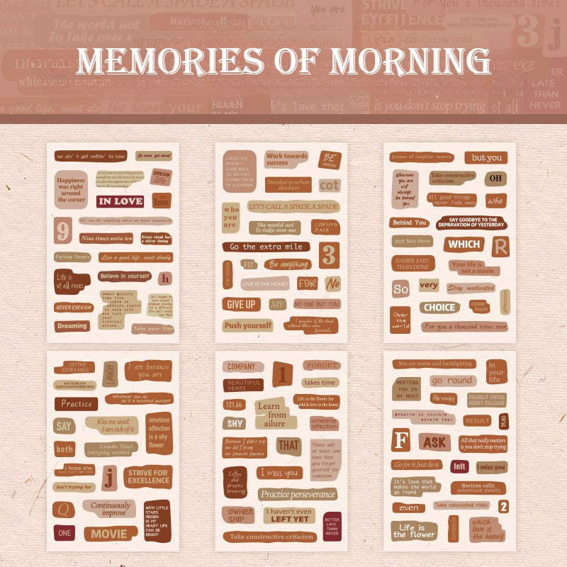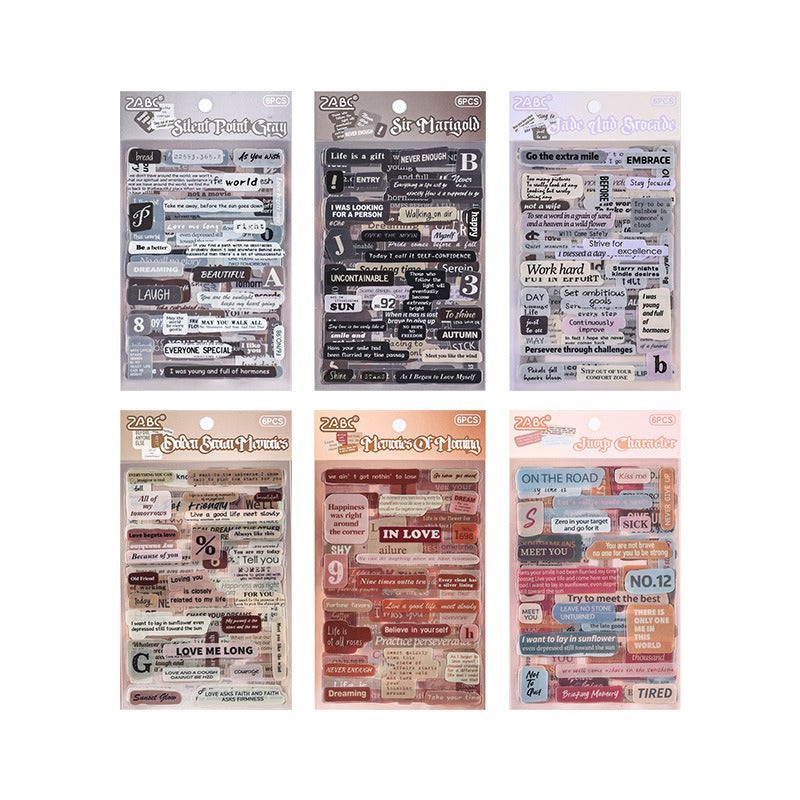 | Aesthetic | Vintage – inspired typography, irregular/rectangular sticker shapes, mix of fonts and decorative accents |