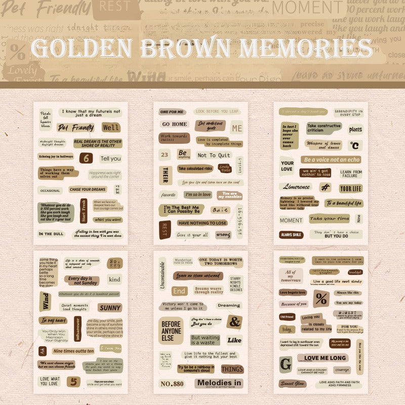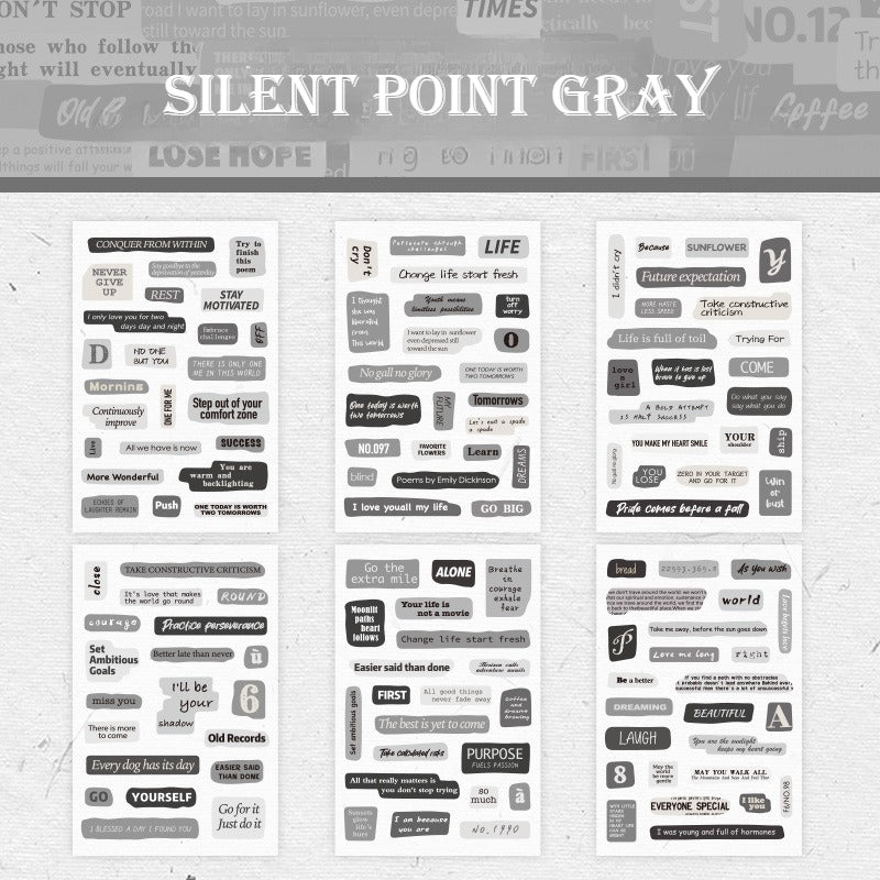 This sticker pack comes with multiple color palettes and themed sets. The themes include “Silent Point Gray” with a monochrome gray aesthetic, “Sir Marigold” featuring black, gold, and white tones, “Memories of Morning” with warm brown/sepia tones, “Golden Brown Memories”, “Jade and Brocade”, “Jump Character”, and “Take it all 6 packs”. Each theme has a unique aesthetic with vintage – inspired typography, irregular/rectangular sticker shapes, and a mix of handwritten/cursive fonts, bold sans – serif, and decorative accents like numbers, letters, and symbols.