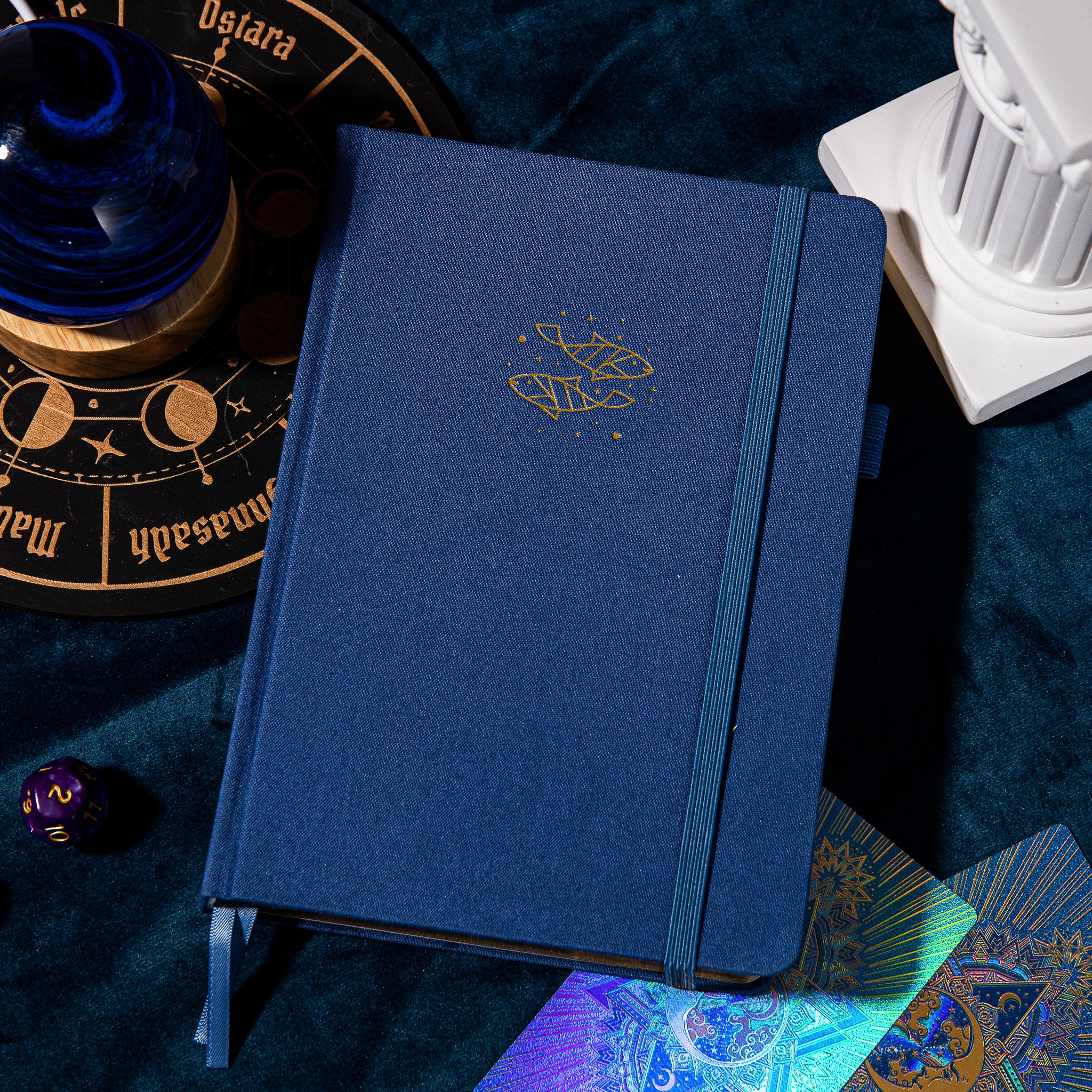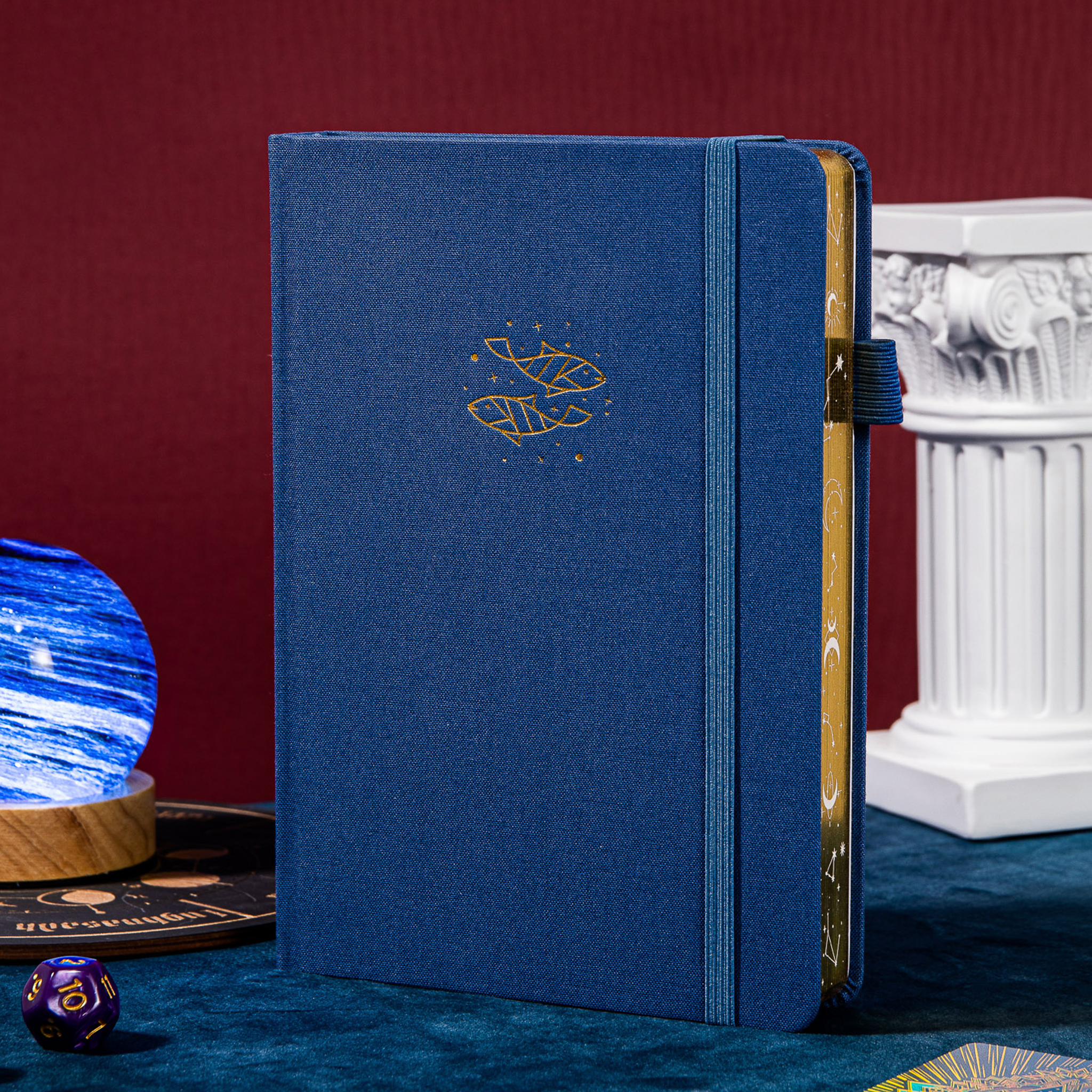 | Design Elements | Gold foil embossed Pisces symbol on front cover, gold foil with white celestial motifs on spine/top edge, dotted grid interior pages, decorative divider pages |