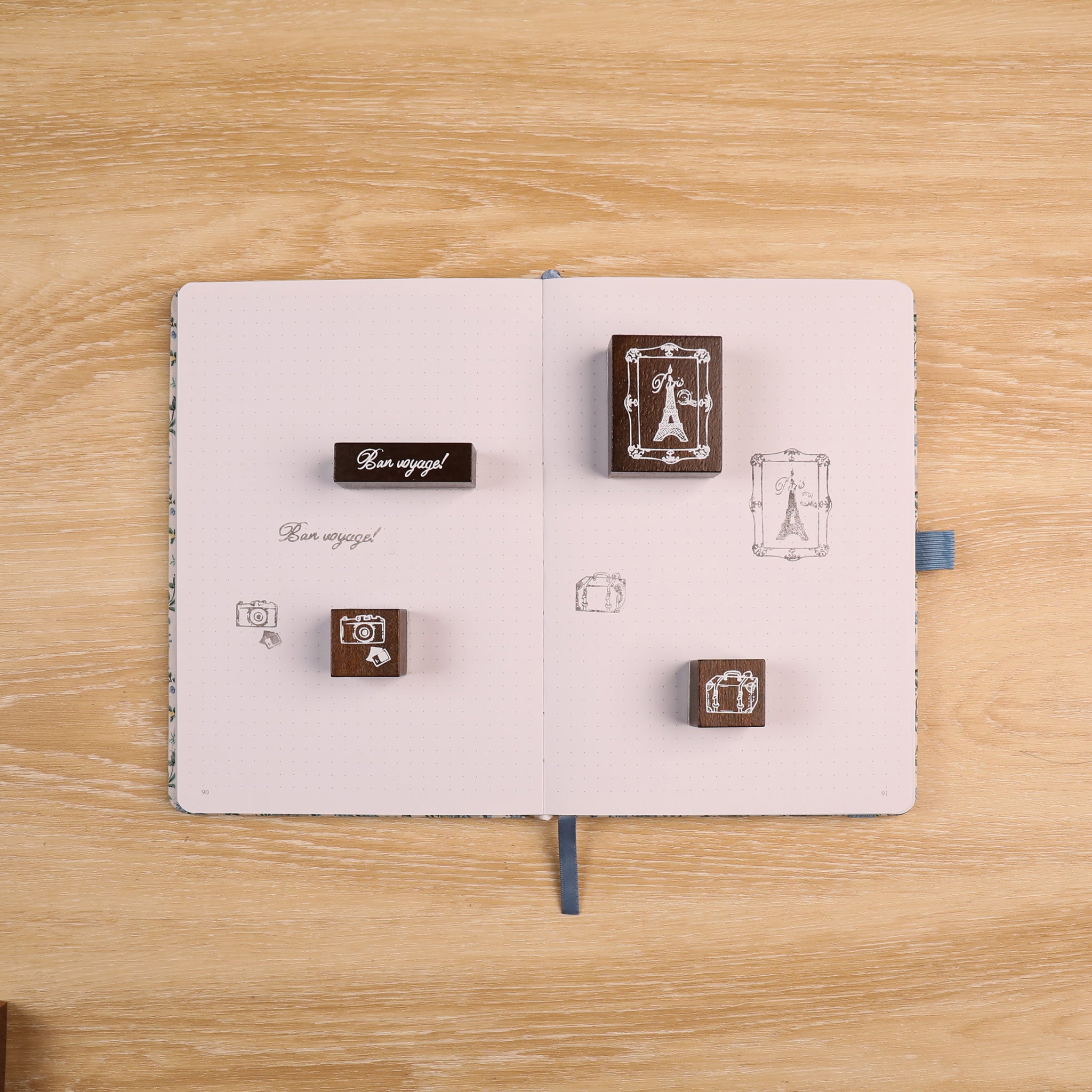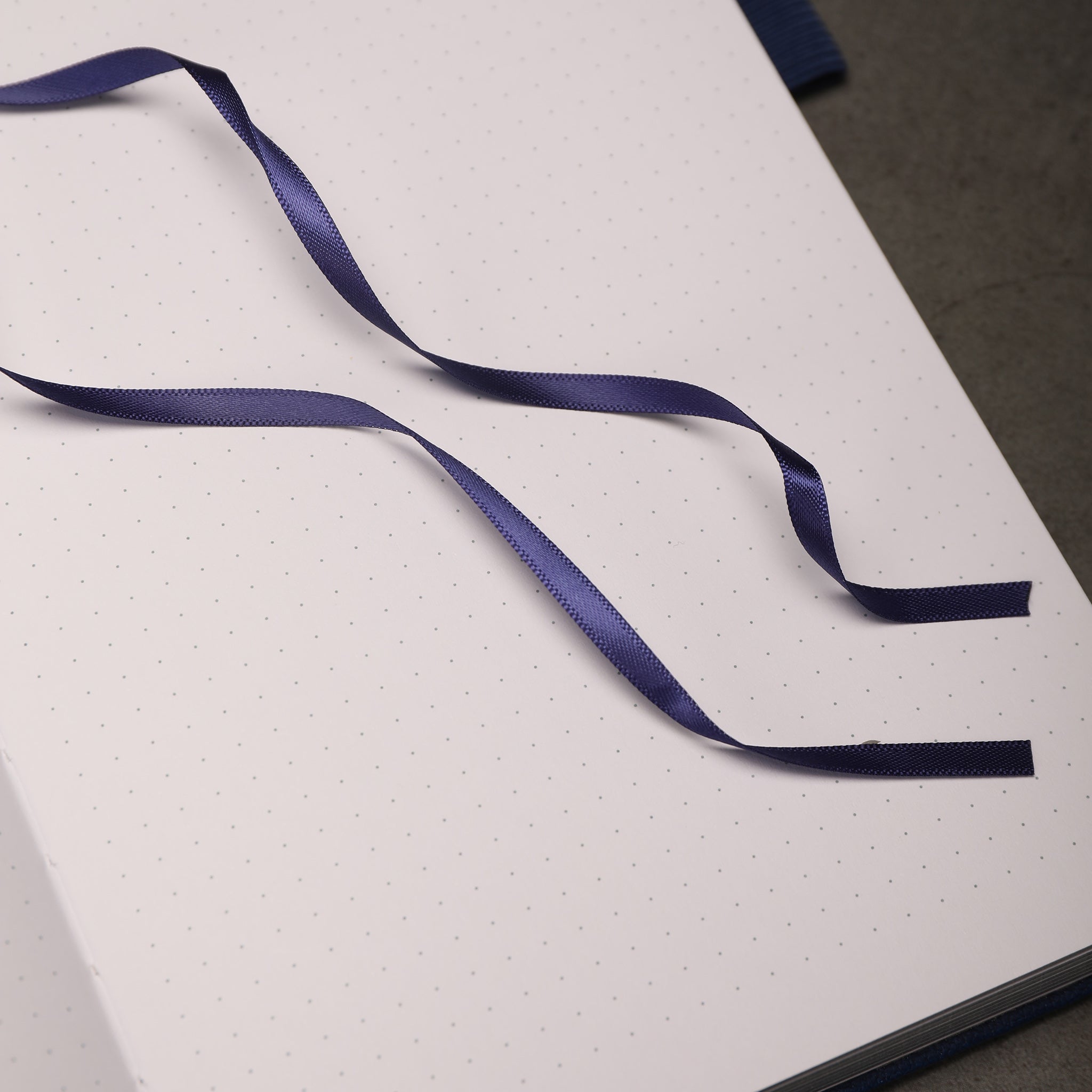 Accents Blue ribbon bookmark, gold/white trim on pen loop (if present), minimalist dotted page design