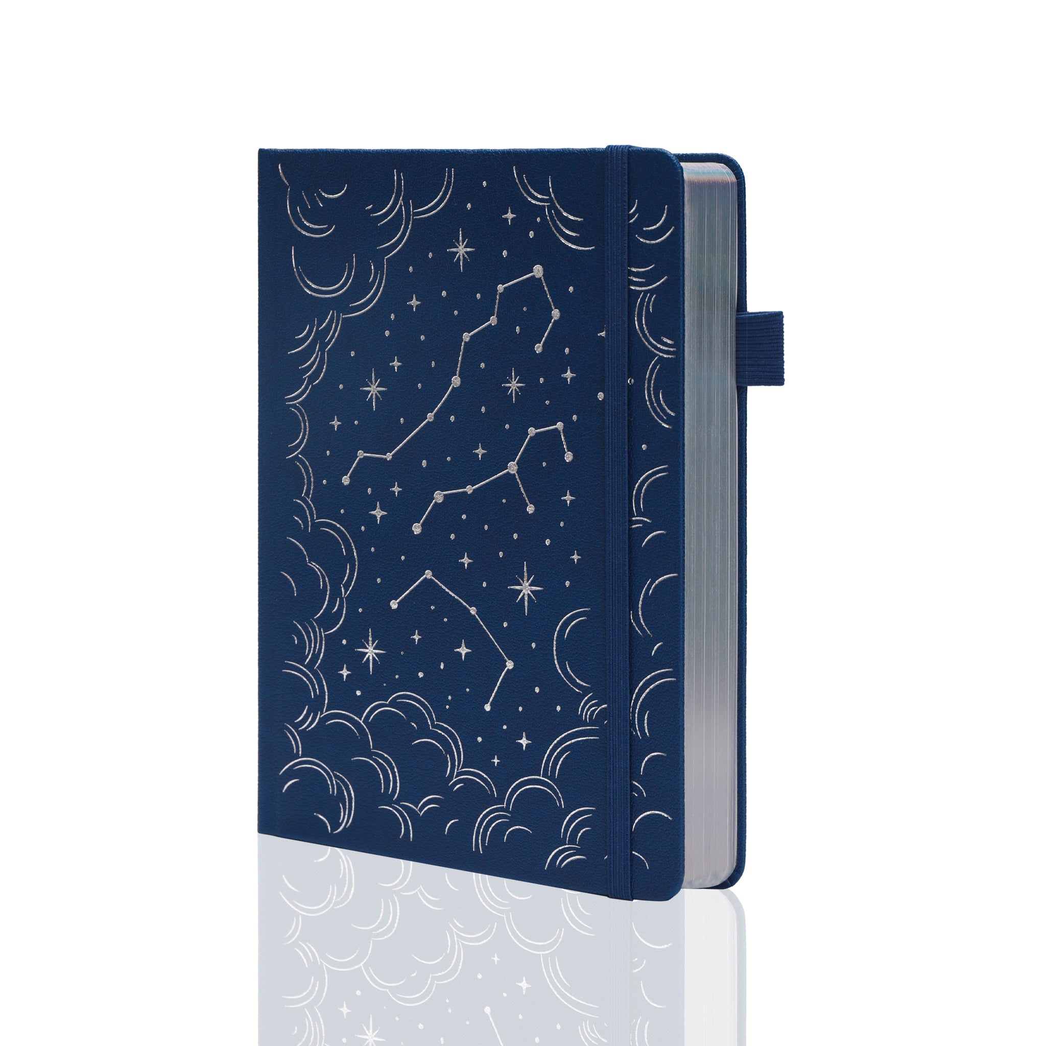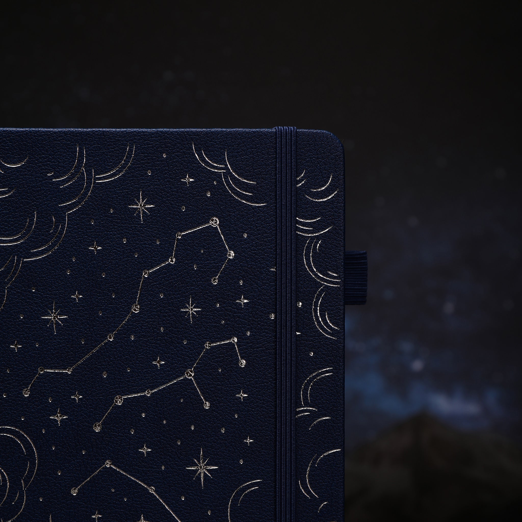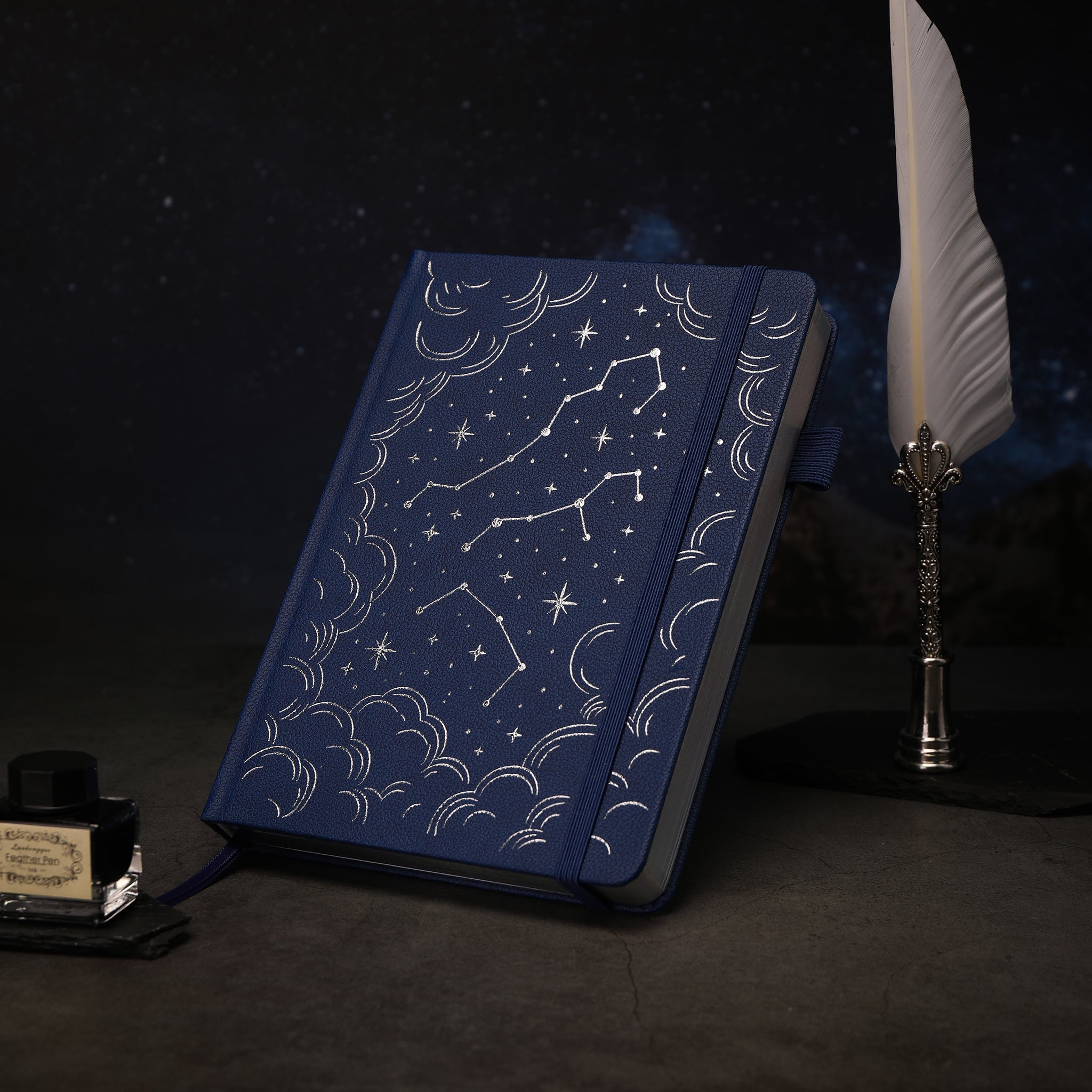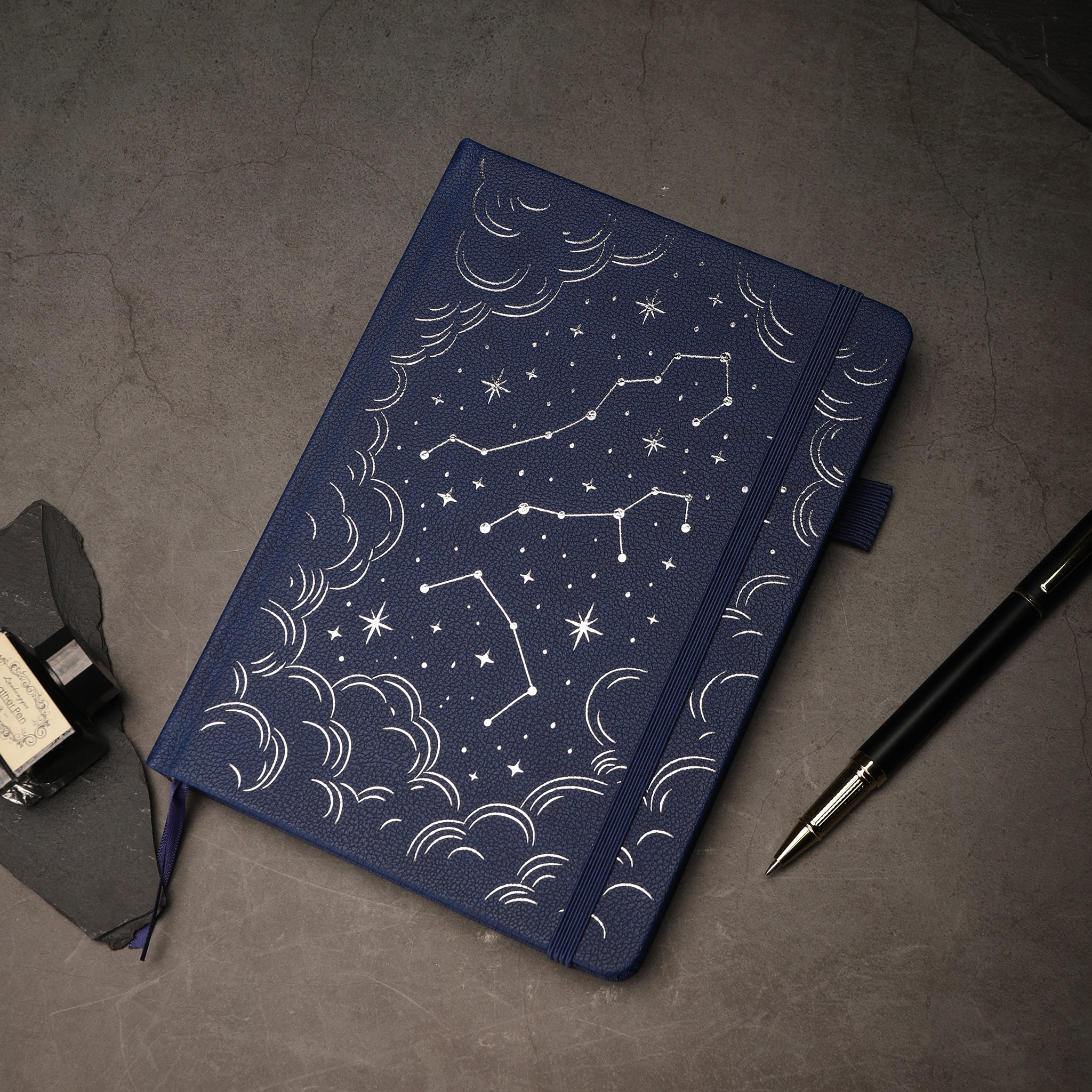 The cover of this notebook is a masterpiece in itself. Crafted from a textured, durable material, likely faux leather or high – quality hardcover fabric, it features embossed white/silver celestial patterns. Constellations like Orion’s Belt and Ursa Major, stars of various sizes, and crescent moons adorn the deep navy – blue cover, creating a rich and elegant base that evokes the magic of the night sky. The gold/white trim on the pen loop (if present) adds a touch of sophistication.