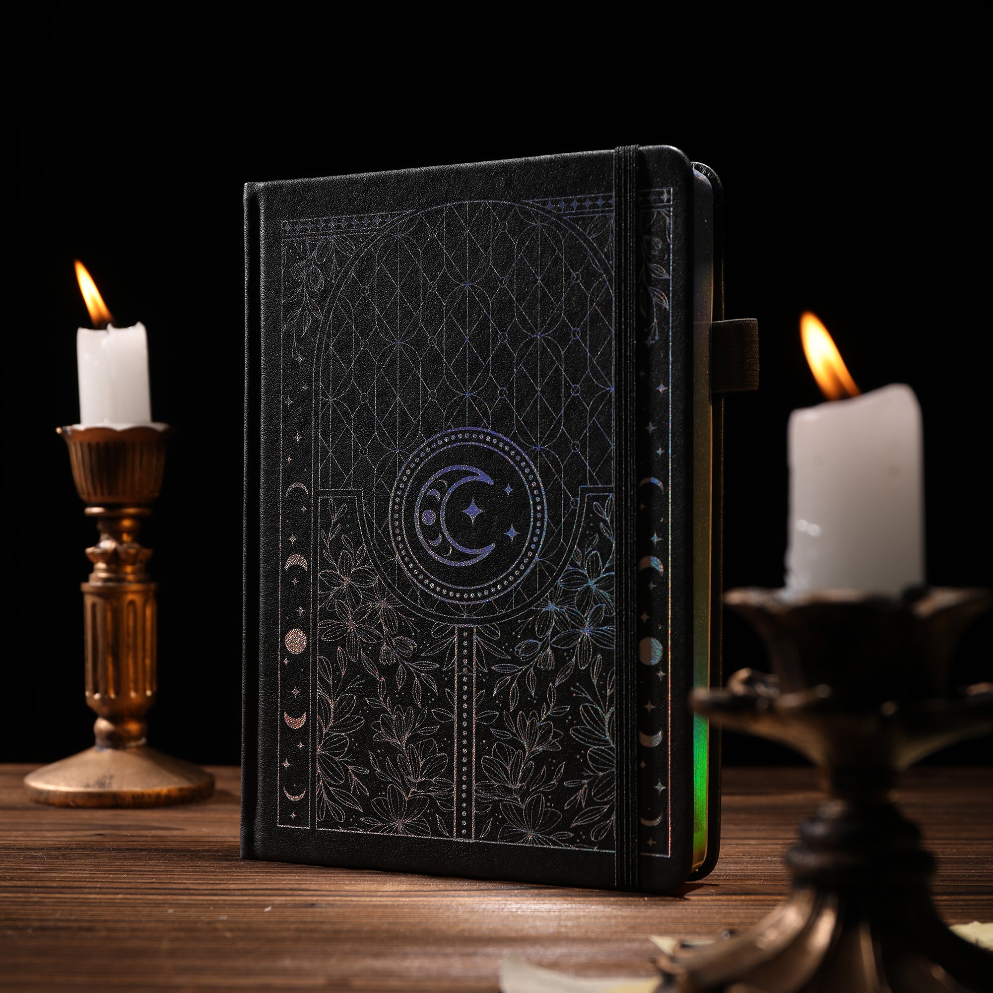 Notebook Color & Design Muted sage – green hardcover with gold foil lettering (“FOLLOW YOUR DREAMS”), floral motifs, stars, and all – seeing eye symbol