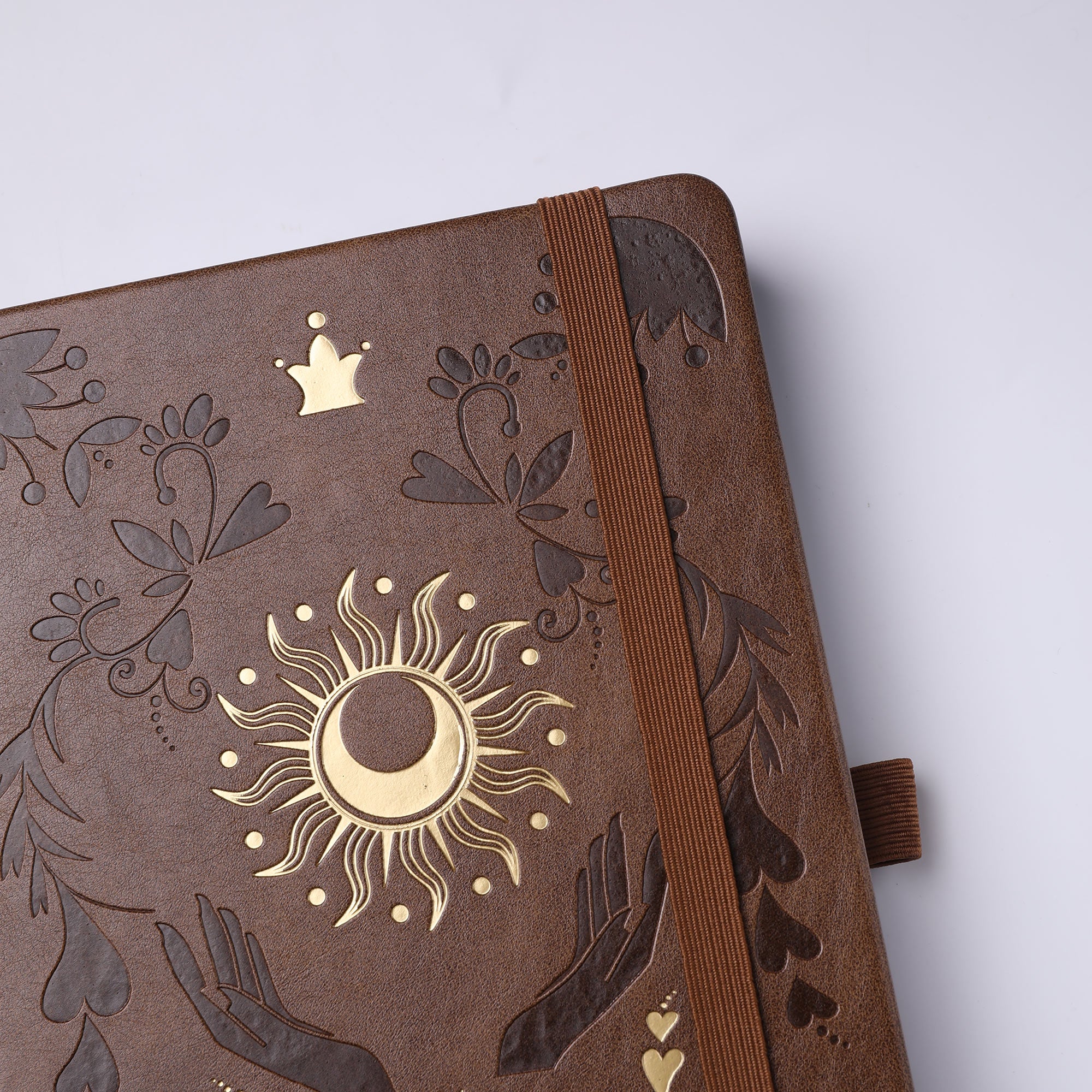 | Cover Art | Intricate, mystical motifs including a central gold sun with a moon in the middle, two raised hands, floral patterns, heart shapes, and small golden crown details |