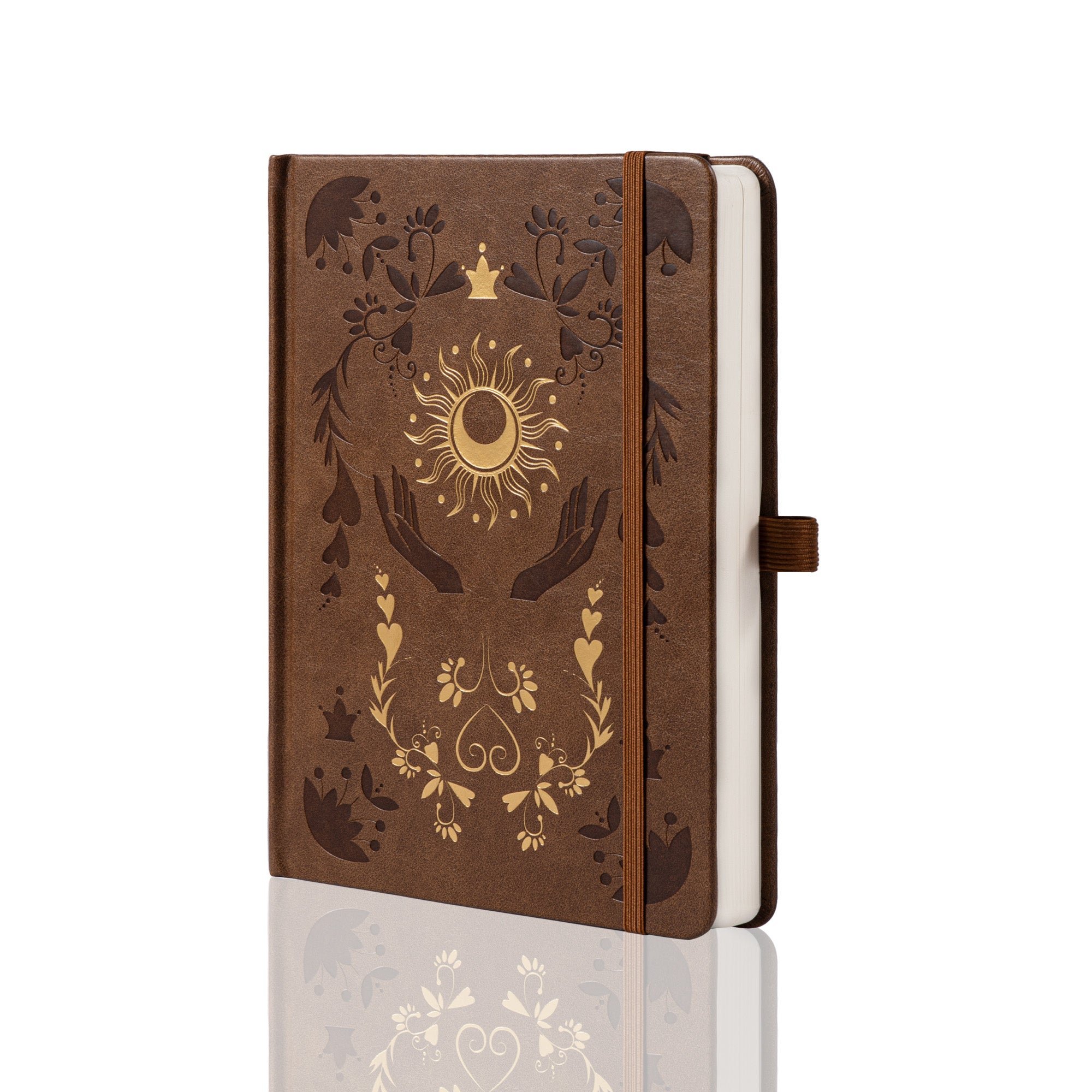 | Color | Warm brown (cover, ribbon, strap), white (pages), gold (embossed/decorative elements), black (cut – out/embossed accents) |