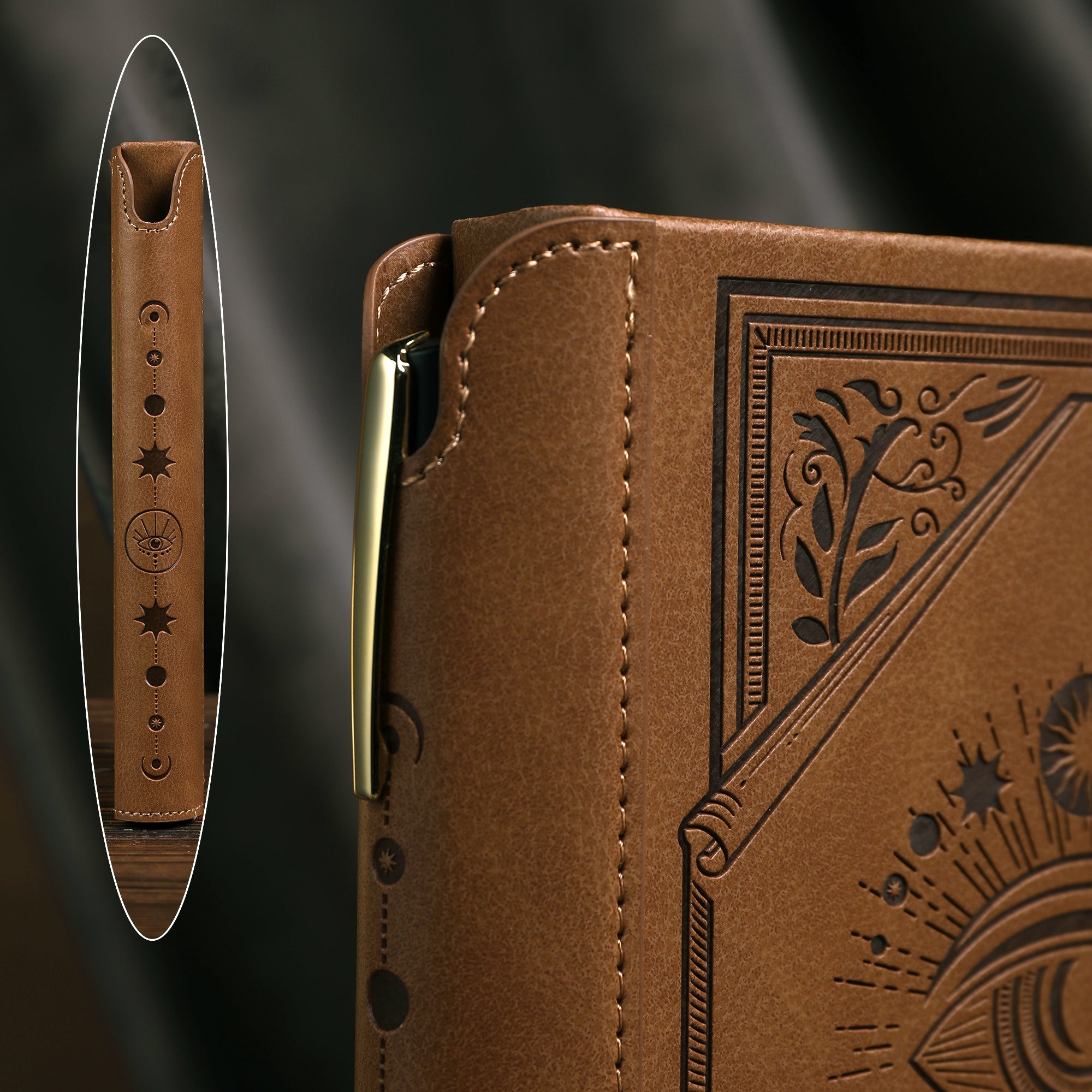 The cover of the notebook is crafted from faux leather, offering a smooth, synthetic leather finish. The precise stitching along the edges not only adds to its durability but also gives it a premium look. The primary color of the cover is a rich tan/brown, adorned with darker embossed or debossed designs. There are also dark blue and purple variants available, featuring gold accents like starbursts around the all – seeing eye, the central design of the cover.