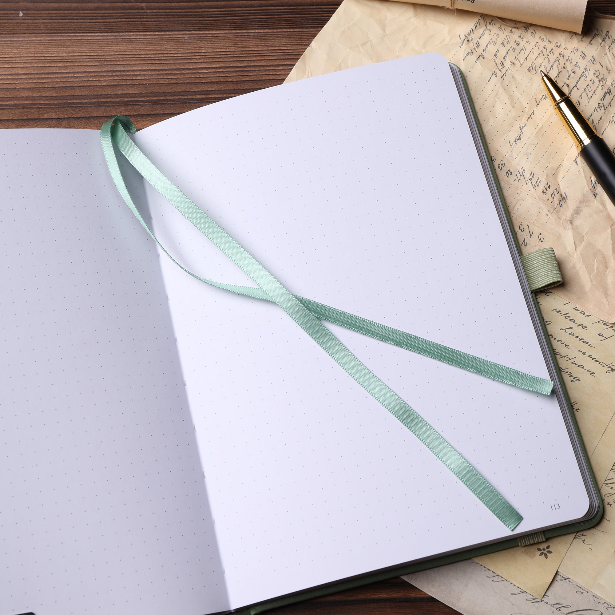 It comes with light green satin or fabric ribbon markers for easy page indexing. The binding is sturdy, either glued or sewn, ensuring clean and aligned pages with no visible gaps. The notebook is approximately A5 dimensions (5.8” x 8.3”), making it a convenient size to carry in bags or pockets.