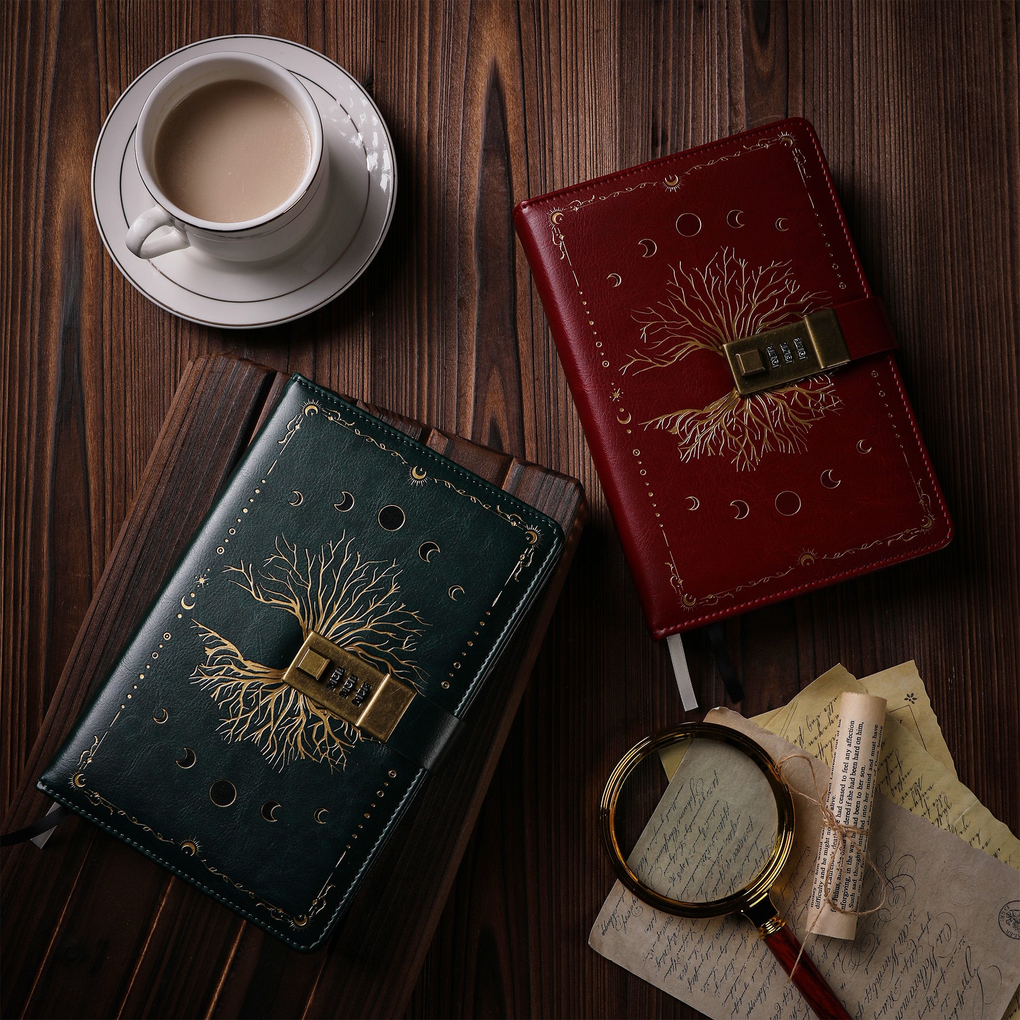 The cover of this journal is crafted from textured faux or genuine leather with an embossed finish in a rich dark green color. It features intricate golden tree – of – life artwork, surrounding moon cycle symbols, and ornate decorative borders, along with gold accents. The vintage – style metal combination lock in a brass/bronze tone with three dials adds a touch of antique charm and provides security for your private entries.