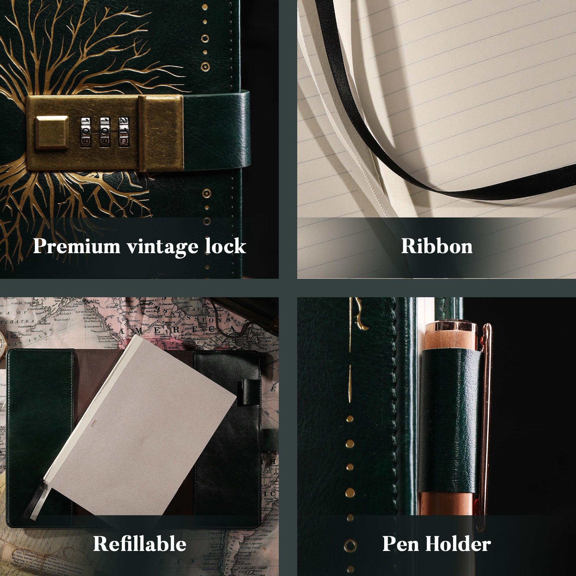 | Cover Material | Textured faux leather or genuine leather with embossed finish (dark green) |