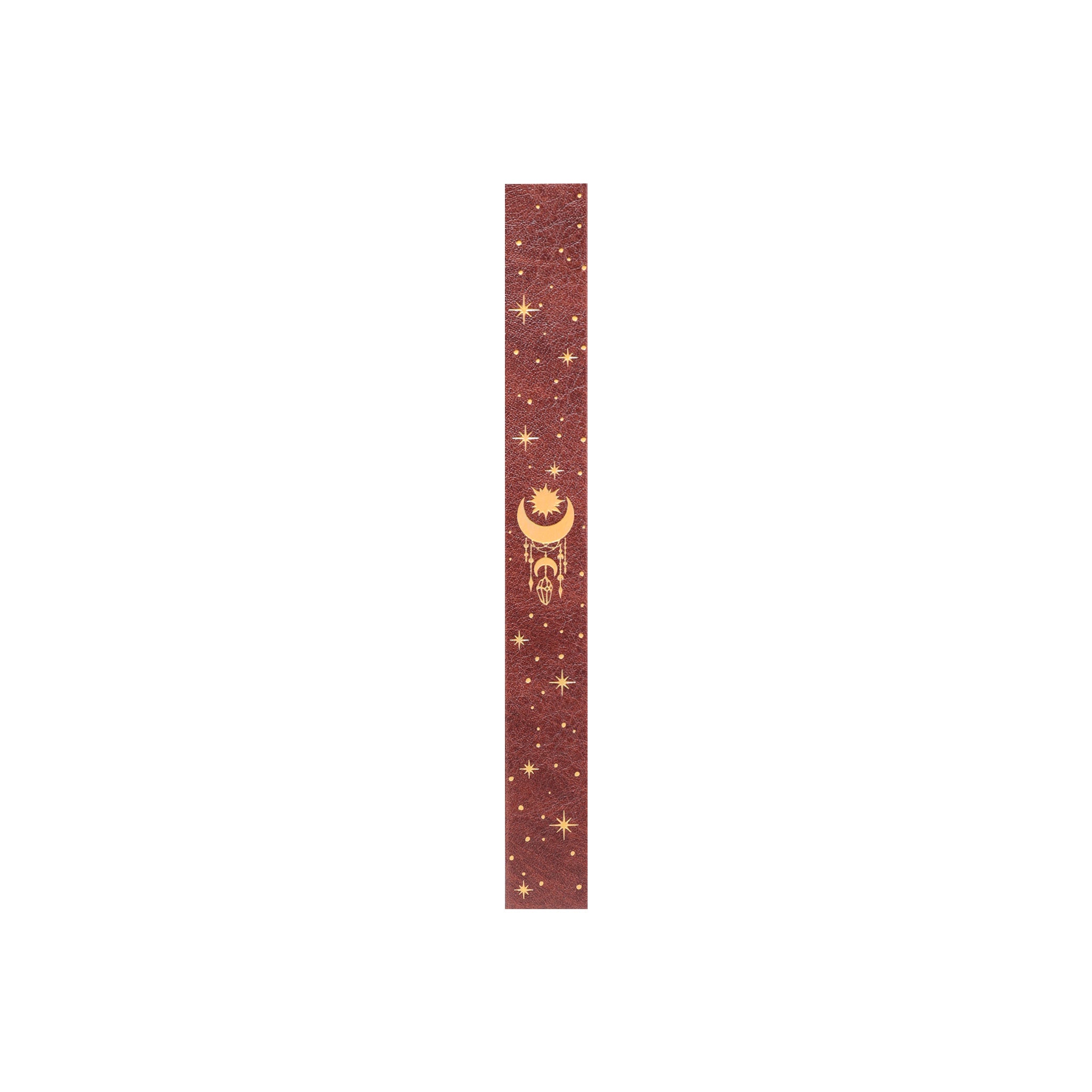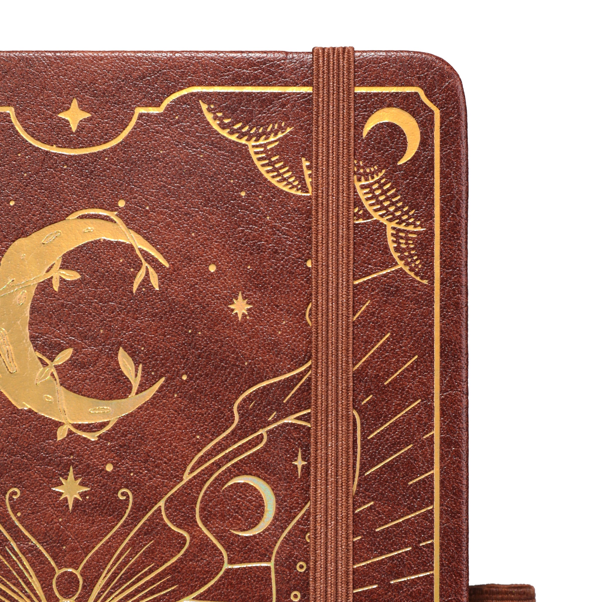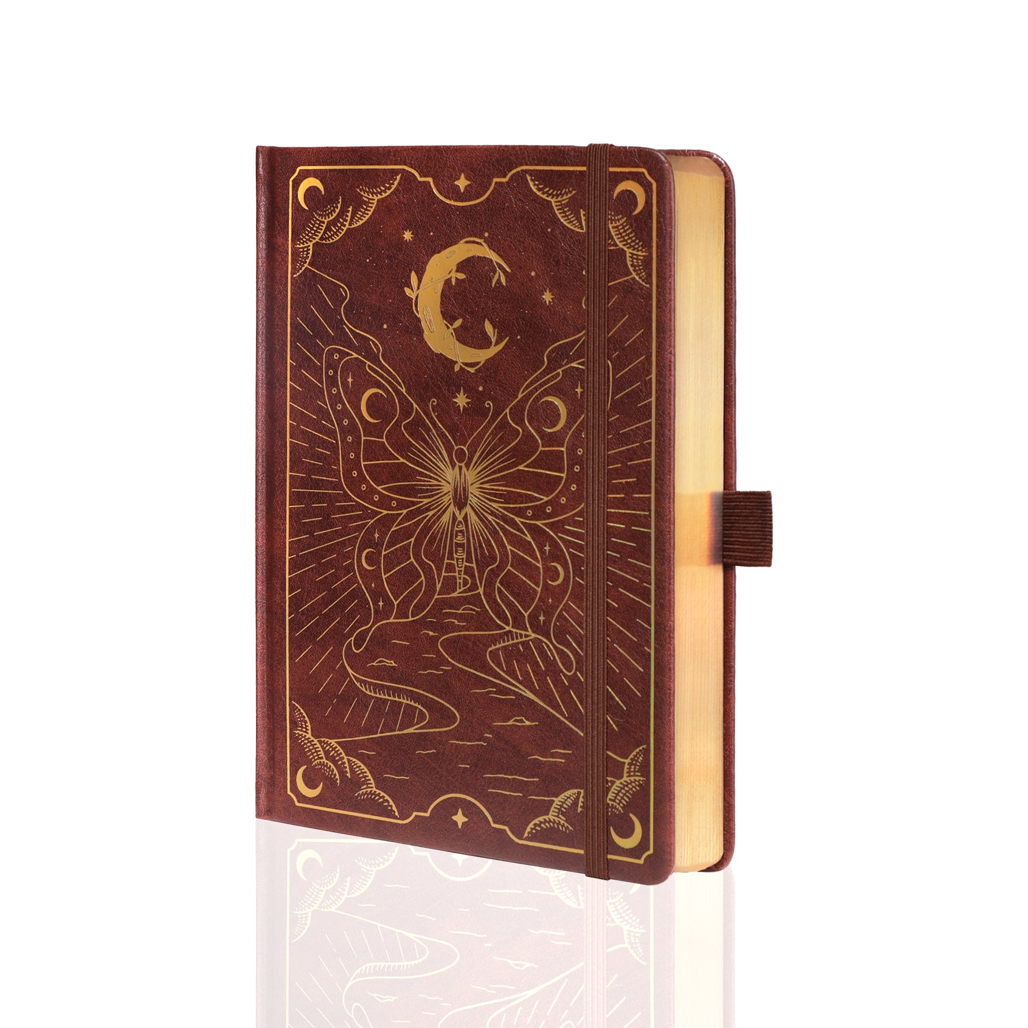 The cover is crafted from textured faux leather, boasting a deep brown or burgundy – brown color that exudes a rustic charm. Intricate gold foil embossing brings to life a large butterfly, a crescent moon adorned with leaves, stars, and celestial motifs like sunbursts and smaller moons/stars, creating a truly mesmerizing sight.