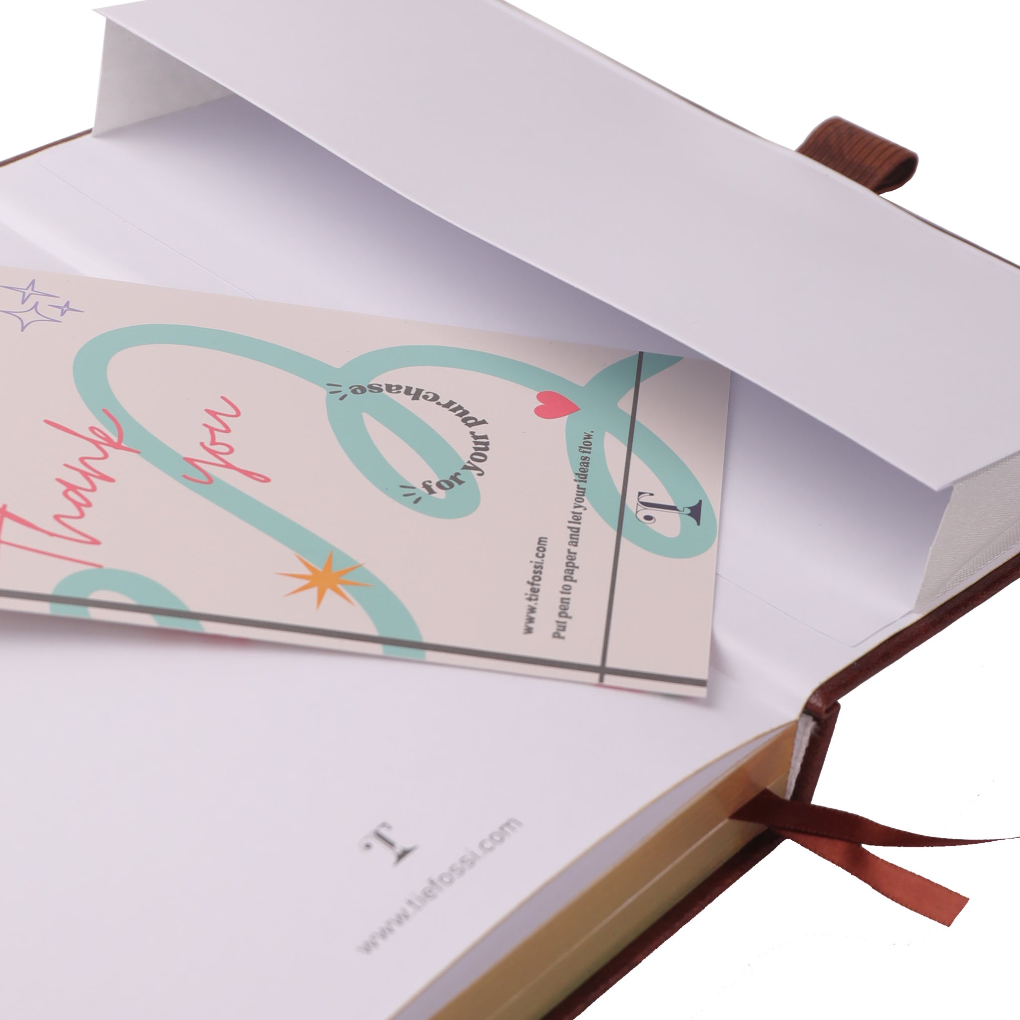 | Accessories | Satin ribbon bookmark, elastic closure band, pen loop/attachment, thank – you card |