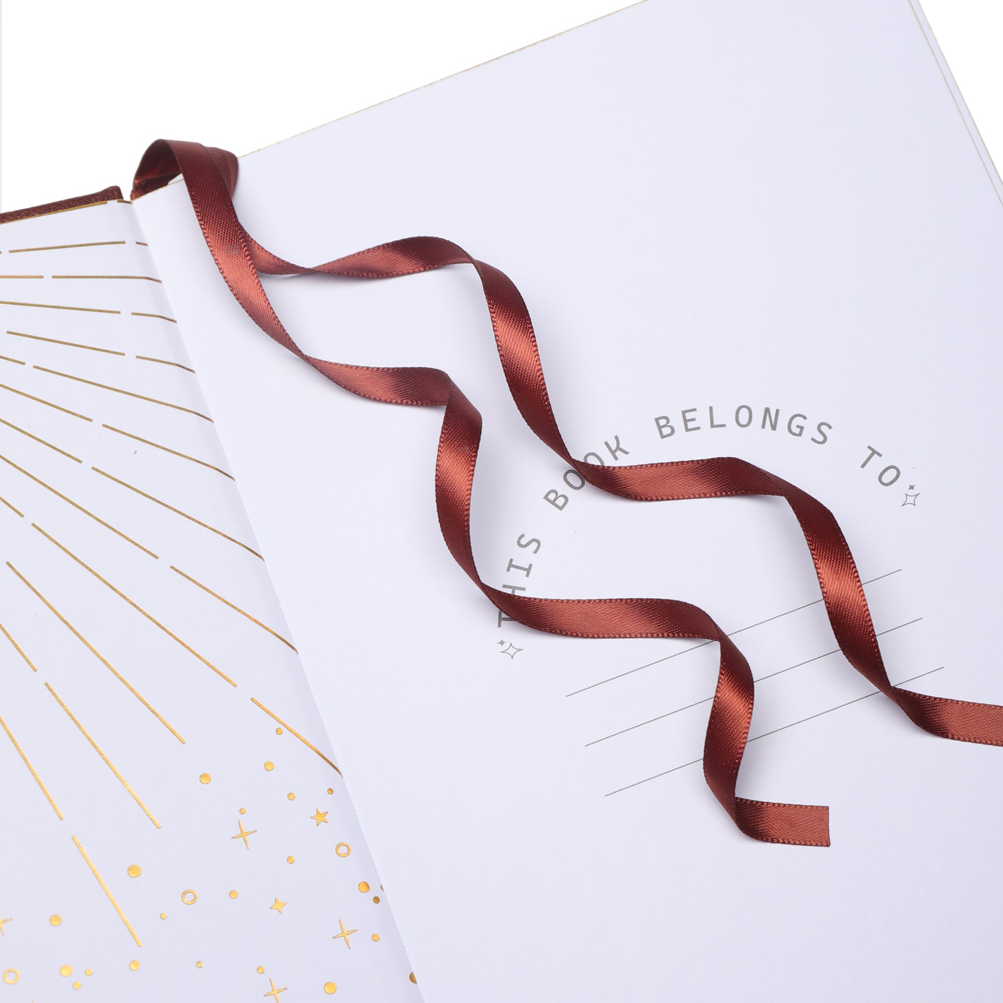 To enhance its functionality, the notebook comes with several useful features. A satin ribbon bookmark, matching the cover color and featuring gold foil details, helps you mark your place easily. A brown elastic closure band keeps the journal securely shut, preventing pages from opening accidentally. An elastic pen loop on the spine allows you to attach a pen for convenient access.