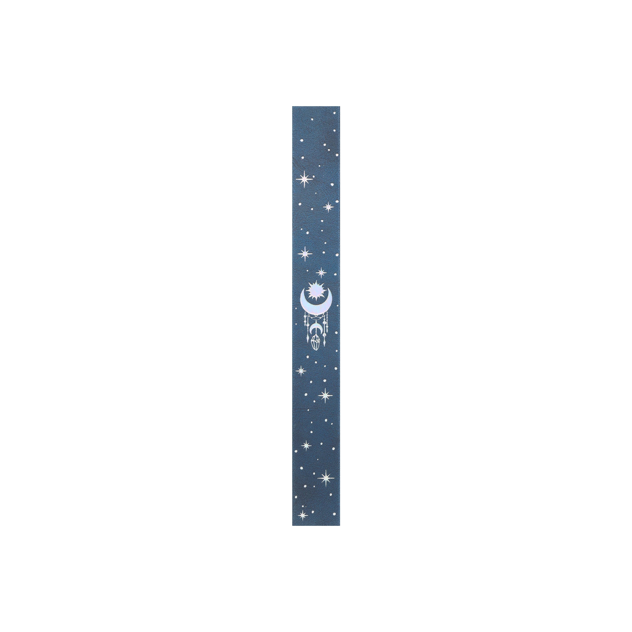 The cover, crafted from a durable, textured faux leather or leatherette material, features a mesmerizing celestial theme. Deep navy blue serves as the primary color, accented with white/silver foil details of a crescent moon, stars, radiating lines, and a large butterfly/moth with moon motifs on its wings. The metallic foil accents create a holographic effect, adding a touch of magic.