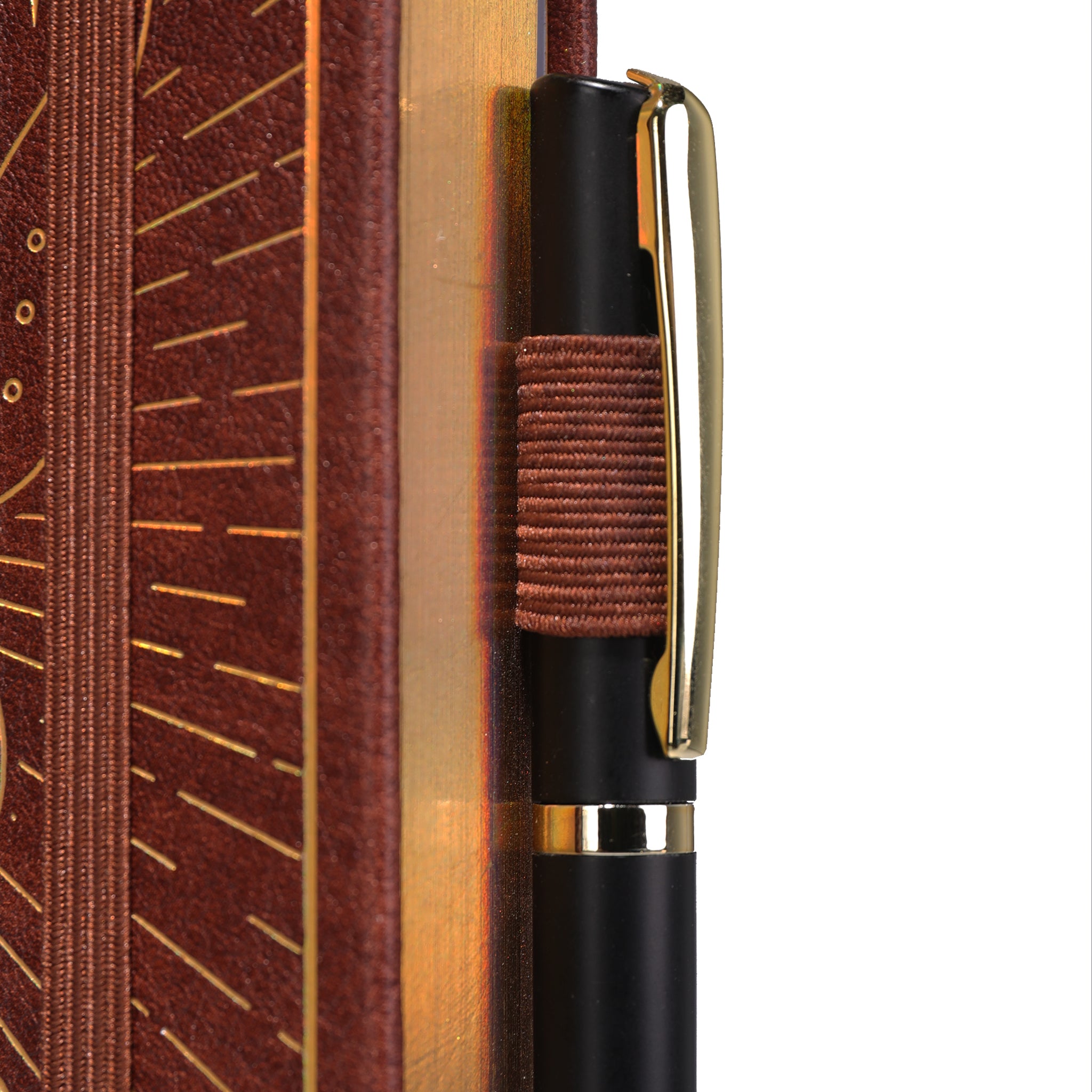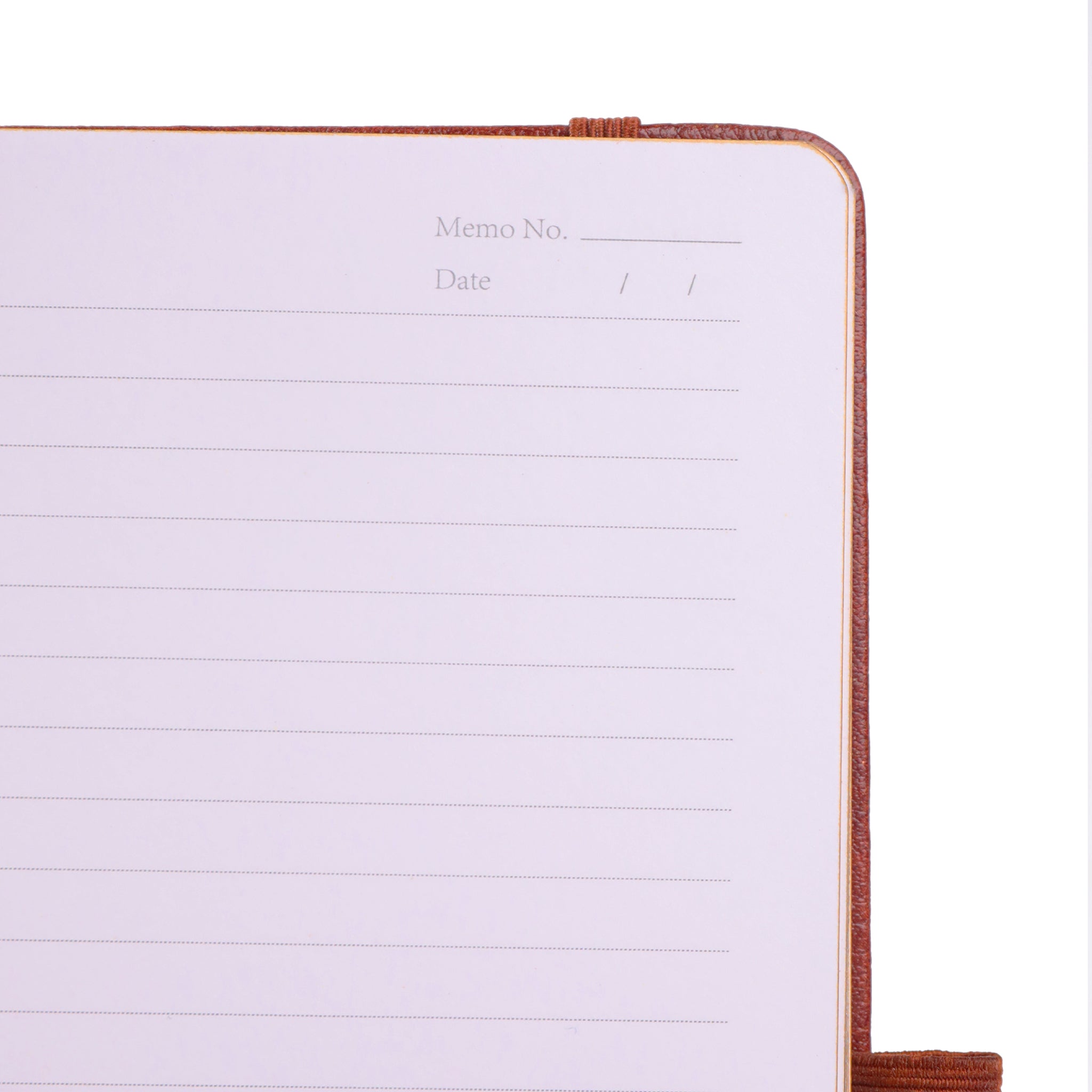 Features Elastic band closure, satin brown ribbon bookmark, fabric pen loop, personalization page, gold foil embossing on cover and inside front cover, lined pages with “Memo No.”/“Date” field