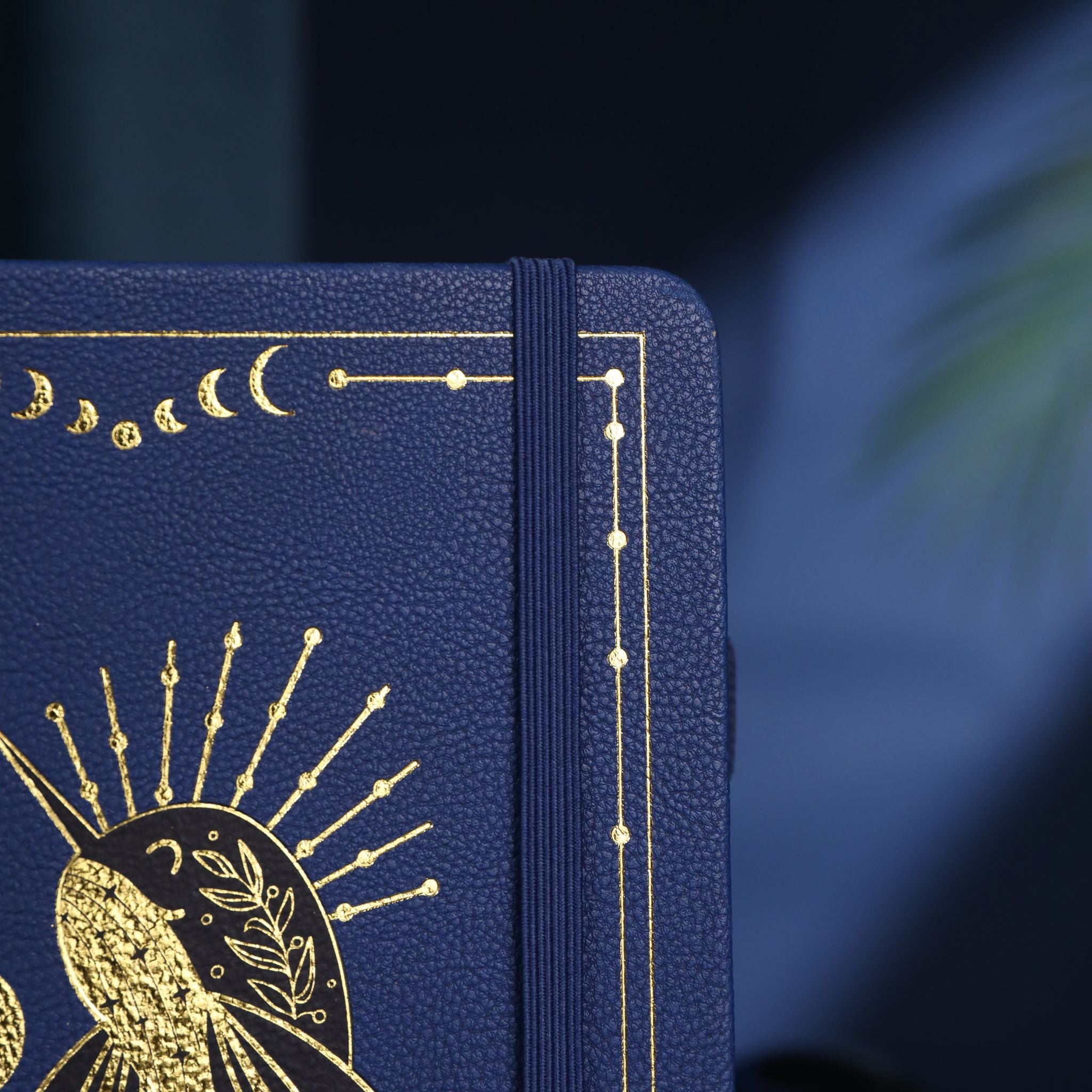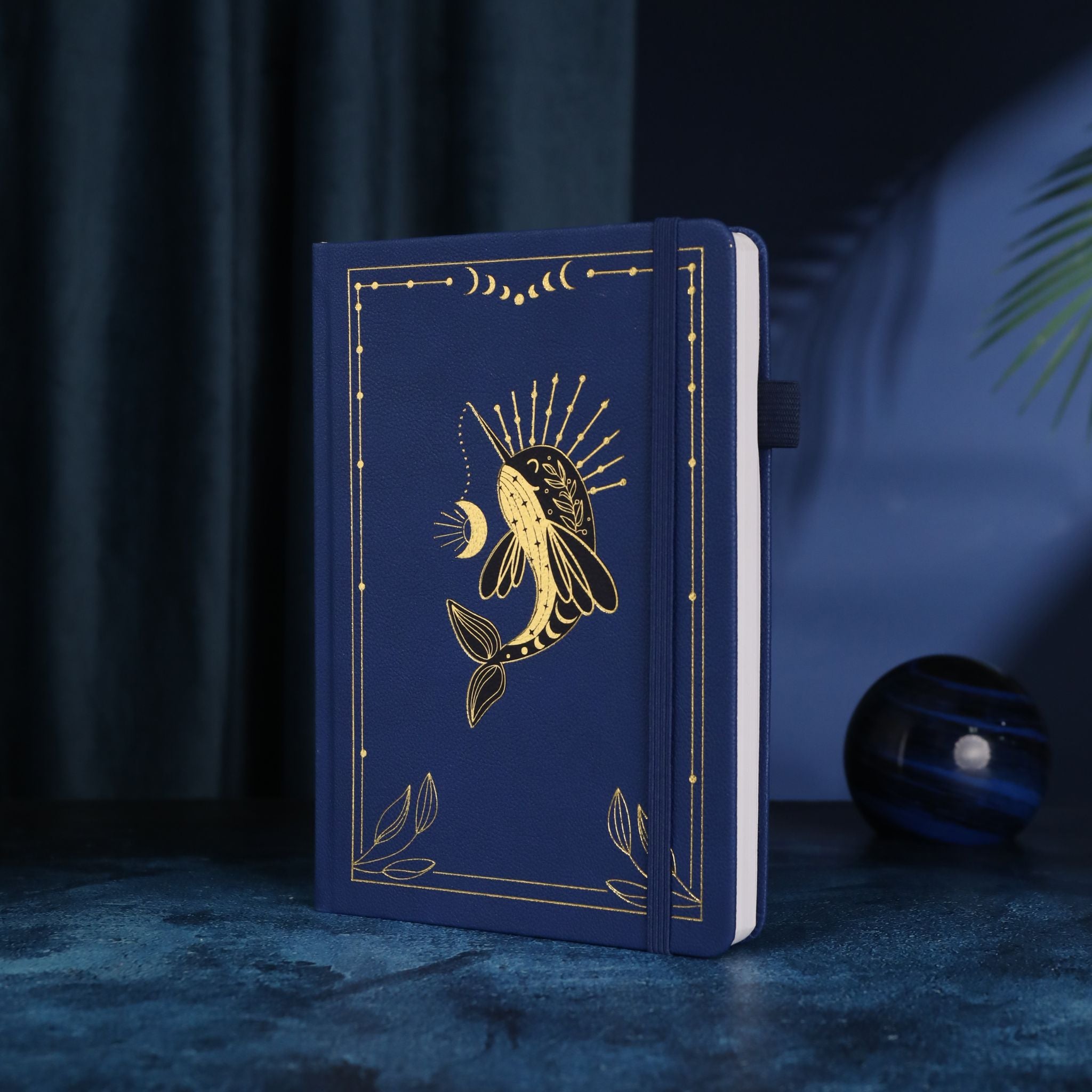 The cover of this notebook is a sight to behold. It is a textured, rigid hardcover with a smooth, leather – like (or faux leather) finish in a rich, deep navy blue. The gold decorative elements, including a narwhal, moon phases, and borders, are created through gold foil embossing. This gives the cover a premium and durable finish, with crisp and evenly – applied foil that shows no signs of smudging or unevenness. The central gold foil illustration features a stylized narwhal with sun rays, a crescent moon, and botanical leaves, surrounded by intricate gold lines with small dots and moon phase symbols. Gold leafy branches in the bottom corners add to the celestial and botanical theme.