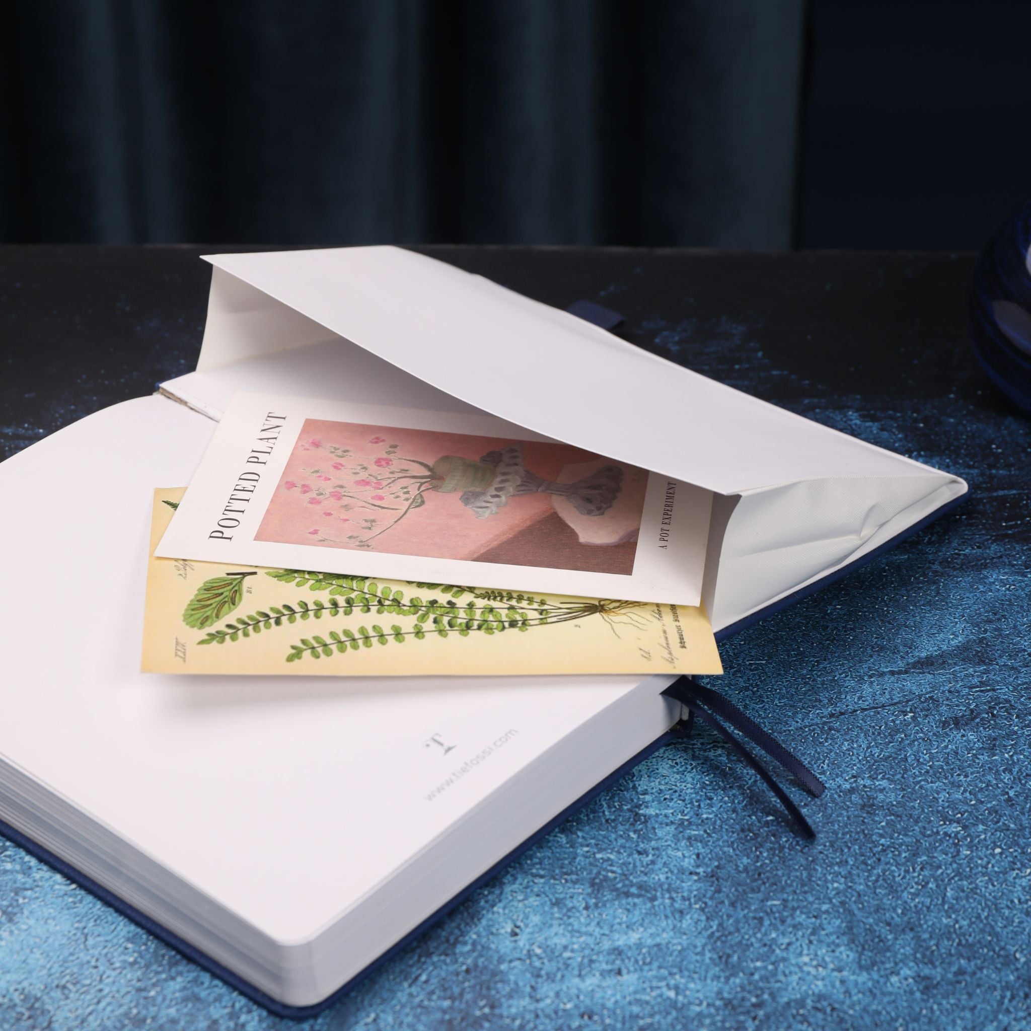 There is a dark navy blue bookmark ribbon, likely made of satin or fabric, attached to the spine for easy page marking. Additionally, there might be a hidden pocket, as suggested by a folded white page with a botanical illustration in one of the images, which can be used to store notes or mementos.