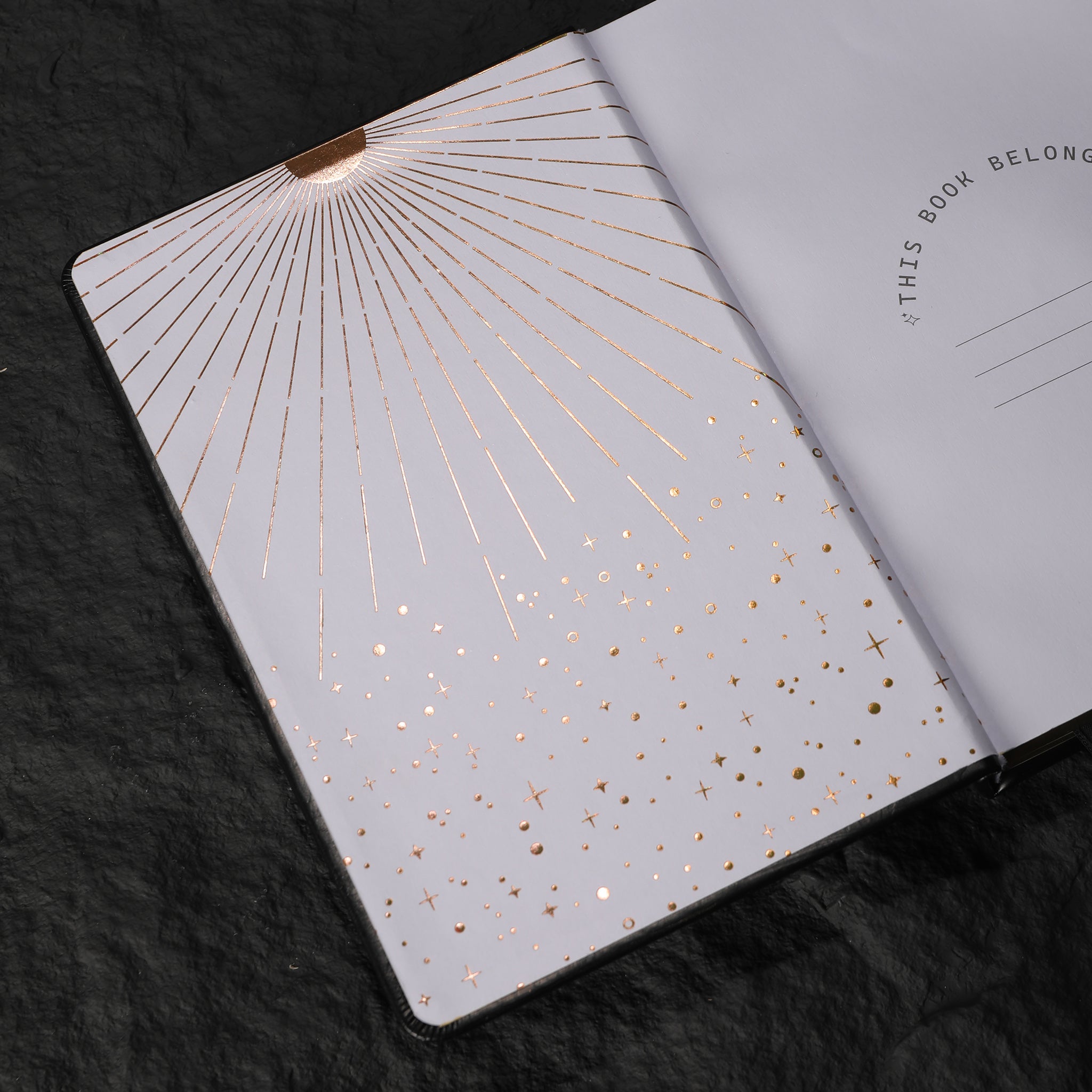Inside, you’ll find 145 thick white pages with a subtle dotted grid, which is perfect for both structured and unstructured journaling, like bullet journaling or planning. The decorative endpapers feature sunburst and star motifs, adding to the overall charm of the notebook. There’s also a “THIS BOOK BELONGS TO” page, allowing you to personalize the journal and mark your ownership.