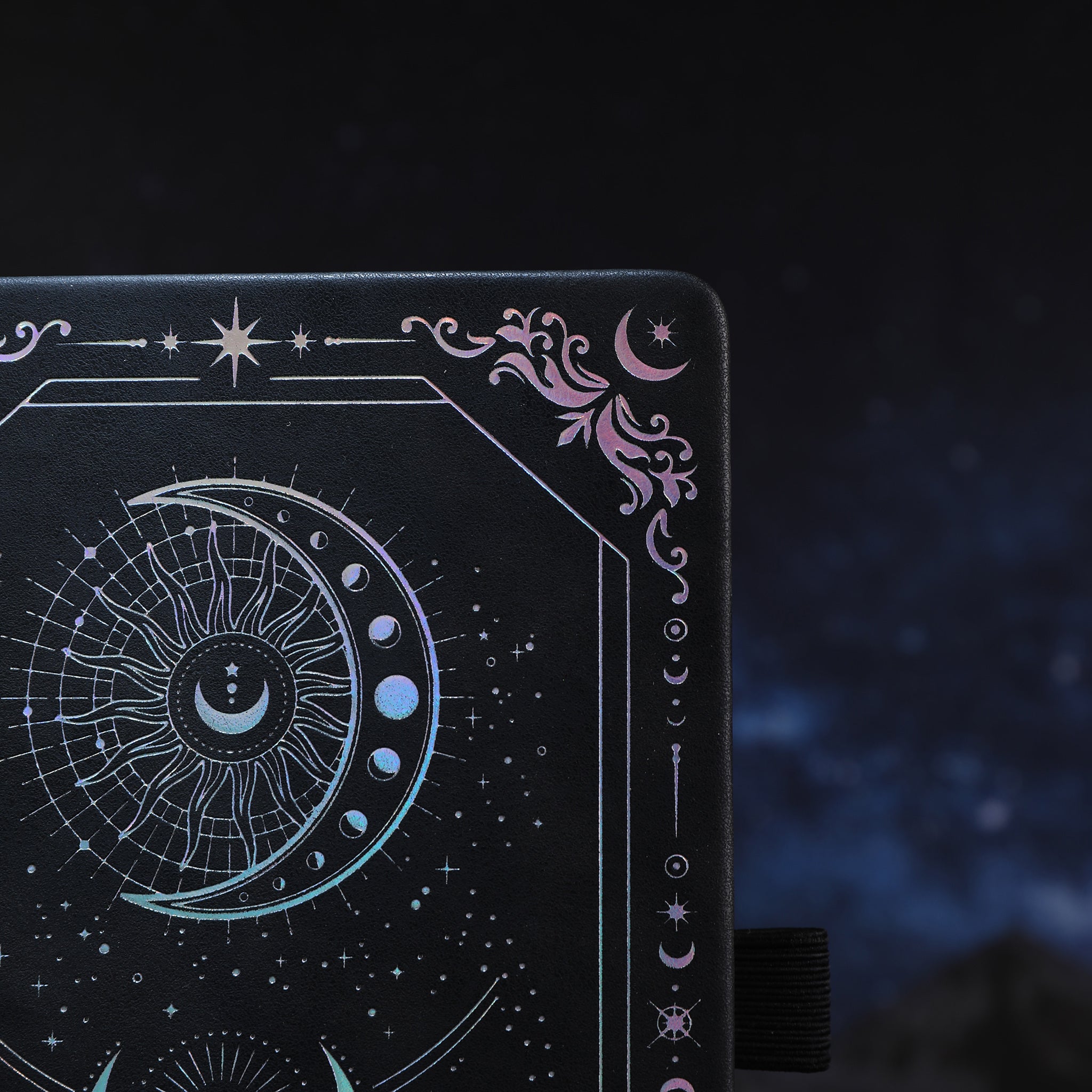 The cover of this notebook is crafted from smooth, durable synthetic leather or faux leather in a sleek black base. The celestial designs on the cover are applied via foil stamping or embossing, creating a captivating holographic/iridescent effect with purple, blue, and pink hues when the light hits it. Intricate celestial motifs such as moons in phases, sunbursts, stars, and constellations adorn the cover, framed by ornate filigree borders, giving it a mystical, cosmic, and gothic – influenced aesthetic that will appeal to astrology and spirituality enthusiasts.