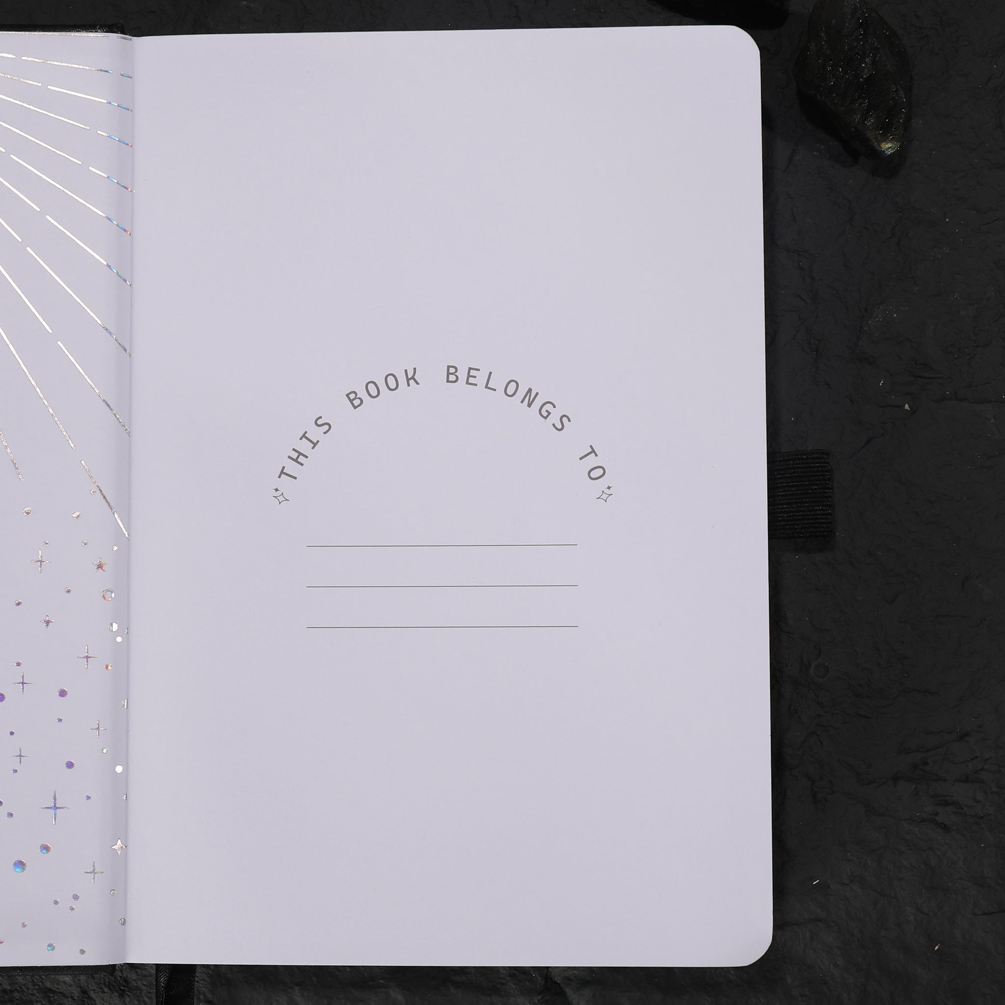 Design Elements Intricate celestial motifs (moons in phases, sunbursts, stars, constellations), holographic/iridescent foil stamping, ornate filigree borders, sunburst star pattern inside, “THIS BOOK BELONGS TO” page