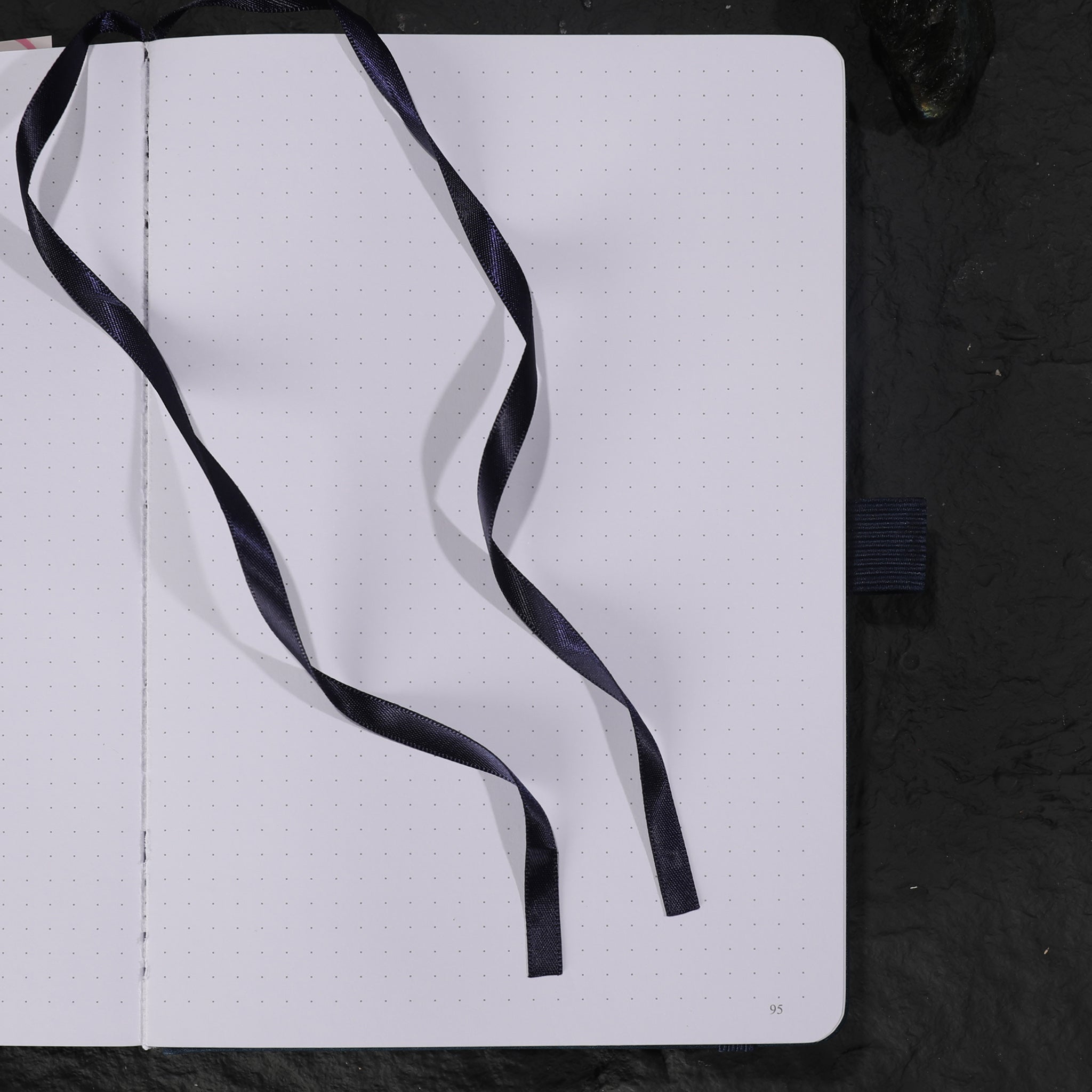 | Dominant Colors | Deep navy/black (cover), white (pages), dark blue (bookmark/elastic) |