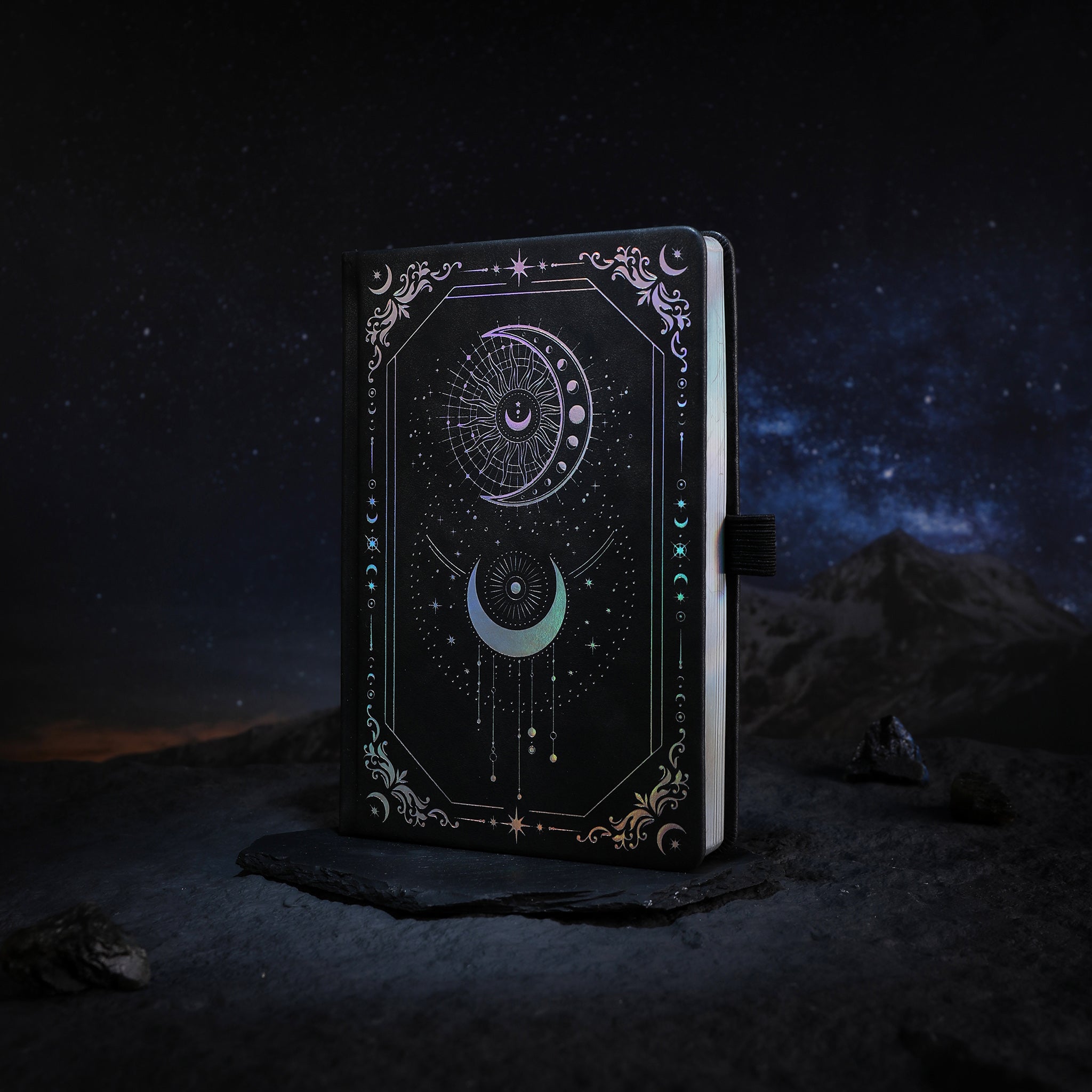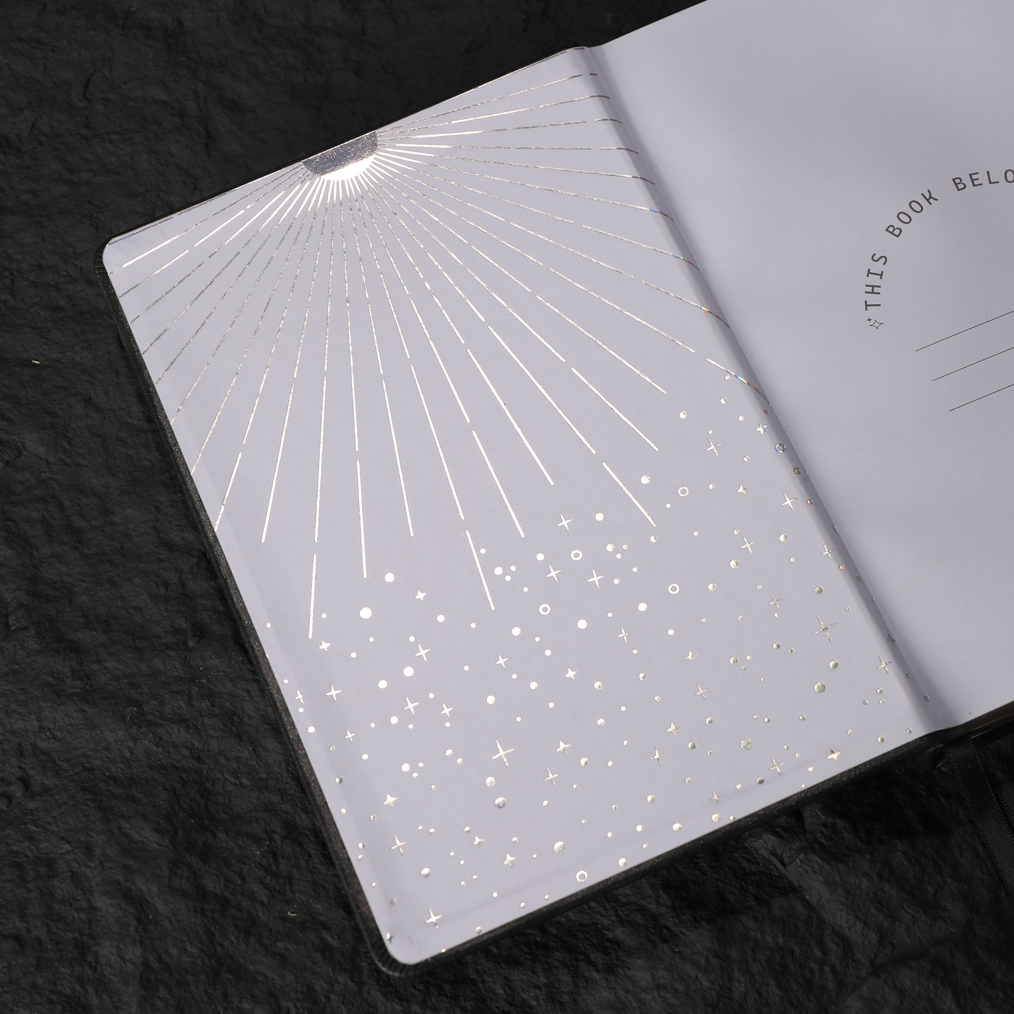 Design Elements Celestial motifs (sun, moon, stars), ornate filigree scrollwork, vertical celestial lines on spine, tiny celestial symbols, holographic effect, sunburst with star dots on inner cover, “THIS BOOK BELONGS TO” section
