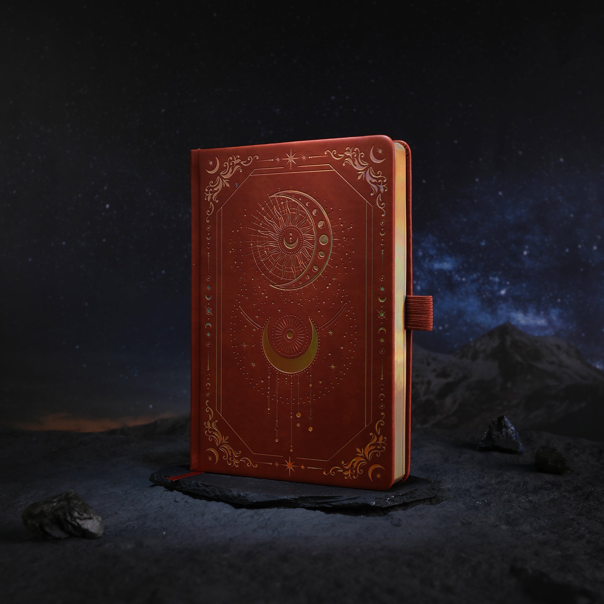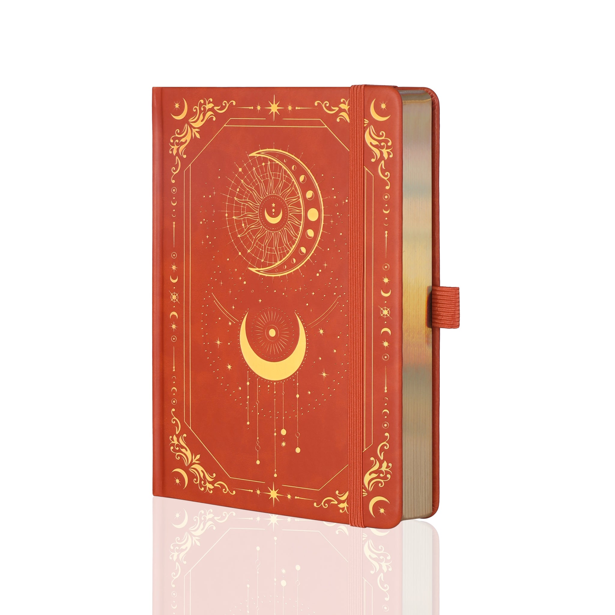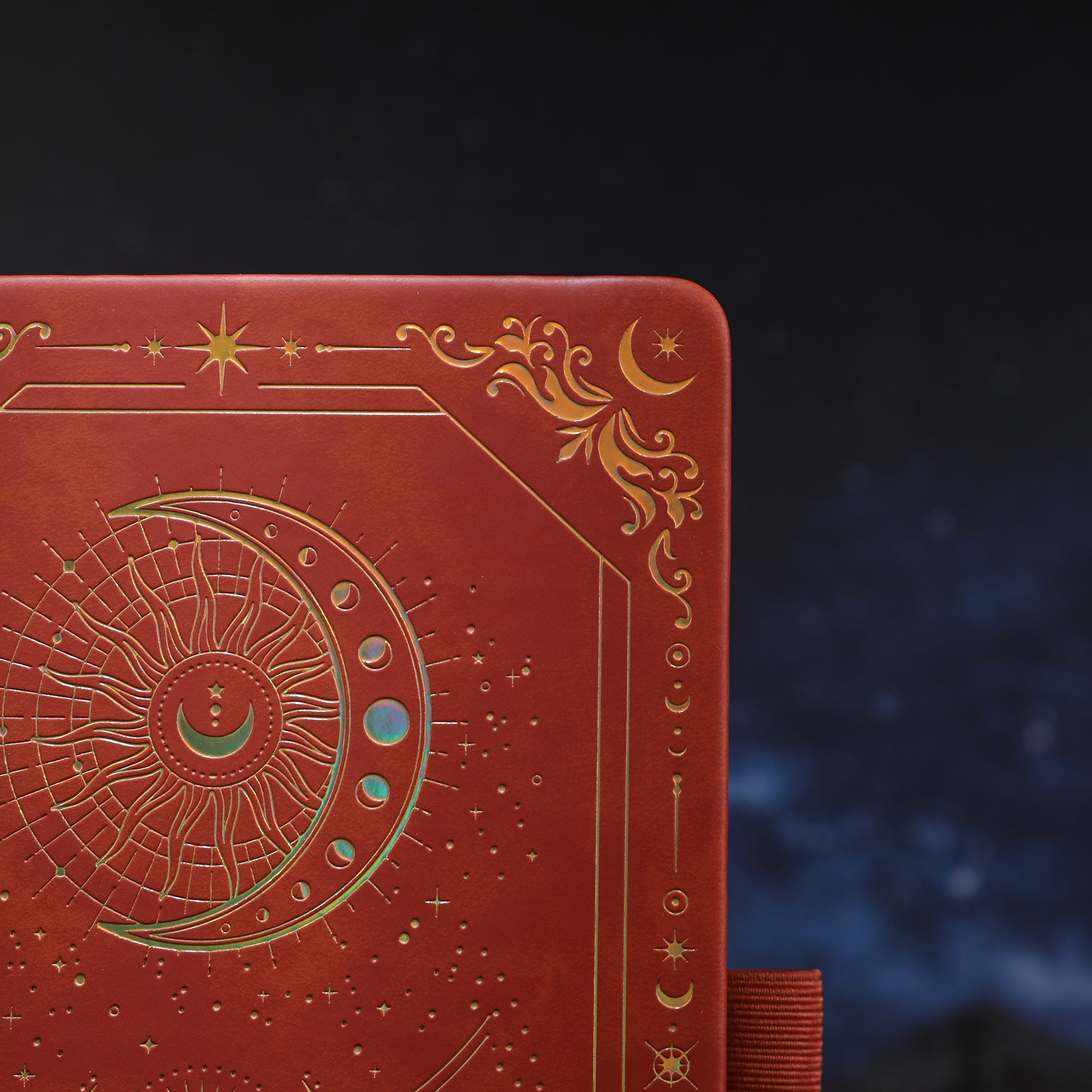 The cover is crafted from a smooth, hard – wearing synthetic material that resembles faux leather. Its rich, terracotta – red color is complemented by stunning gold foil/embossed detailing, which has an iridescent sheen in certain lighting, enhancing the celestial mystique. The precise gold foil work, intricate celestial patterns, and clean, uniform embossing showcase high – end craftsmanship with meticulous attention to detail. The corner decorations feature tiny moons, stars, and scrollwork, adding depth to the overall design. The hardcover has a glossy, scratch – resistant surface with a refined, luxurious feel and a sturdy binding to withstand regular use.