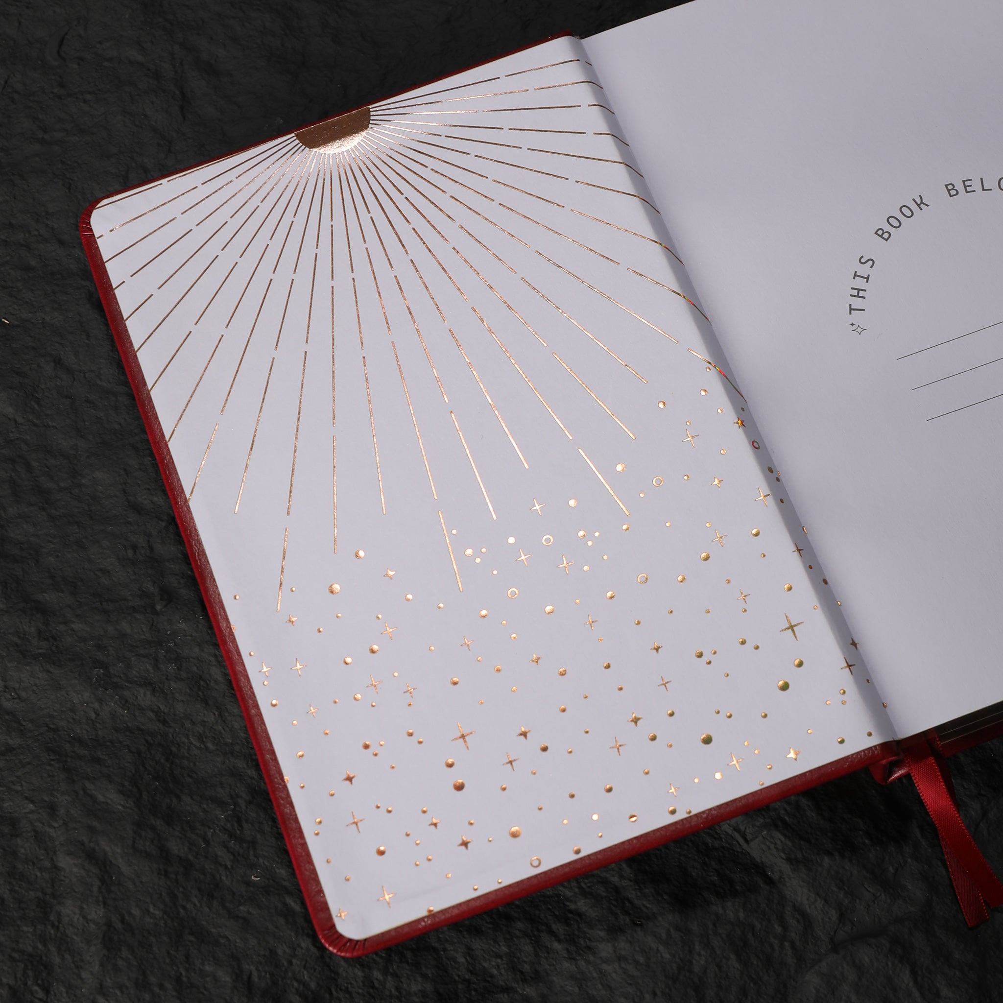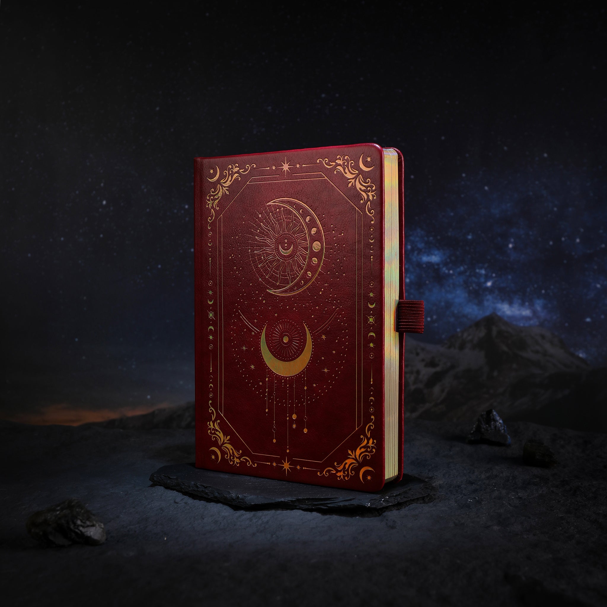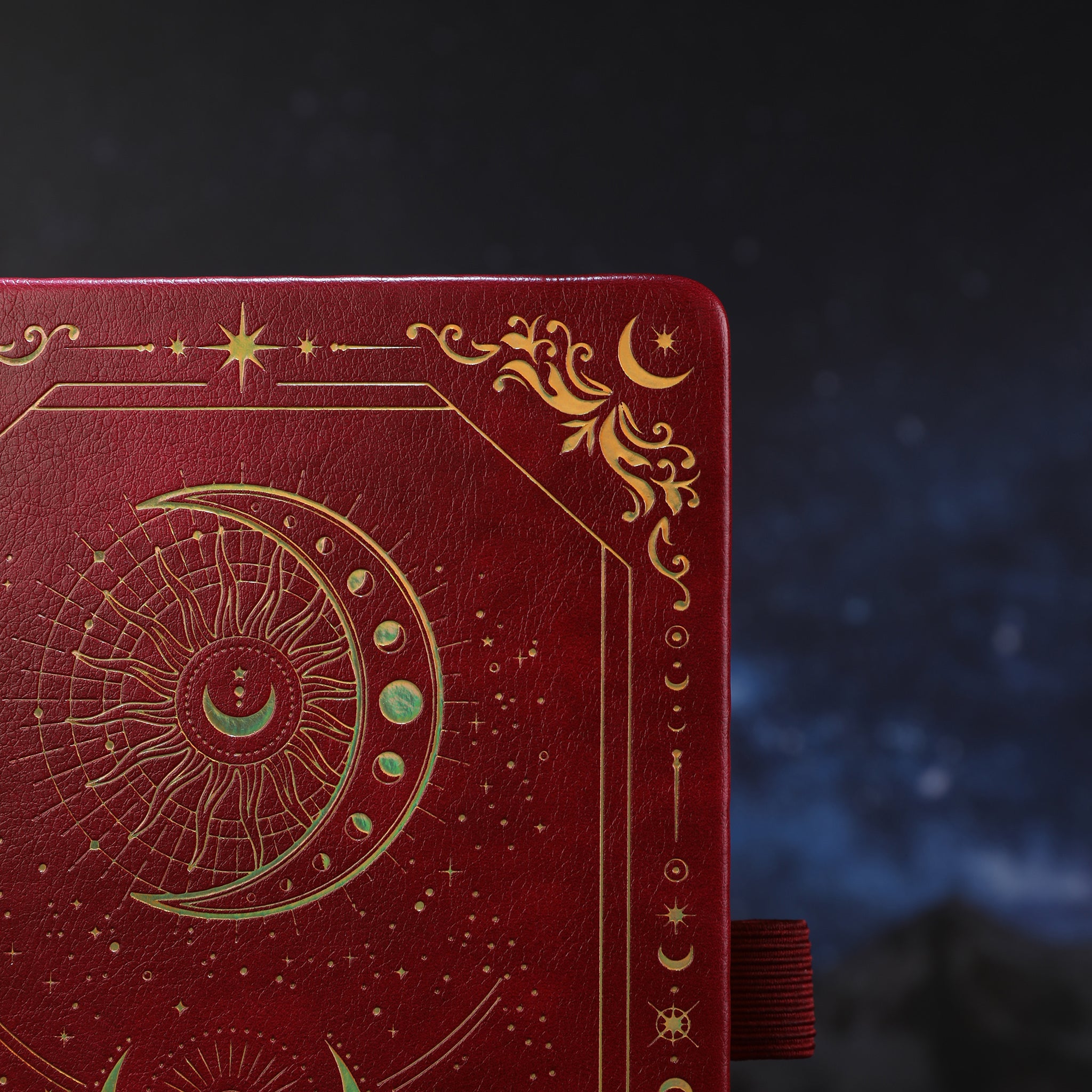 Color Rich, deep red (maroon) cover with gold foil/embossed celestial motifs
