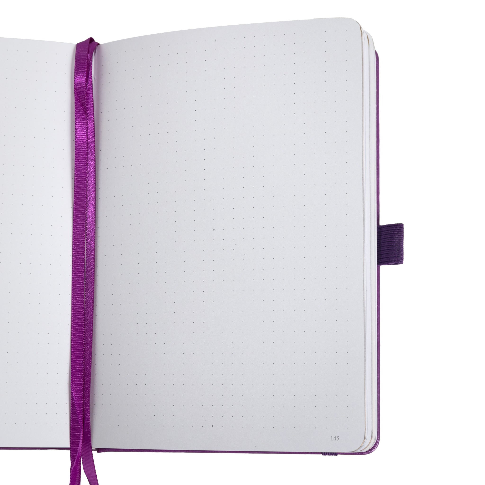 The interior of the notebook is lined with white, dot-grid paper, which is suitable for journaling, bullet planning, or sketches. The evenly spaced dots provide a versatile surface for precise note-taking or illustrations. The notebook also features a purple satin ribbon marker, which is used to mark pages, and a purple fabric closure strap with star accents, which secures the journal closed.