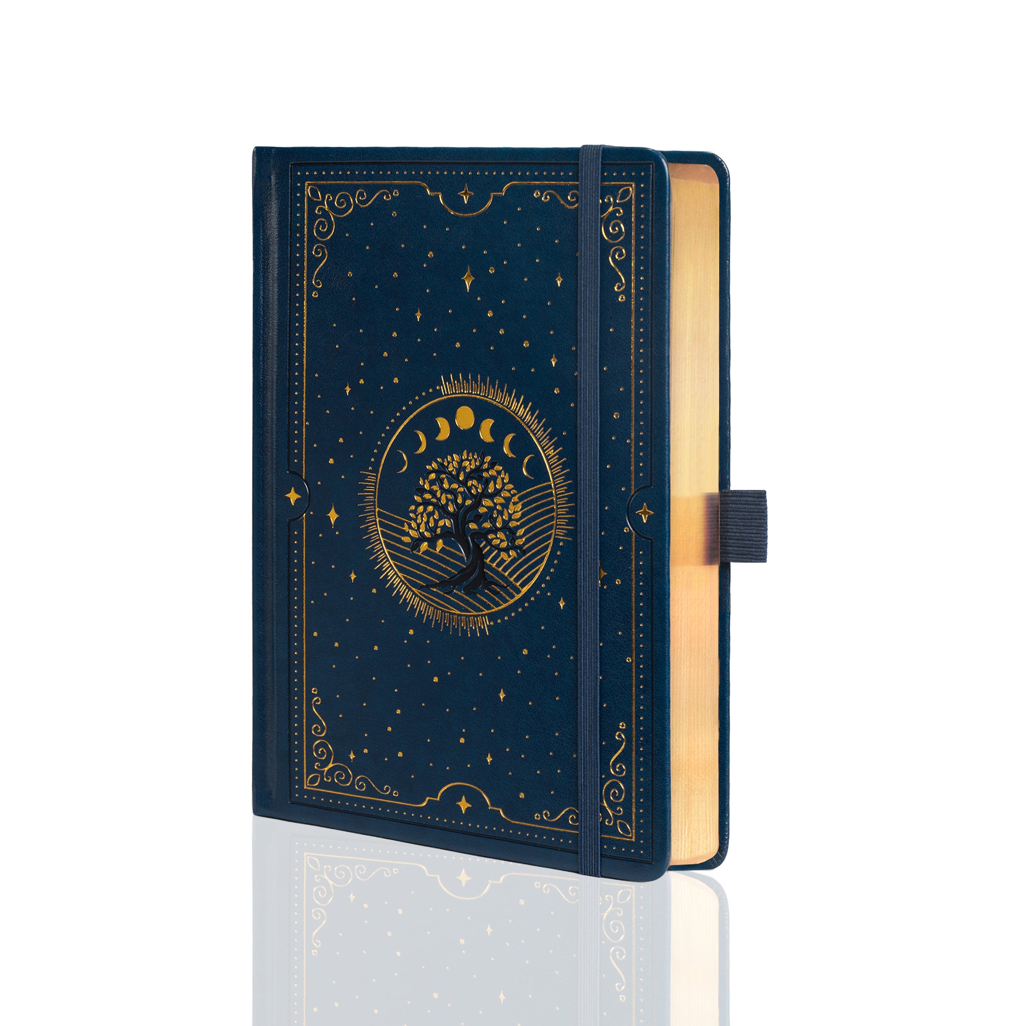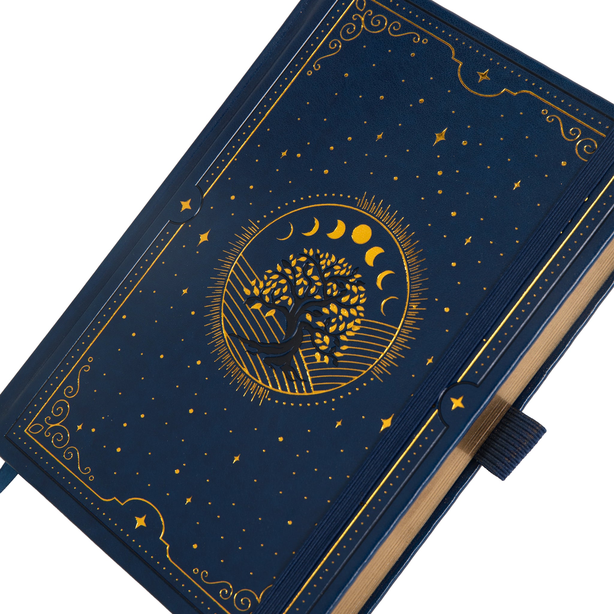 The hardcover of this luxury journal is crafted from a smooth, high – quality faux leather or genuine leather – like material in a rich dark blue color. The cover is adorned with intricate gold foil stamping, featuring an ornate border with scrollwork and star motifs at the corners. The central focal point is a stunning tree, possibly the Tree of Life, with golden leaves, surrounded by sun rays, moon phases, and scattered stars. This celestial and natural design is a symbolic and eye – catching focal point.