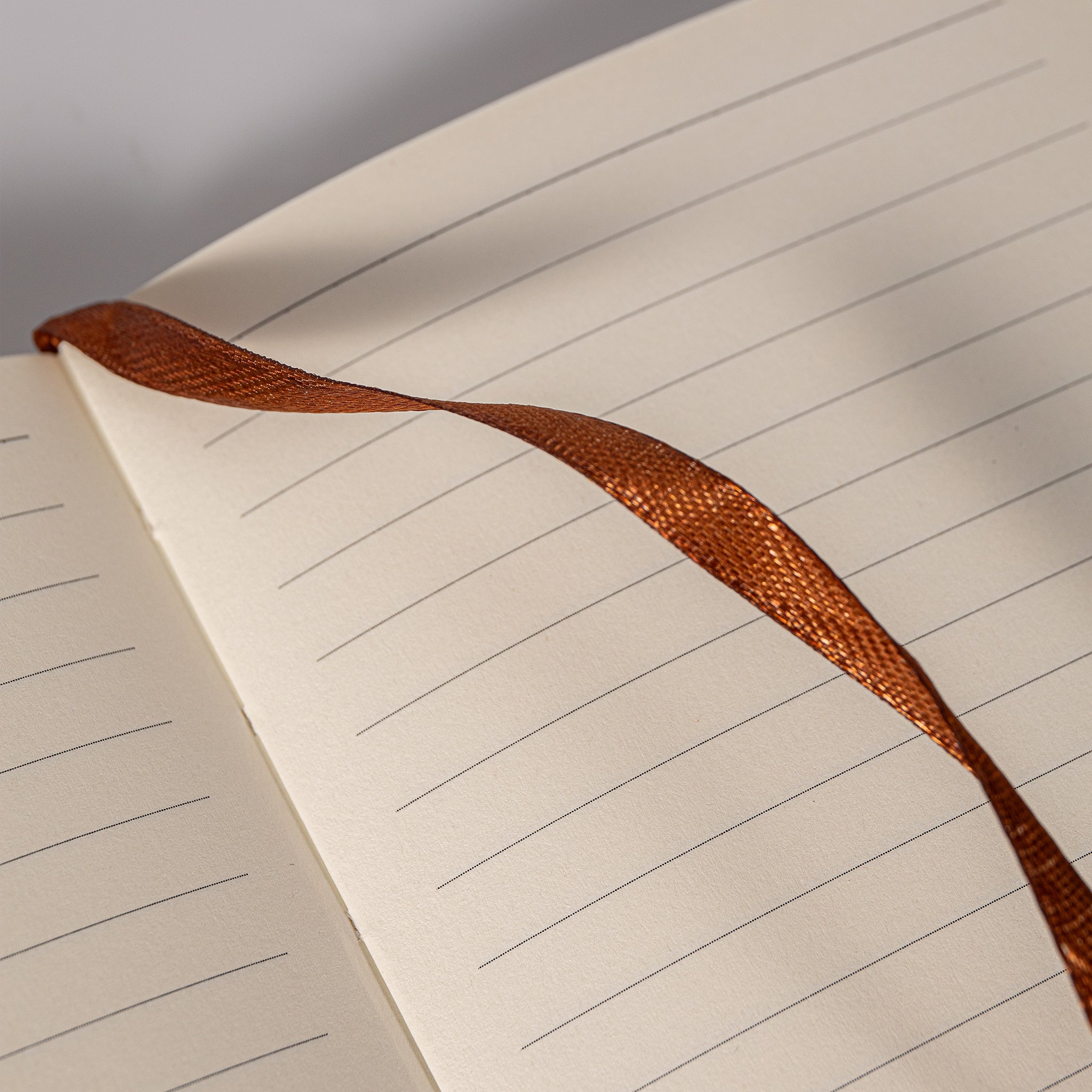 - Ribbon Bookmark: Copper/brownish – orange, textured fabric ribbon