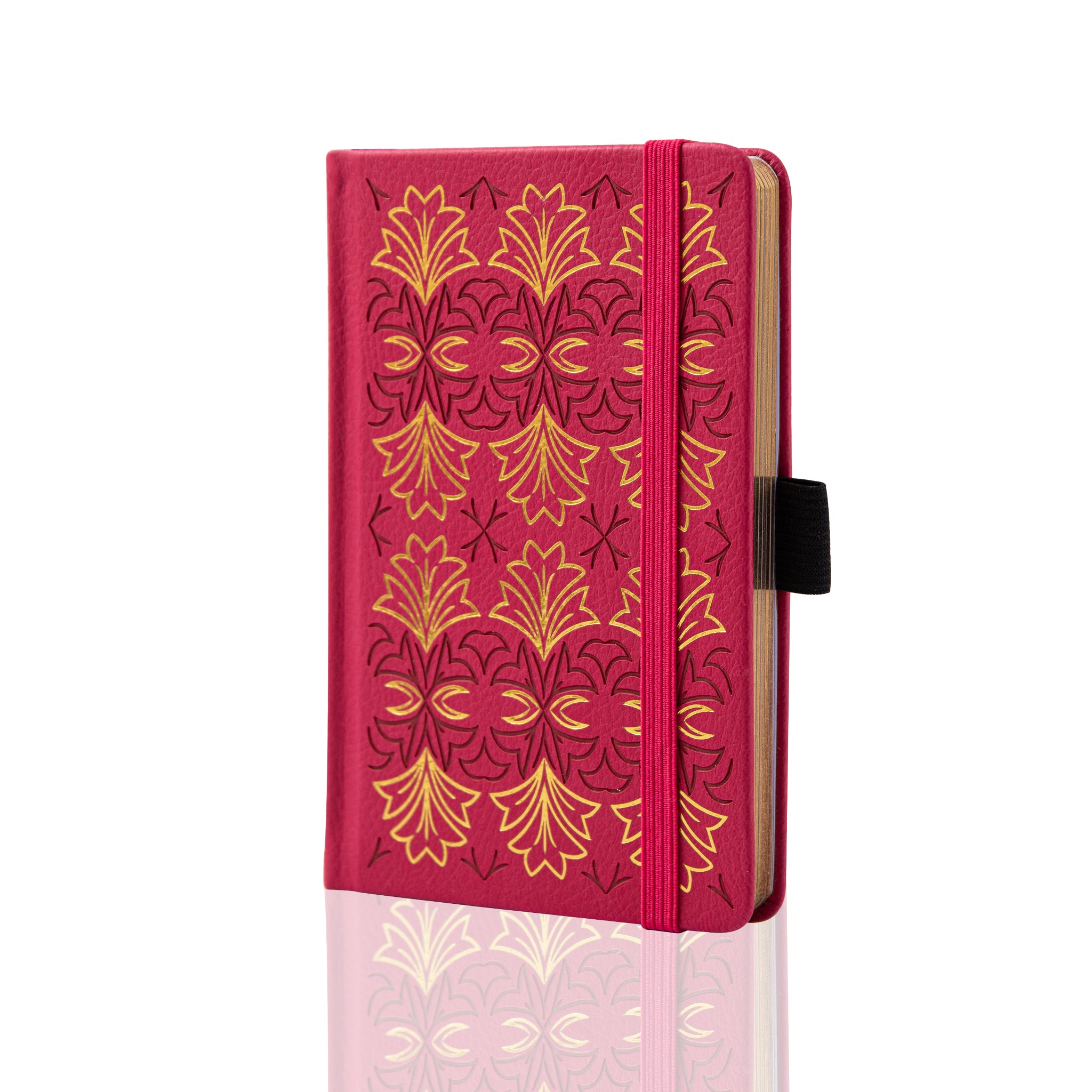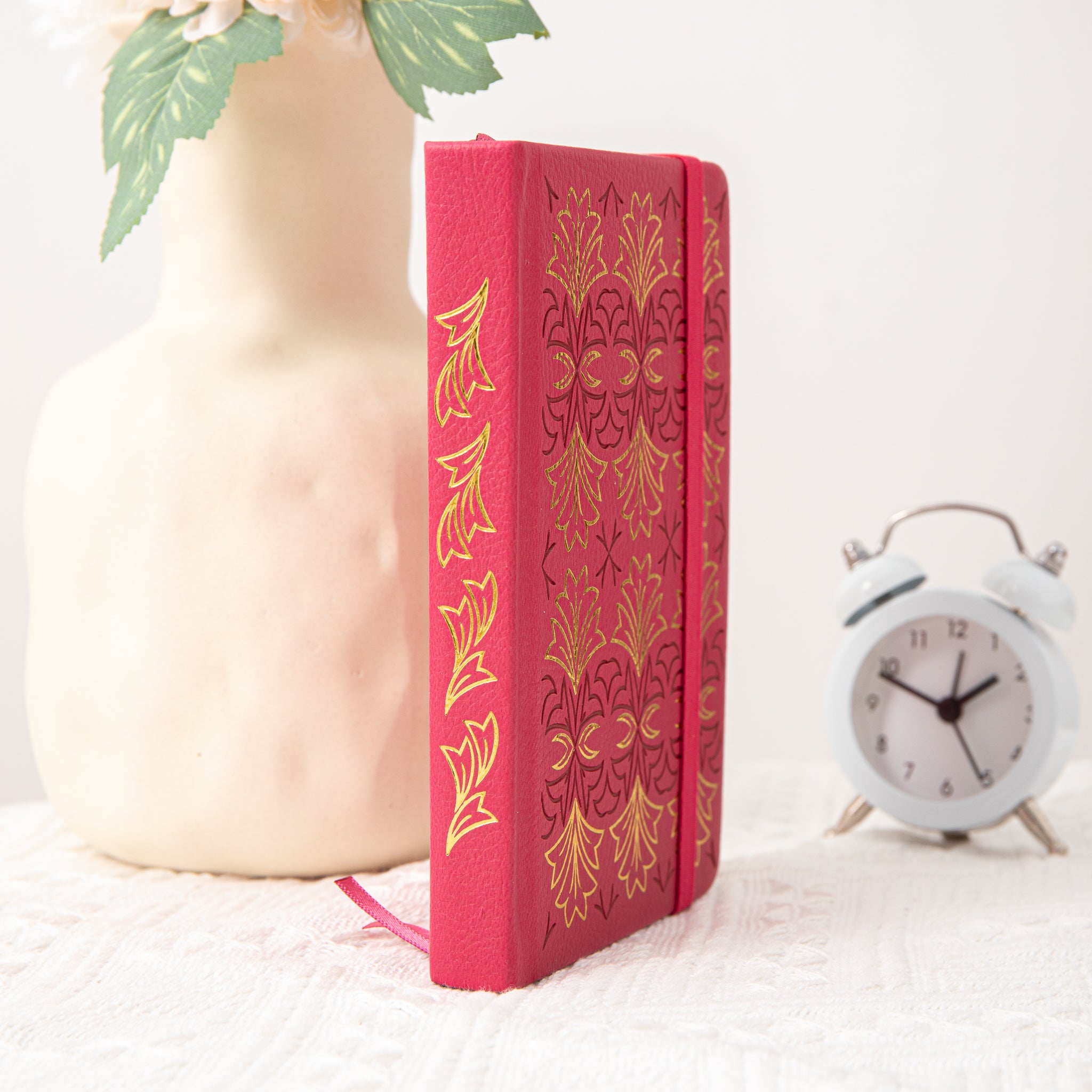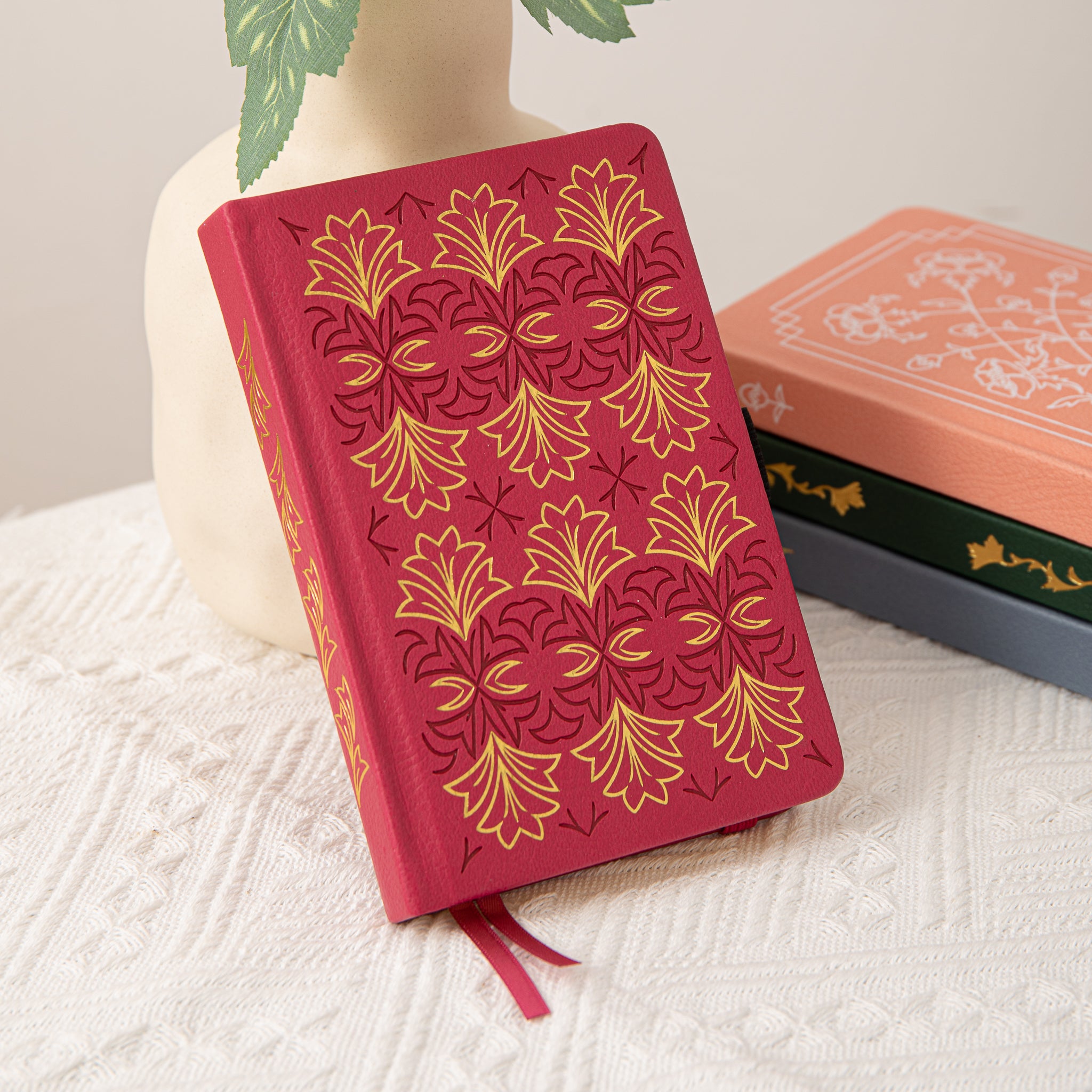 - Cover Decoration: Debossed and stamped in gold with repeating gold leaf/flower motifs