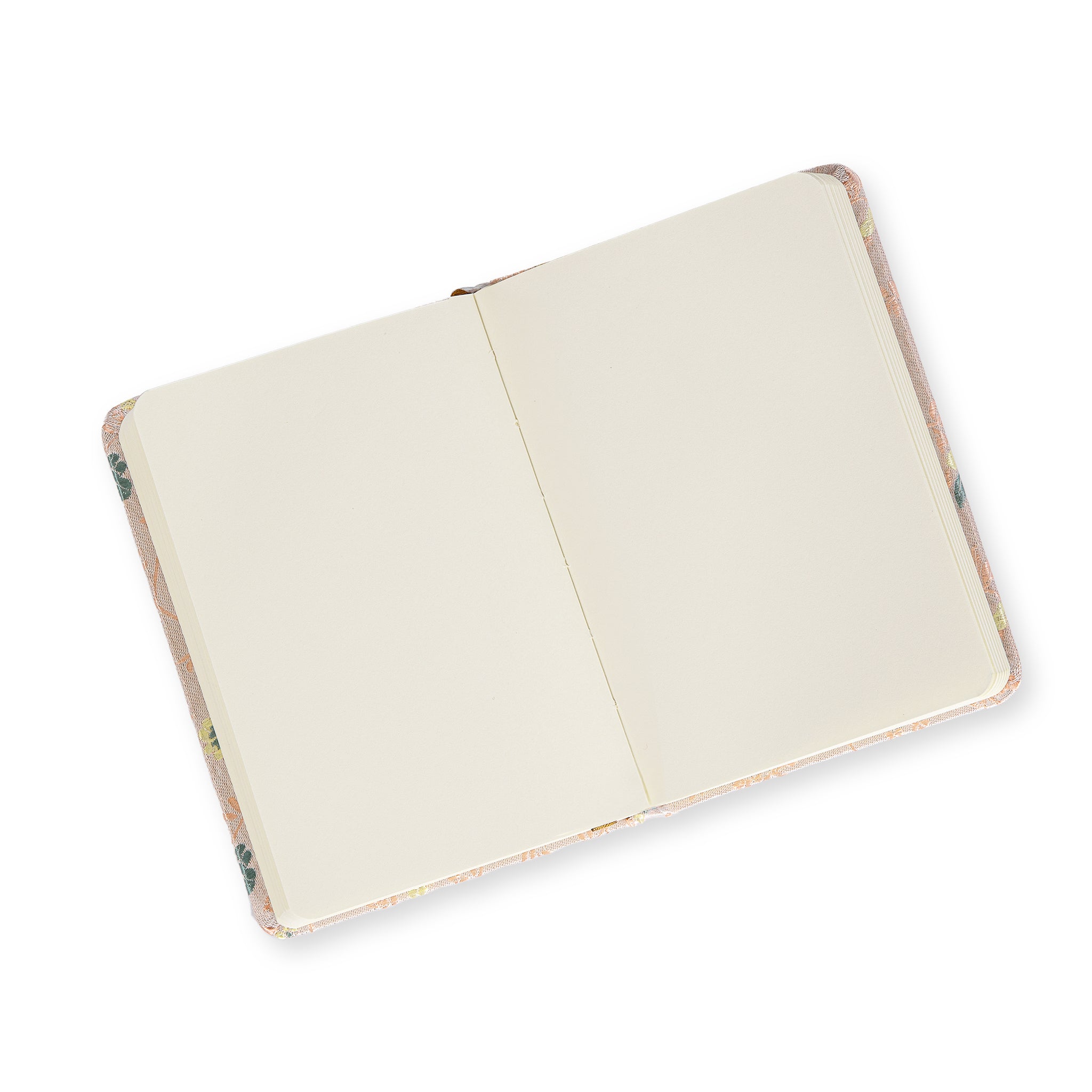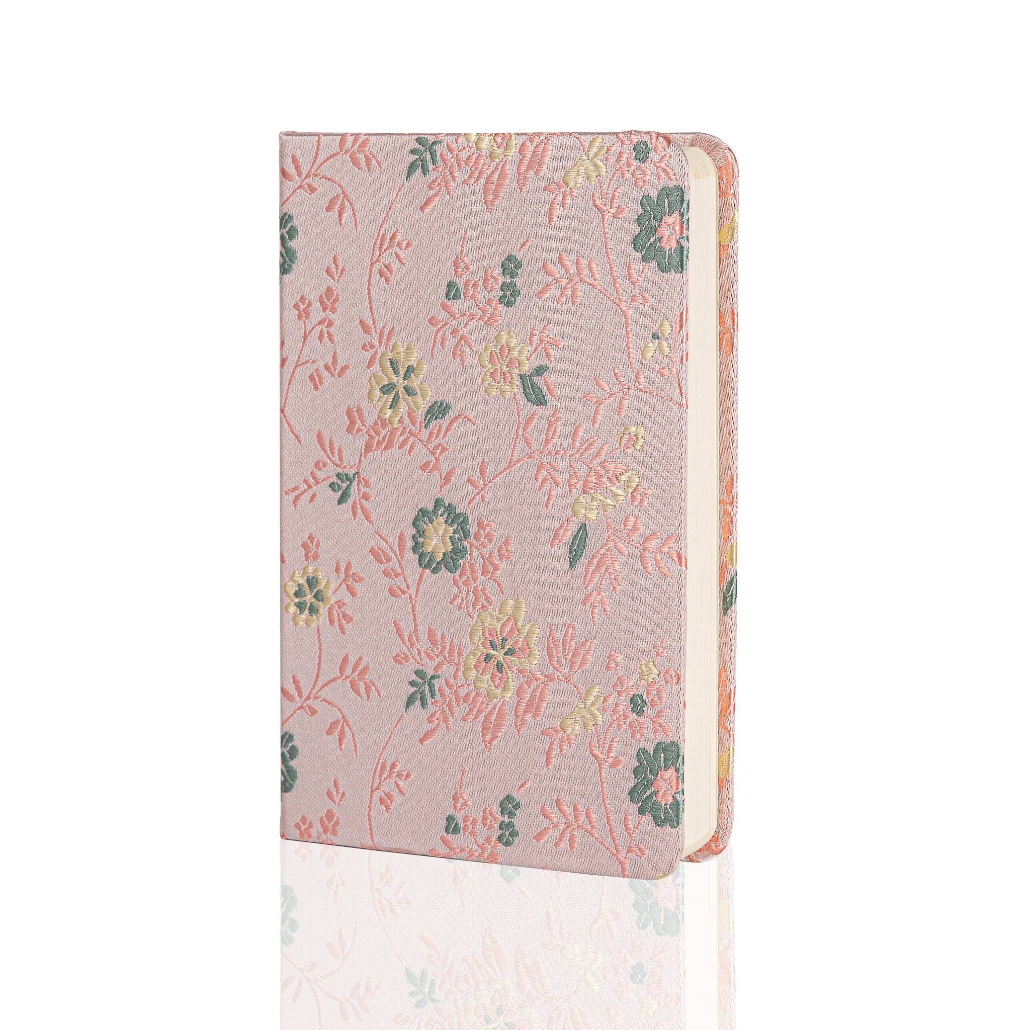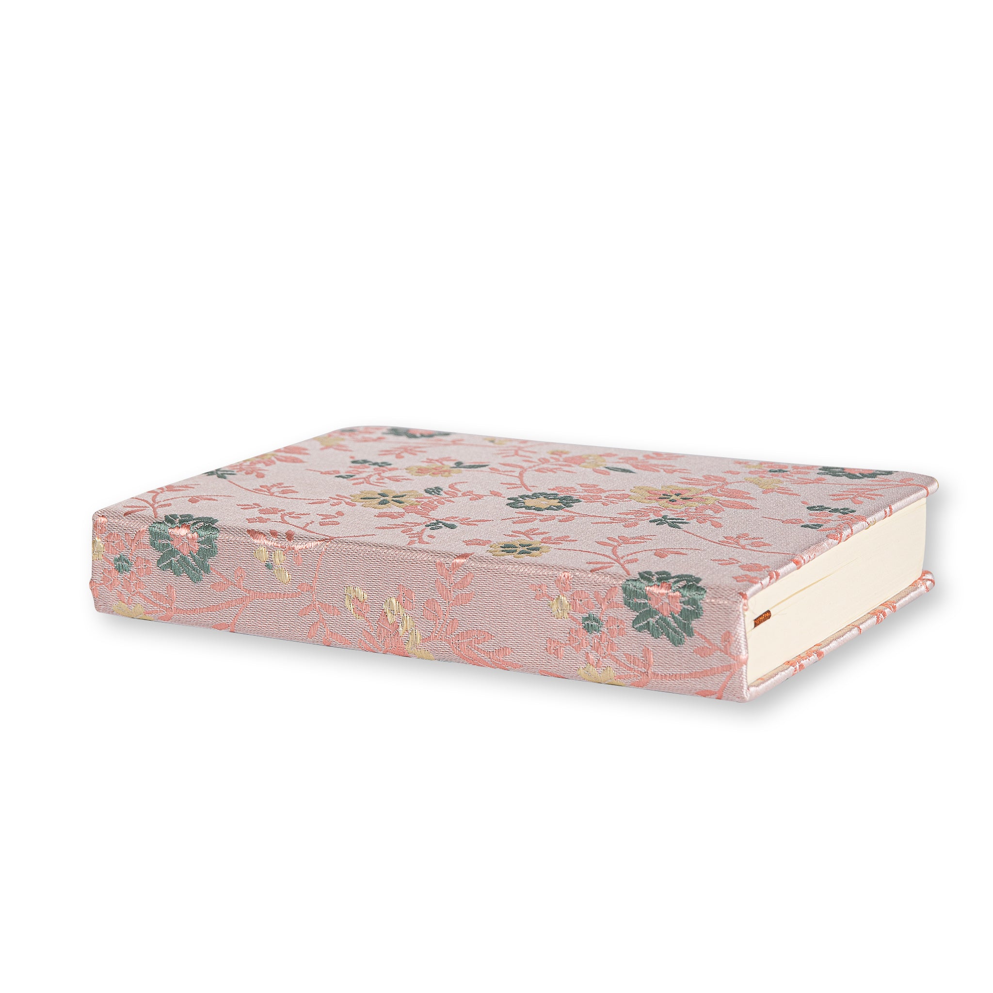 - Cover Design: Light pink base with intricate floral patterns in green, yellow, and pink accents, textured fabric with a glossy, embossed finish