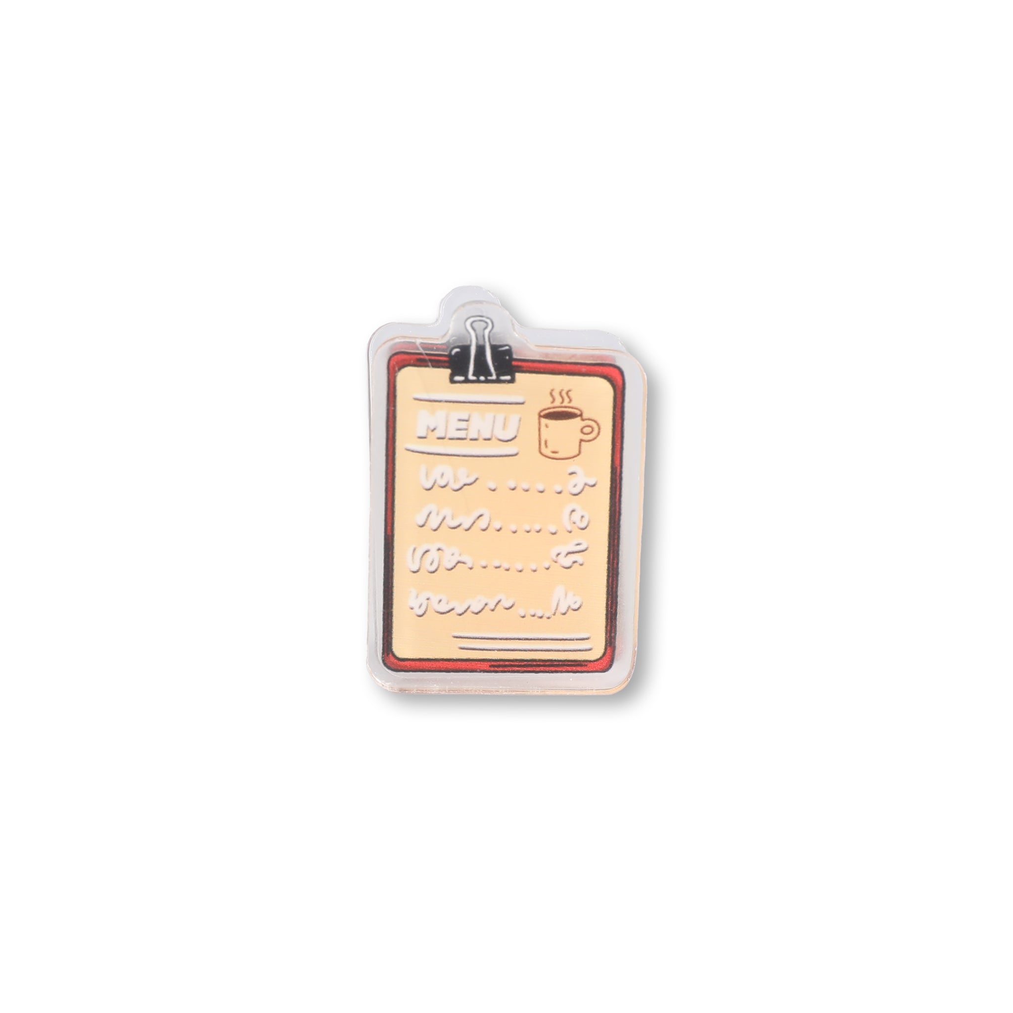 | Materials | Clear, glossy plastic (likely acrylic or PVC), printed “menu” design (matte finish), small black binder clip (metal or sturdy plastic) |