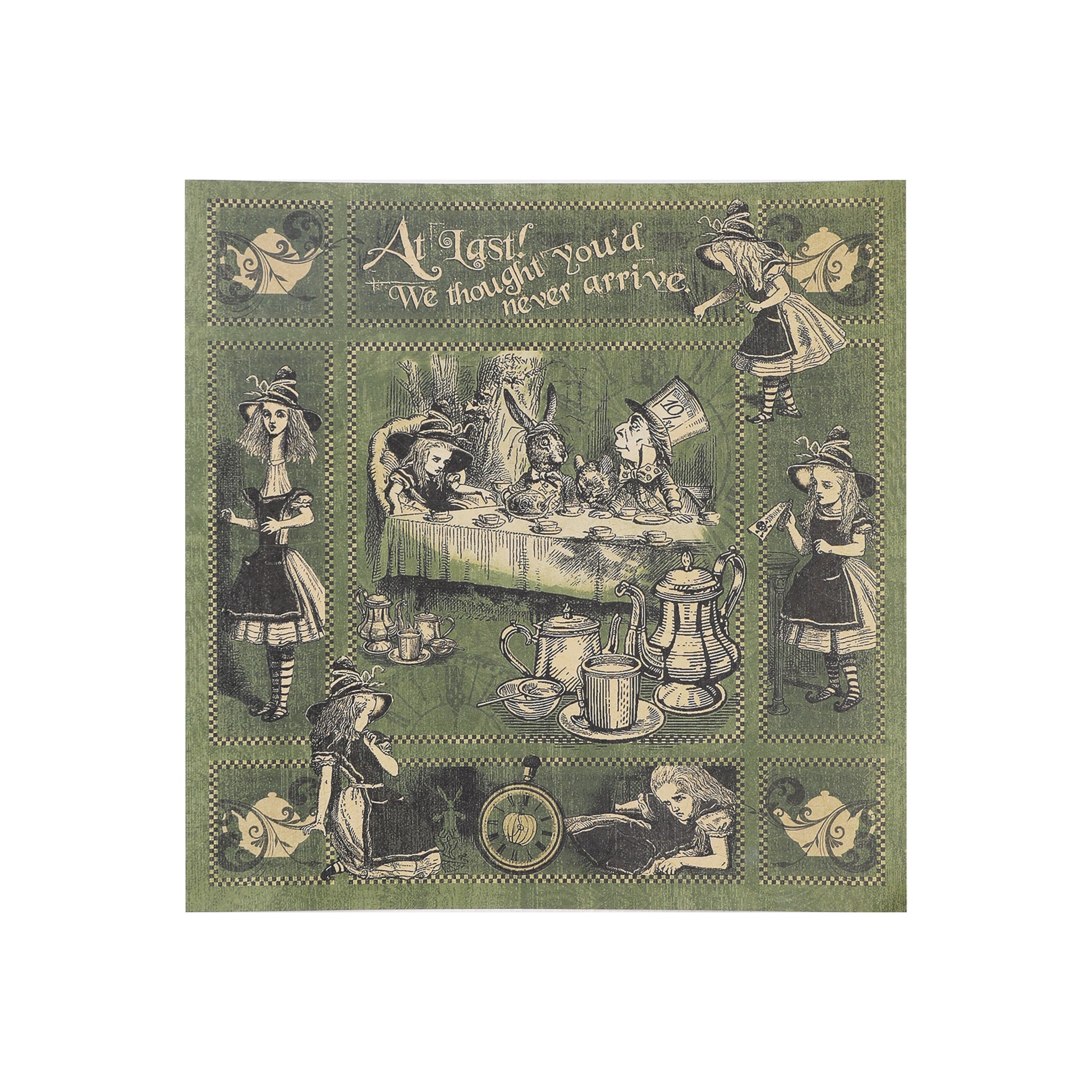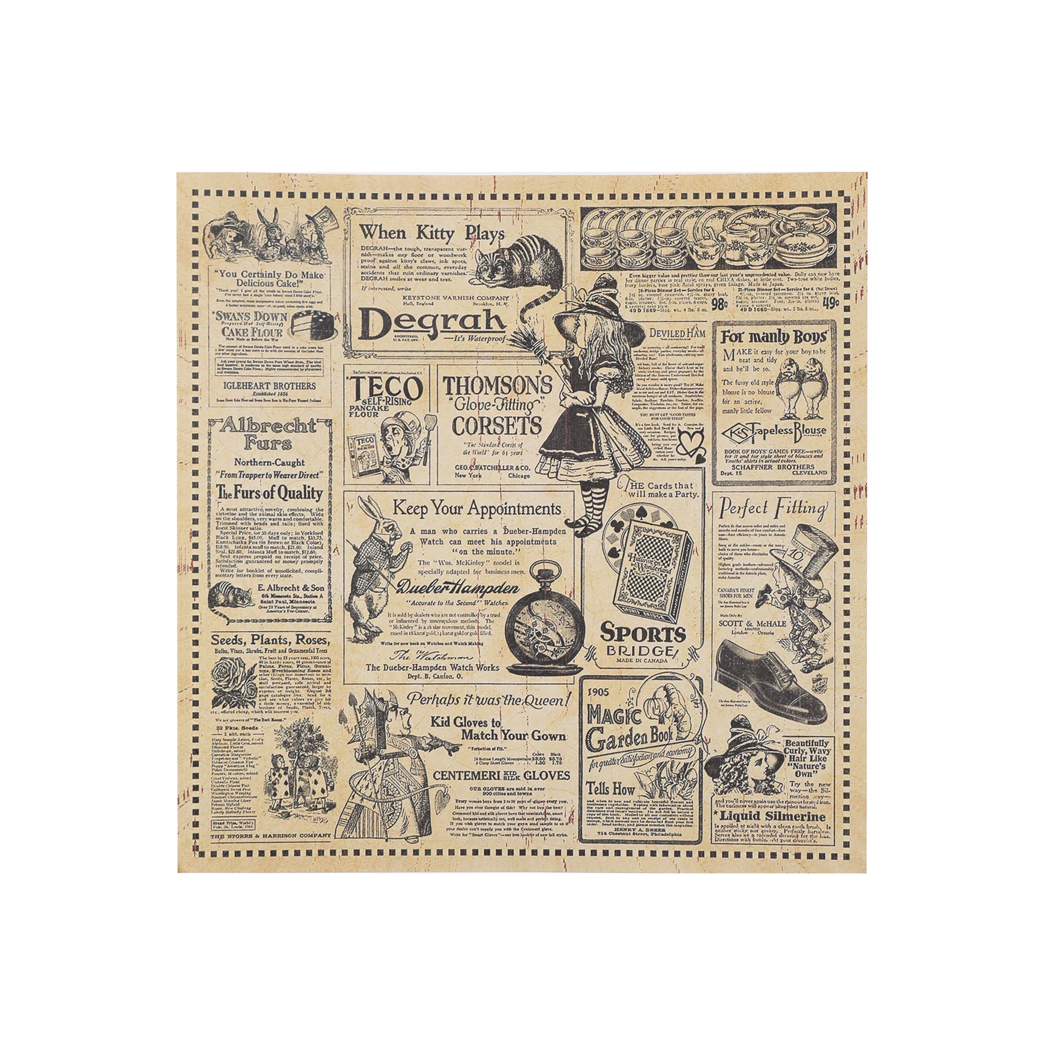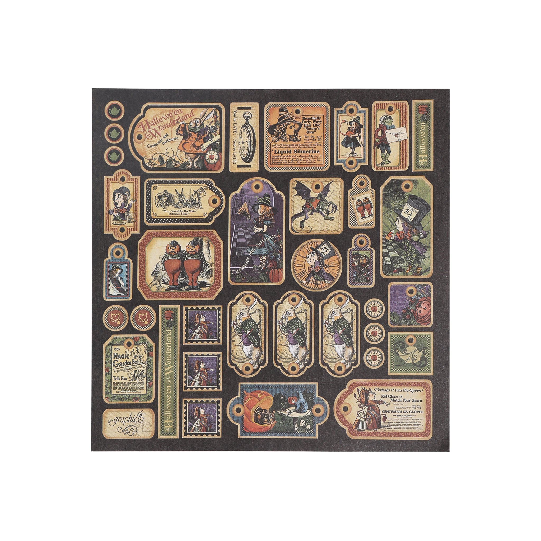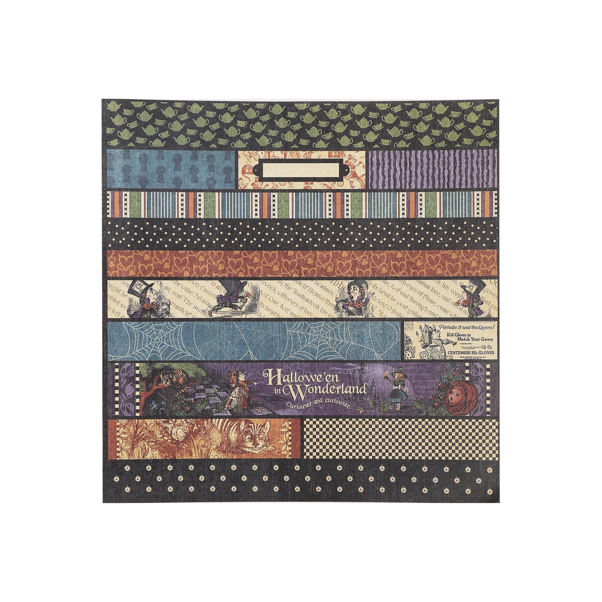 Each sheet measures 12×12 inches, the standard scrapbook size, providing ample space for your creative projects. With over 10 distinct designs per pad, you’ll have plenty of variety to work with. The thematic cohesion between the Halloween and Alice in Wonderland elements, combined with the vintage aesthetic of distressed edges, aged text, and retro print styles, gives the paper a nostalgic, antique feel.