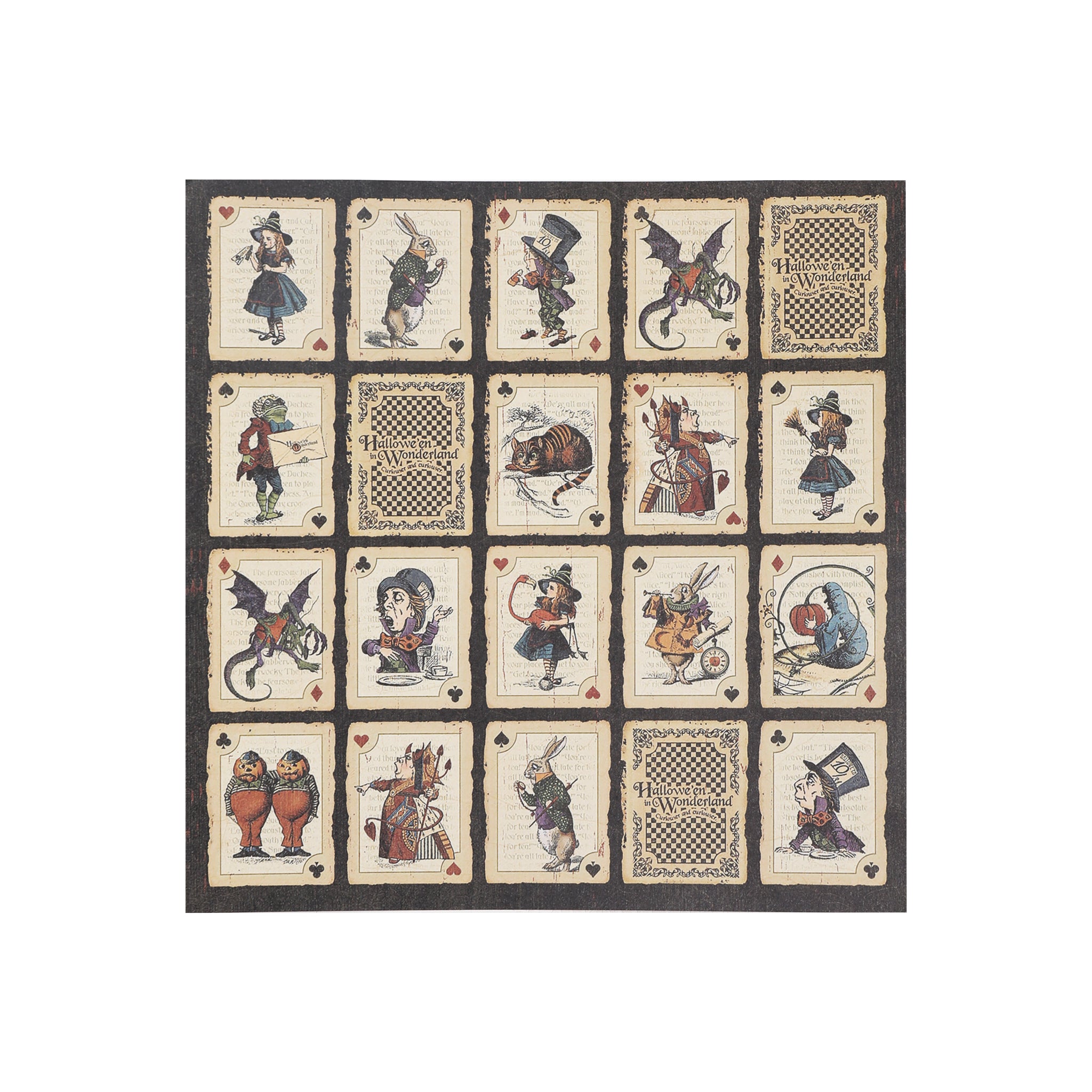 The color palette features rich autumnal tones such as deep purples, greens, blacks, warm oranges, browns, and reds, complemented by accents of teal, navy, and cream for a striking contrast. The designs are a delightful mix of whimsical characters like Alice, the Mad Hatter, Queen of Hearts, Cheshire Cat, White Rabbit, and pumpkin – headed figures, along with vintage ephemera such as newspaper – style ads, playing cards, and old – timey text.