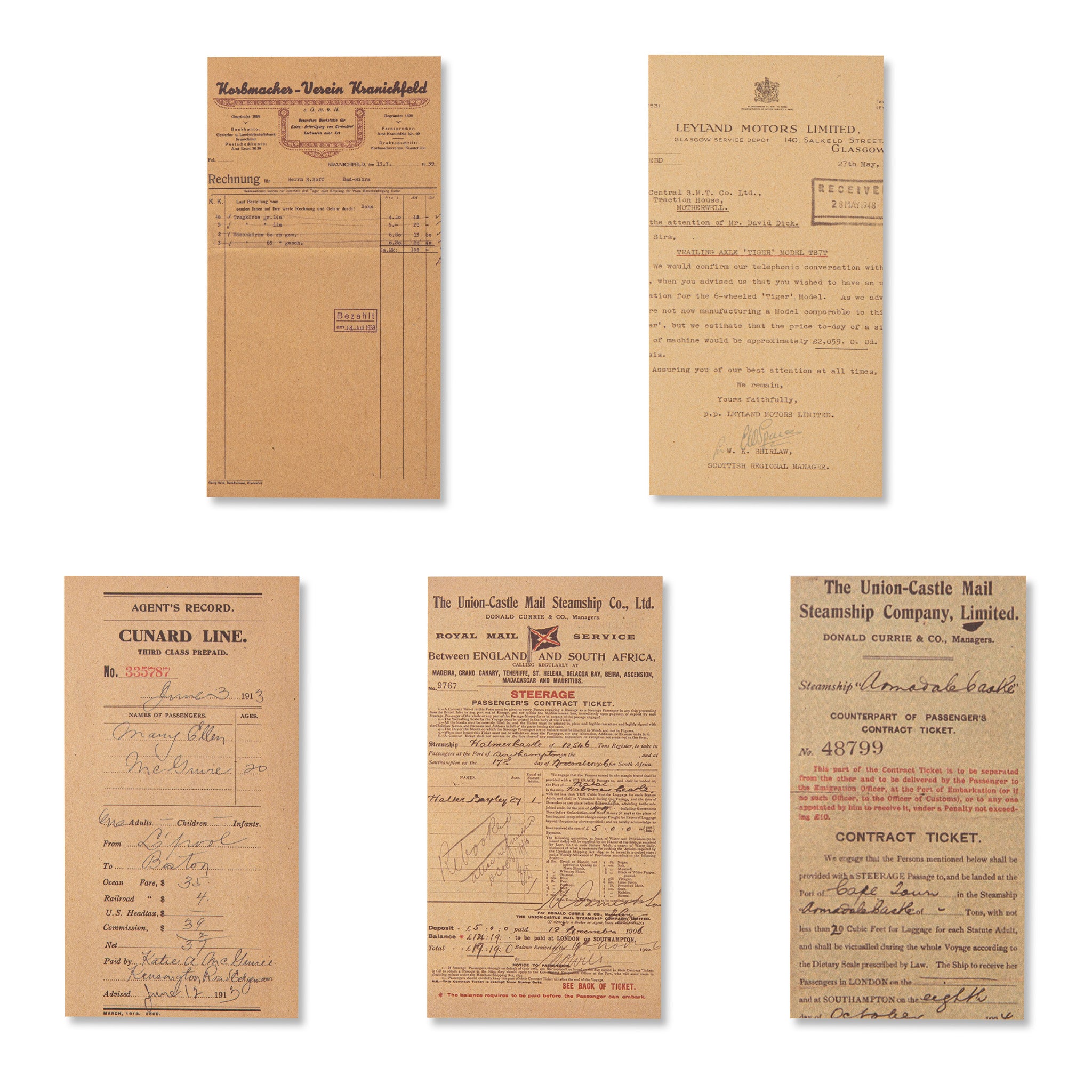 Dominated by earthy browns from the kraft cover and faded off – whites from the pages, the product evokes the look of aged paper. It features vintage receipts, invoices, and tickets from historical companies like Cunard Line, Leyland Motors, and Union – Castle Mail Steamship Co. The text and ink are printed in black/red, with detailed entries including dates, signatures, company logos, and financial details. The cover is branded with “ANTIQUE BOOKSTORE” and Chinese characters (“票单记事”), emphasizing its vintage business – document theme.