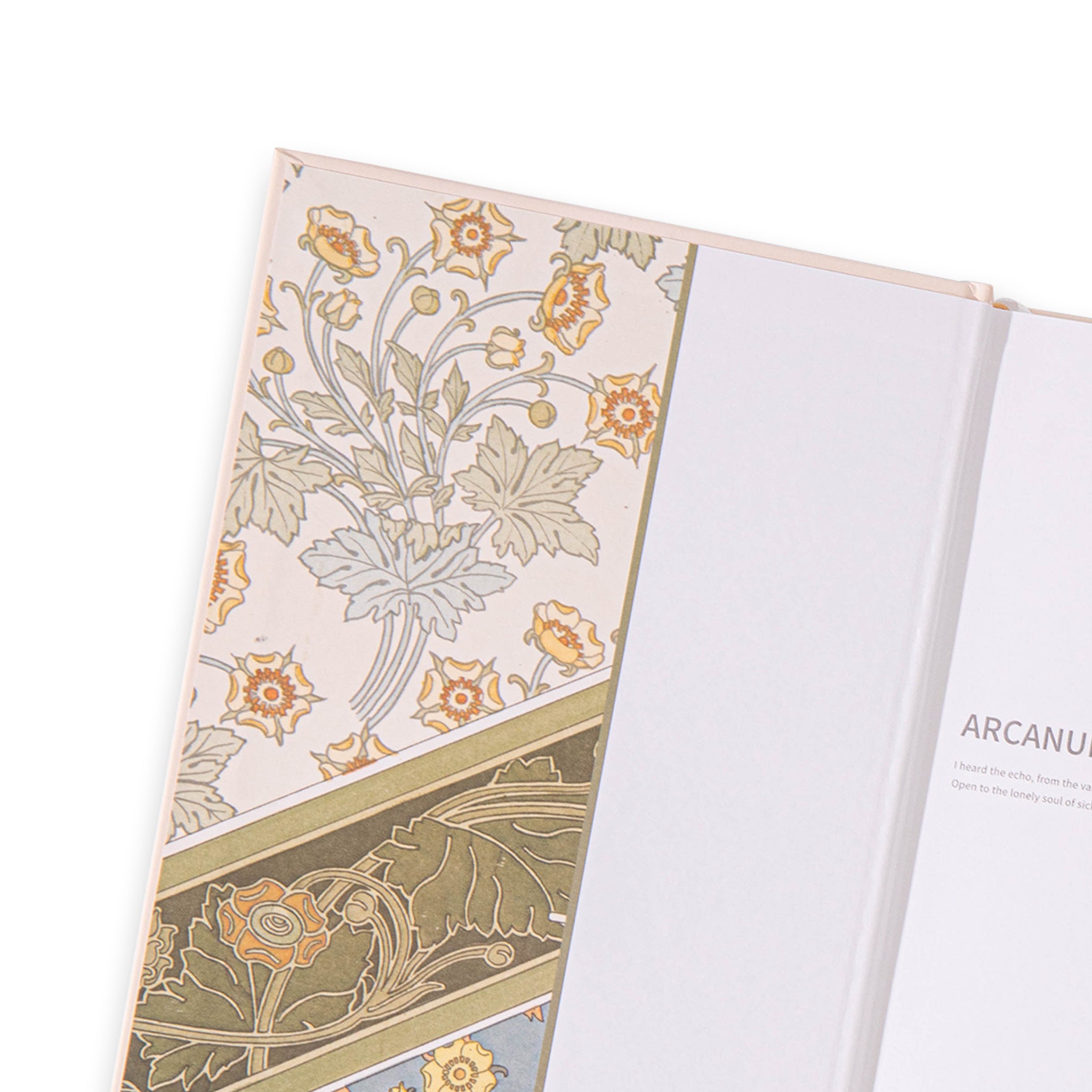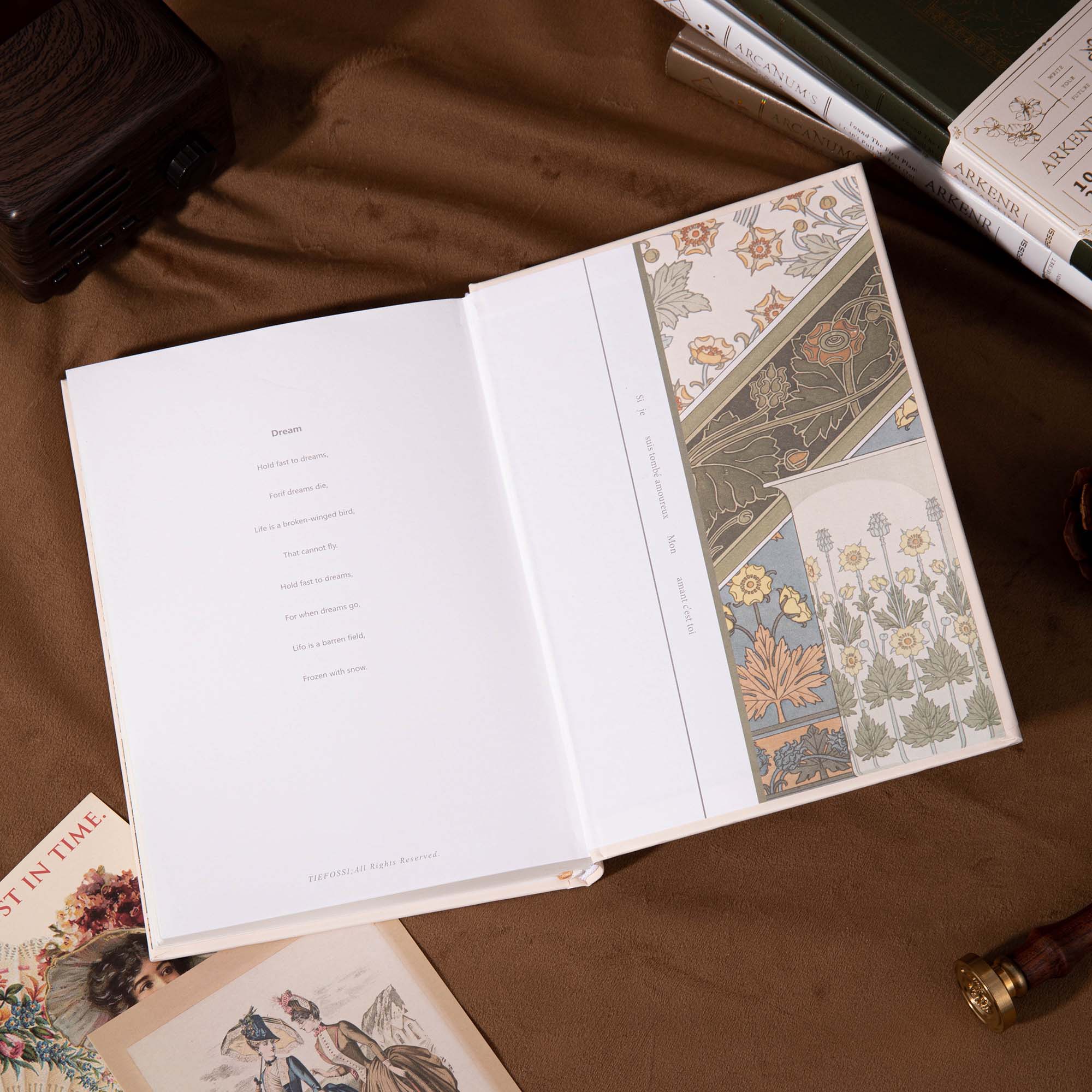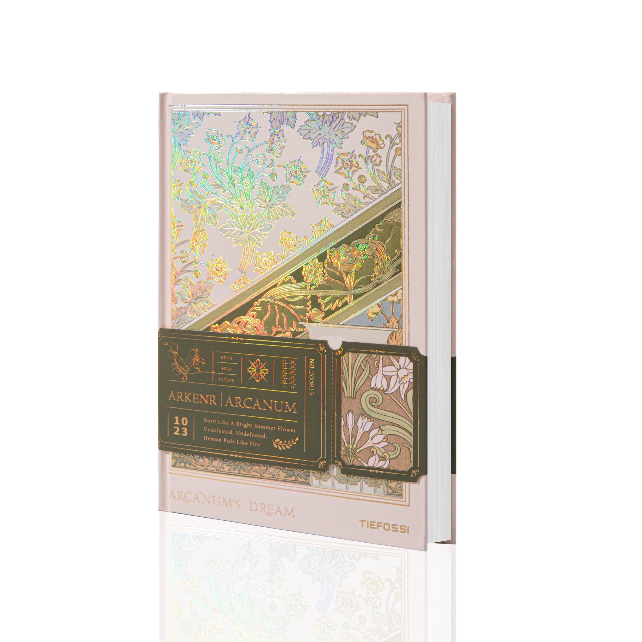 - Cover Design: Hardcover with iridescent, holographic gold foil and Art Nouveau – inspired floral patterns