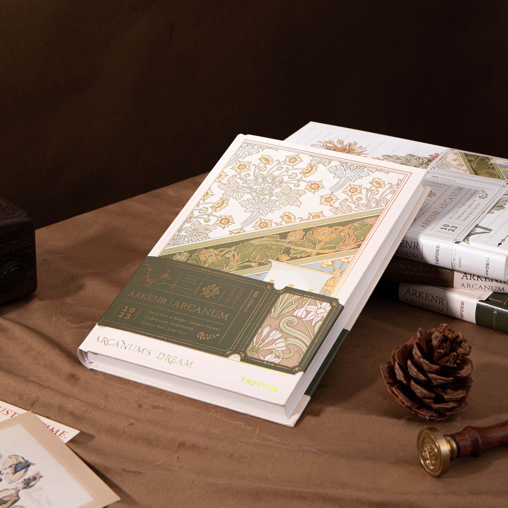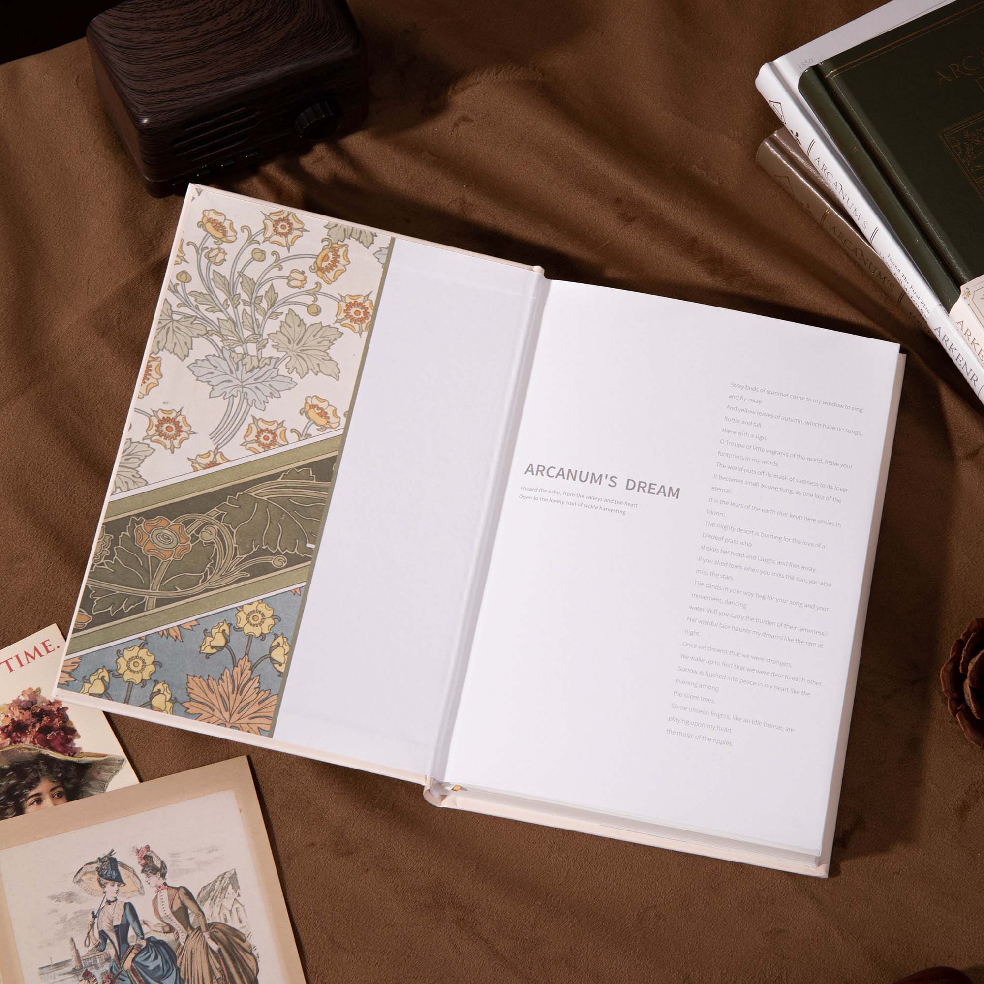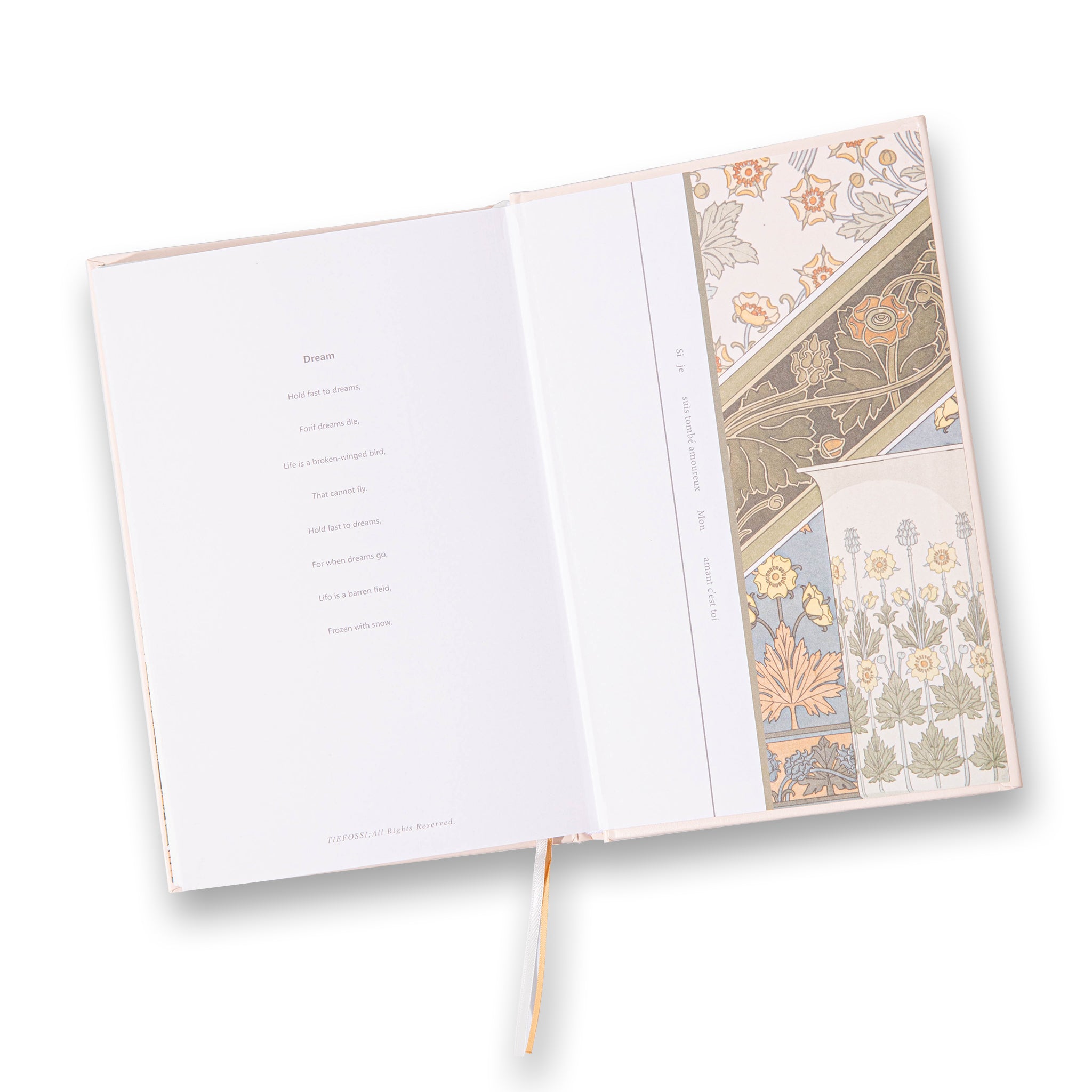 - Cover Design: Hardcover with iridescent, holographic gold foil and Art Nouveau – inspired floral patterns