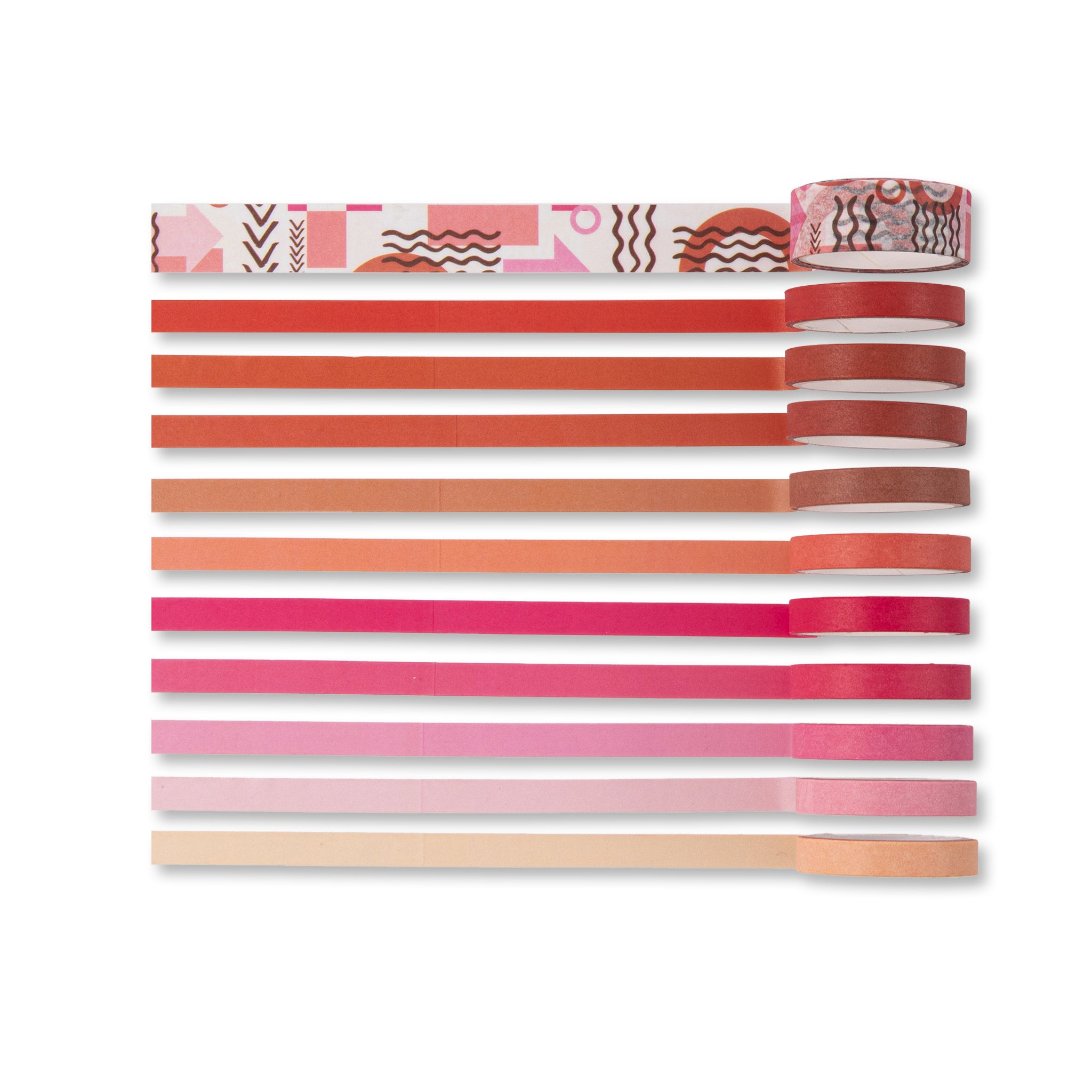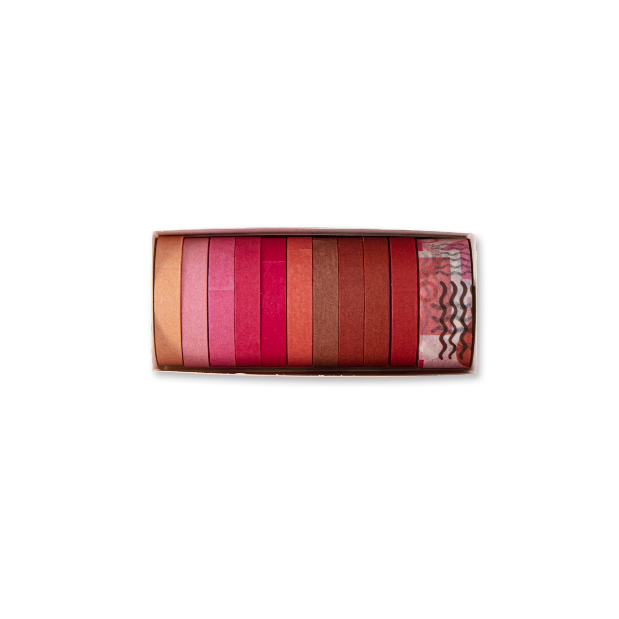 - Colors: A cohesive range of warm, earthy hues in the pink – to – red – orange spectrum, including light peach, pale pink, vibrant magenta, deep red, terracotta, and burnt orange, with one patterned roll featuring pink, red, and brown geometric/wavy designs
