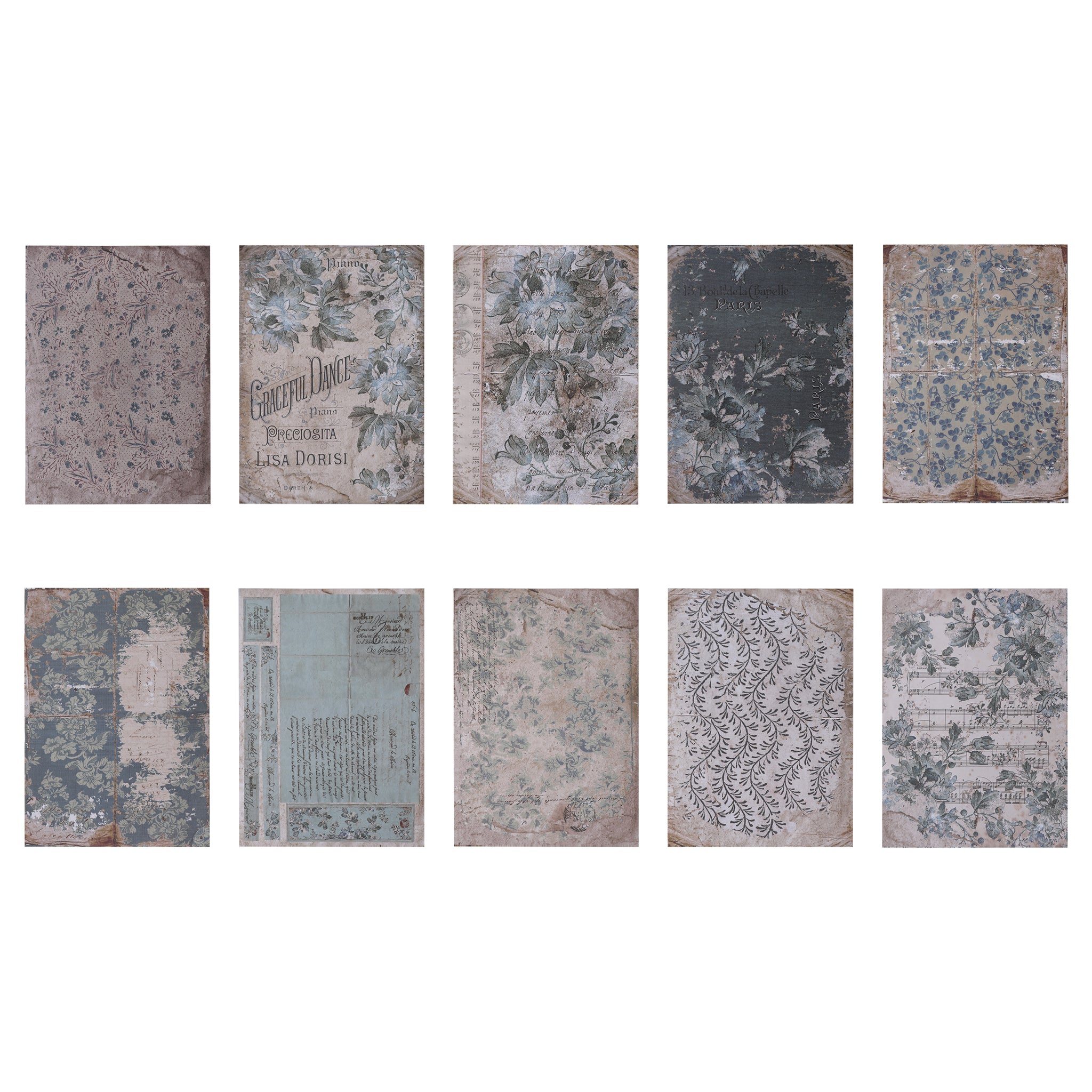 The sheets are crafted from a likely textured or linen – blend paper, featuring a worn, distressed finish that mimics aged parchment or antique wallpaper. The muted, vintage color palette includes shades of blue (from light turquoise to deep indigo), gray, beige, and soft browns, evoking the look of faded, aged textiles or papers with subtle patina and worn edges.