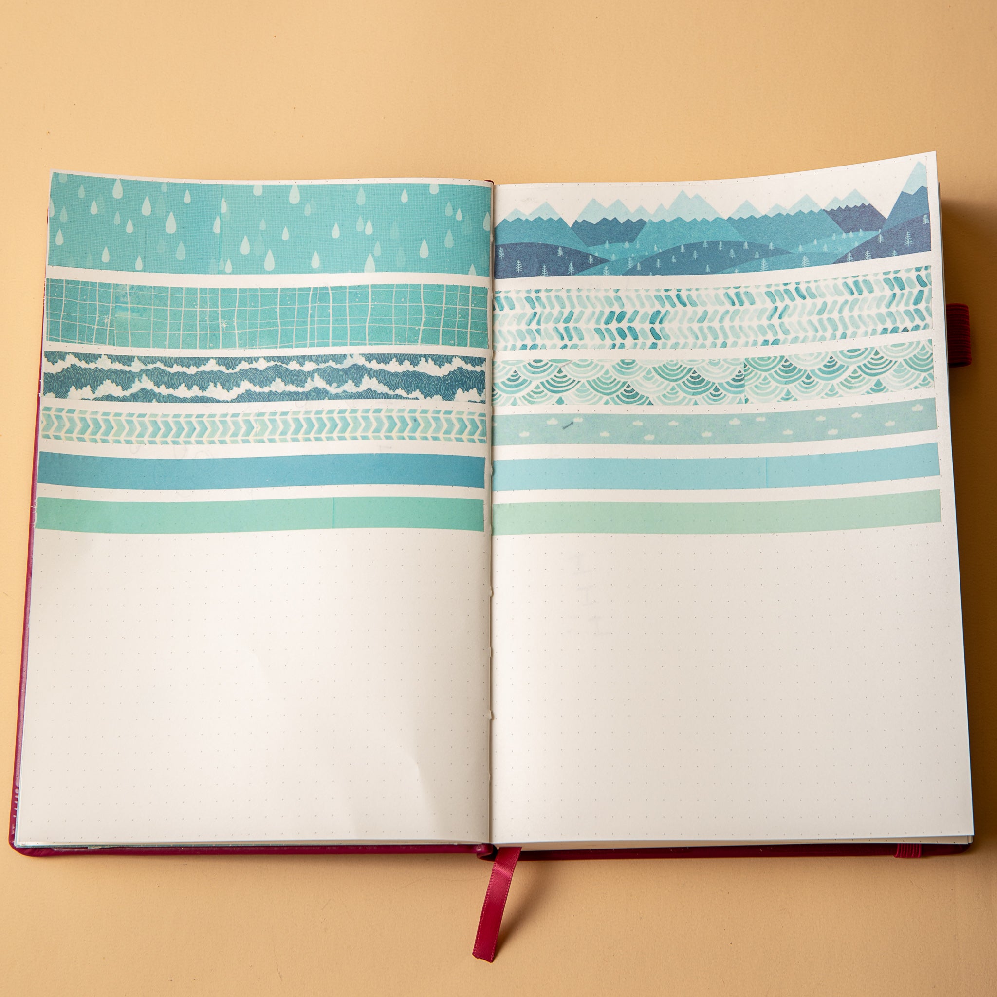 - Colors: Dominantly cool, varying shades of blue (teal, turquoise, sky blue) with white accents and a warm, light beige background