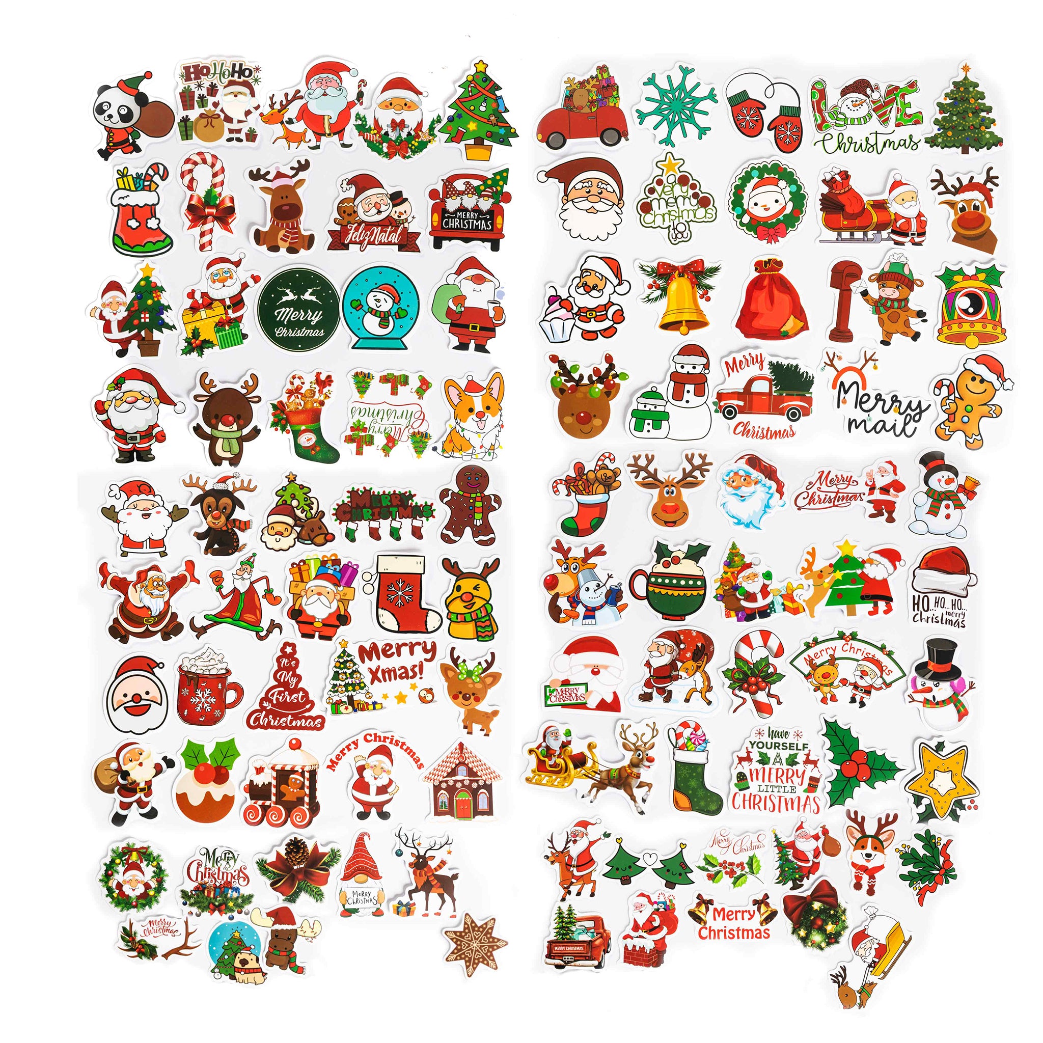 The color palette is a vibrant explosion of traditional Christmas hues, including red, green, blue, yellow, pink, white, and gold. The designs are a visual treat, featuring a wide range of characters such as snowmen, Santa Claus, reindeer, elves, polar bears, teddy bears, gingerbread men, and a penguin. Alongside these are classic Christmas motifs like Christmas trees, candy canes, wreaths, bells, gift boxes, snowflakes, stockings, and holiday houses.