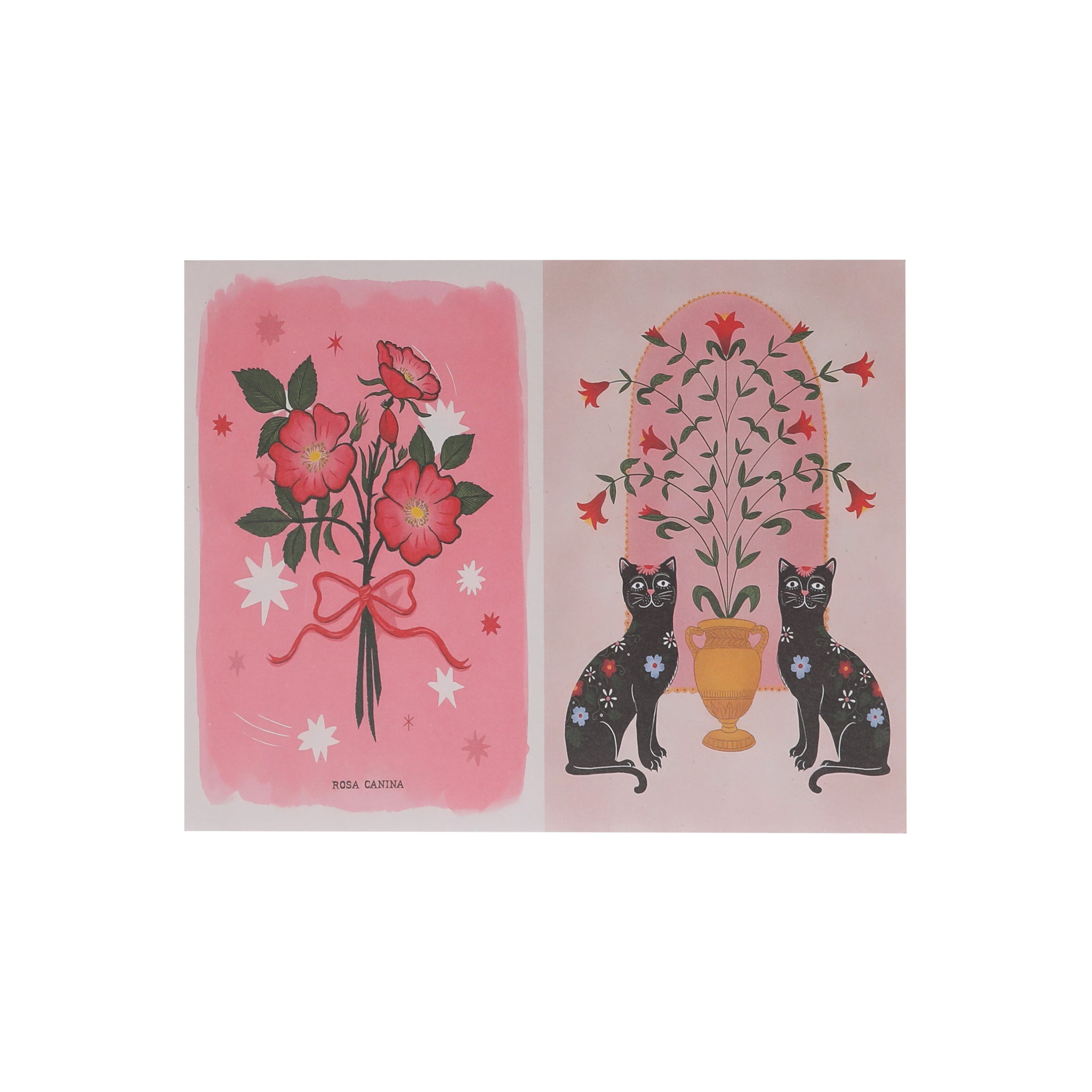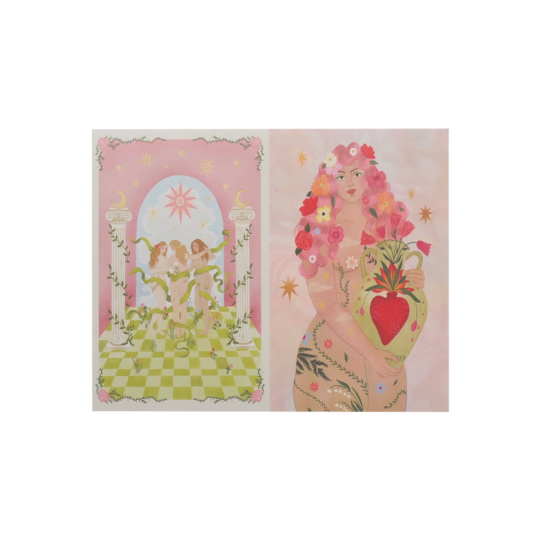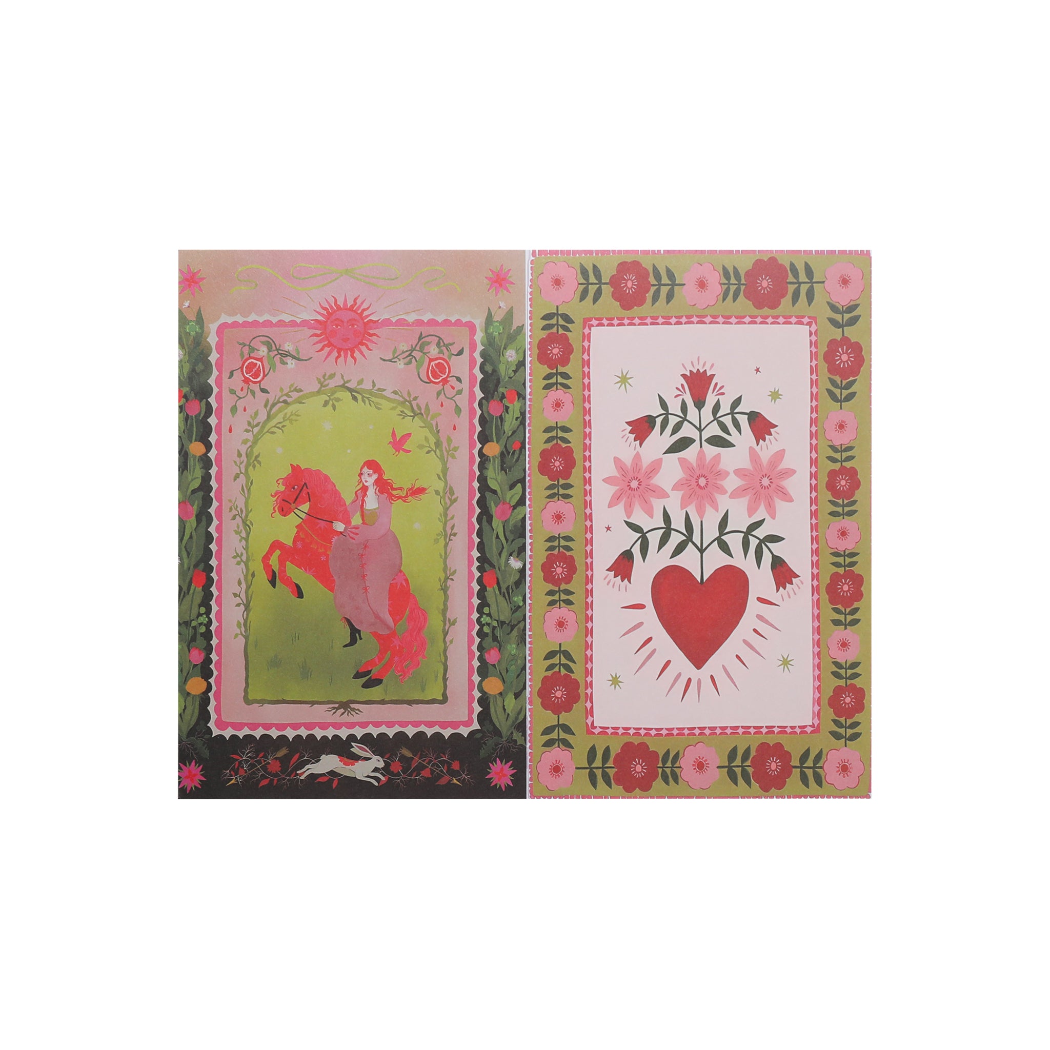 Each card is double – sided, with two distinct but thematically linked illustrations. The decorative borders, featuring ornate flowers, chains, stars, and ribbons, add a vintage and bohemian charm. The small size of the individual cards (≈2.5–4 inches wide when unfolded, forming a compact double – page spread of ≈5–8 inches total when open) makes them perfect for various uses. You can frame them as wall art for a bohemian or spiritual decor style, use them in journals, scrapbooks, or bullet journals for visual inspiration, give them as greeting cards for special occasions like Valentine’s Day or birthdays, or even use them as a portable oracle deck.
